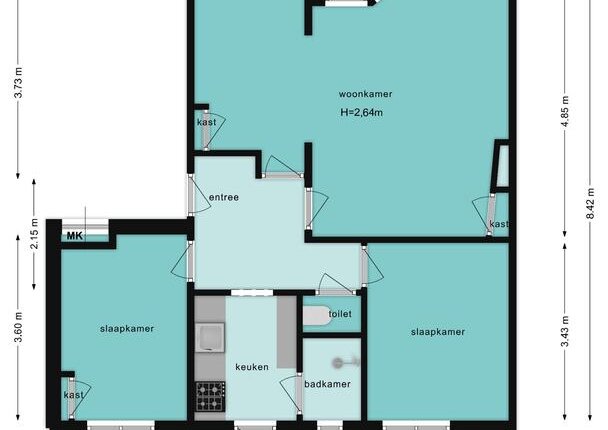 Het appartement heeft een klein balkon aan de voorzijde en aan de achterzijde over de gehele breedte van het appartement.