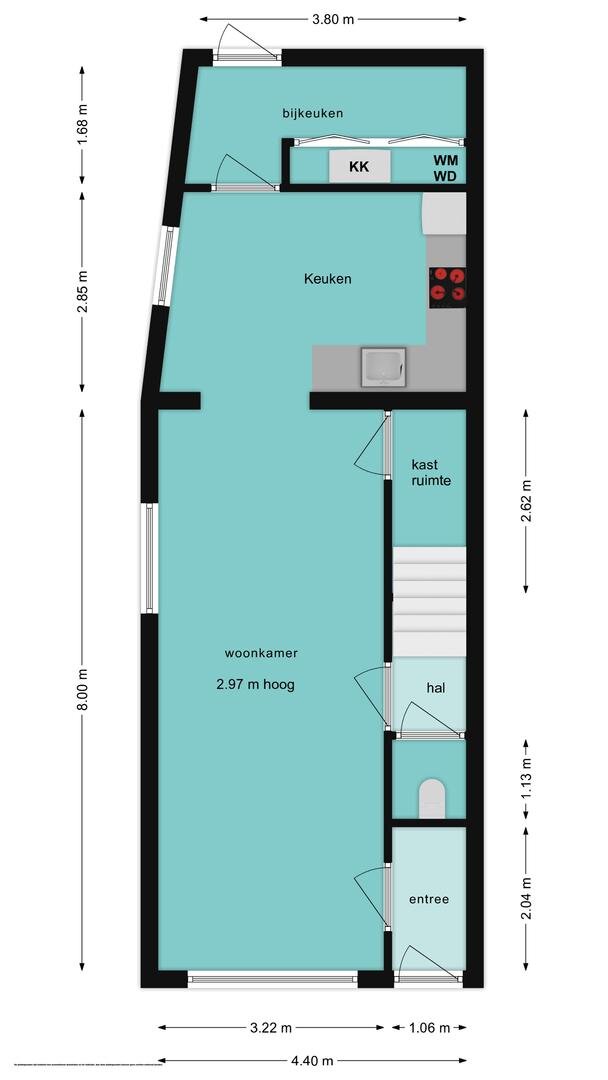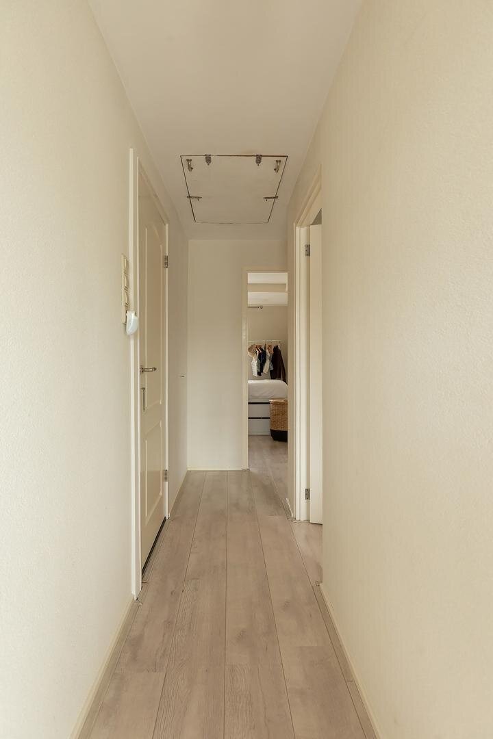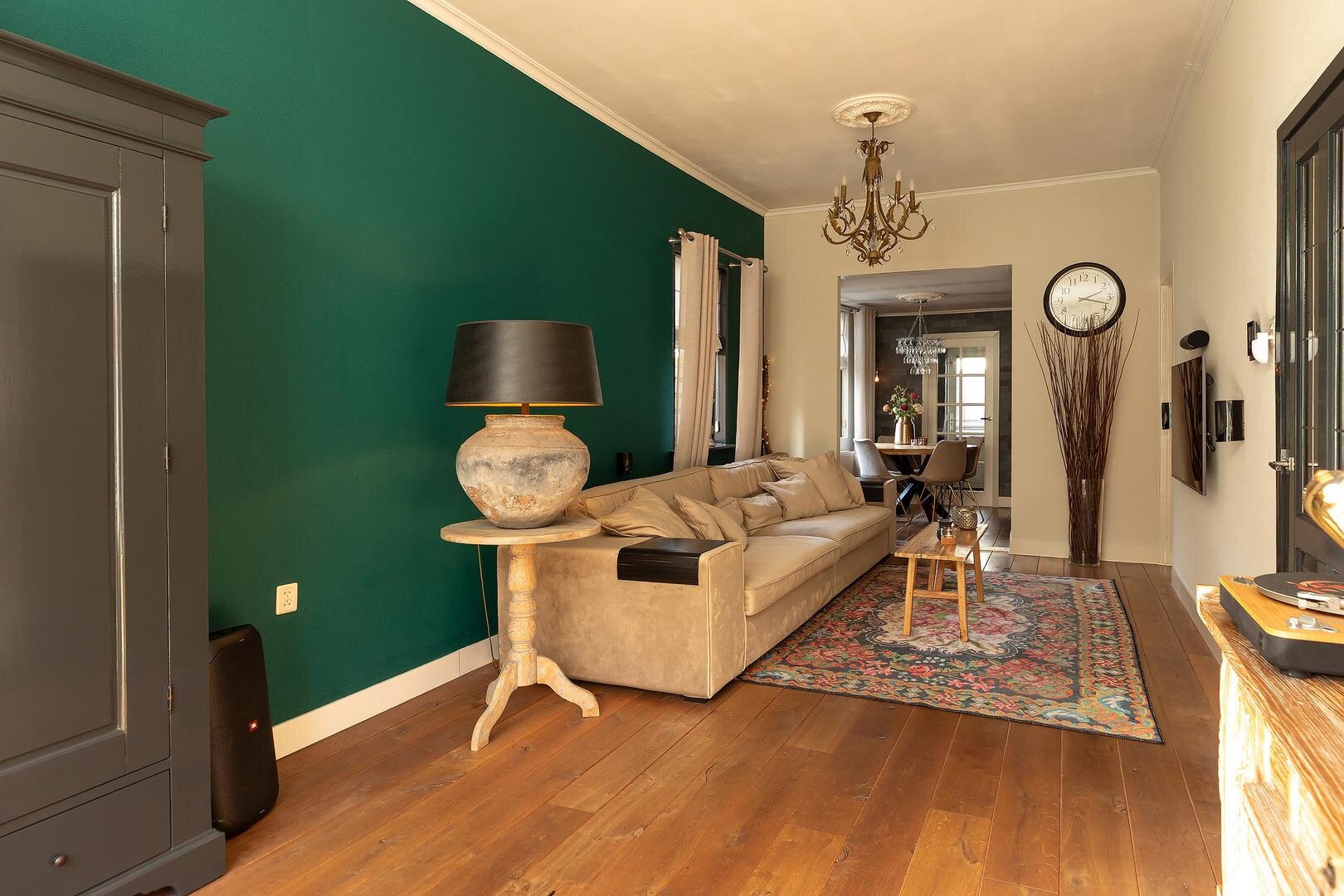Via de hal kom je in de lichte woonkamer met grote ramen, hoge plafonds en een nette houten vloer. De indeling biedt ruimte voor een comfortabele zithoek aan de voorzijde en een eethoek aan de tuinzijde. De moderne keuken is recent vernieuwd en voorzien van moderne inbouwapparatuur. Via de keuken bereikt u de bijkeuken met wasmachine-/droger aansluiting. De trap en toilet zijn bereikbaar via een tussenhal vanuit de woonkamer.