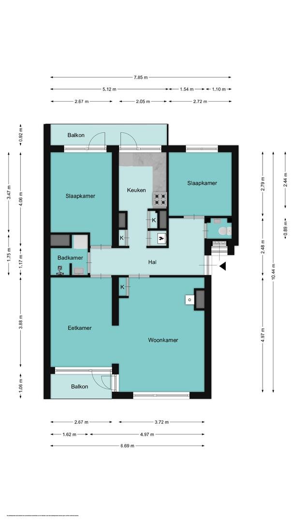 Entree, hal met garderobe en modern toilet met wastafeltje. Aan de voorzijde van het appartement ligt de ruime woon-/eetkamer (voorheen 2 kamers) met toegang tot het balkon. Aan de achterzijde liggen de 2 slaapkamers. Eén ruime slaapkamer met doorgang naar het balkon en een tweede slaapkamer.