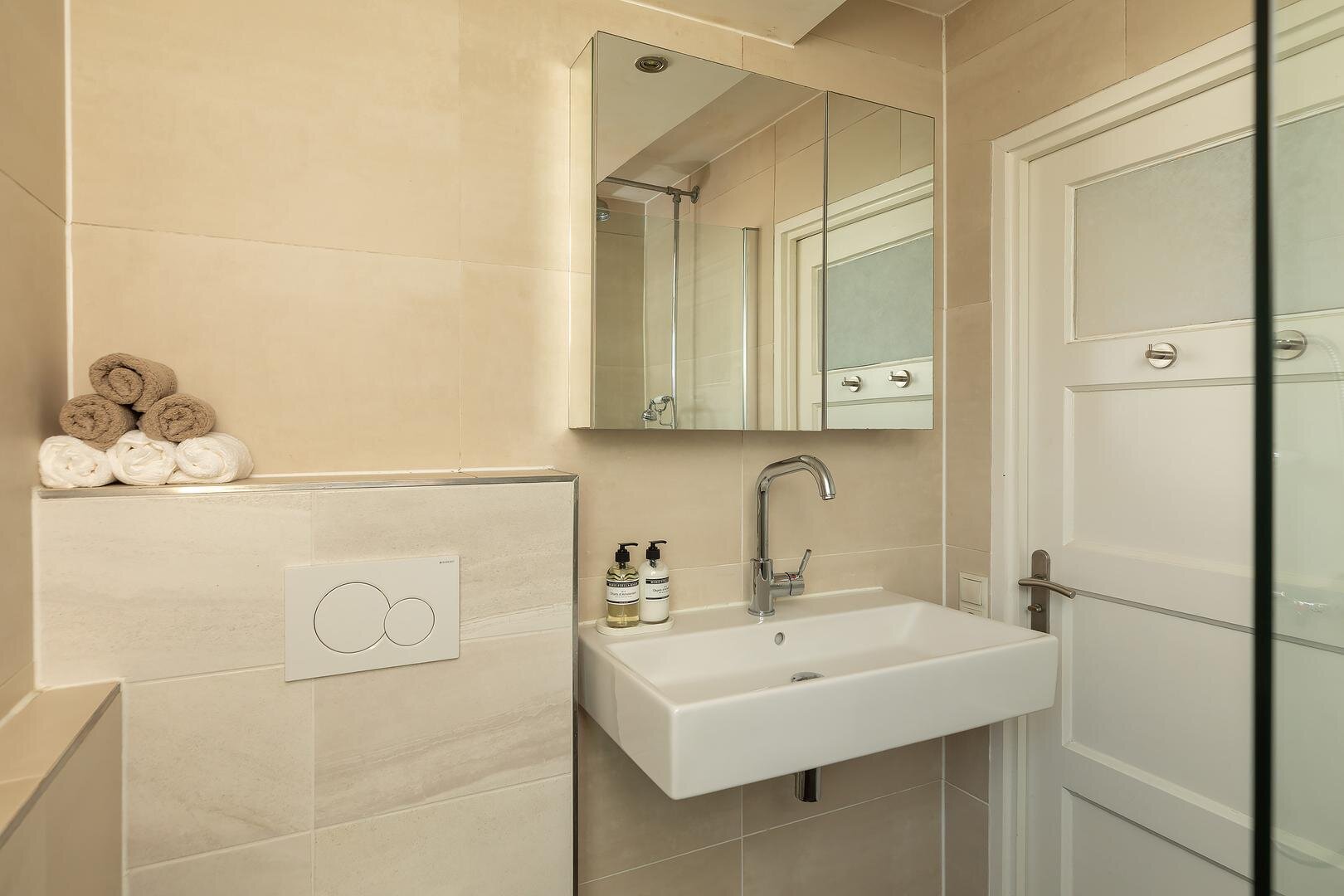 Overloop met toegang tot twee slaapkamers, geschikt als hoofdslaapkamer en bijvoorbeeld een werk-, kinder- of logeerkamer. De badkamer is voorzien van een douche, toilet en wastafelmeubel en is praktisch en sfeervol ingericht. De gehele eerste verdieping is voorzien van dubbel glas.
