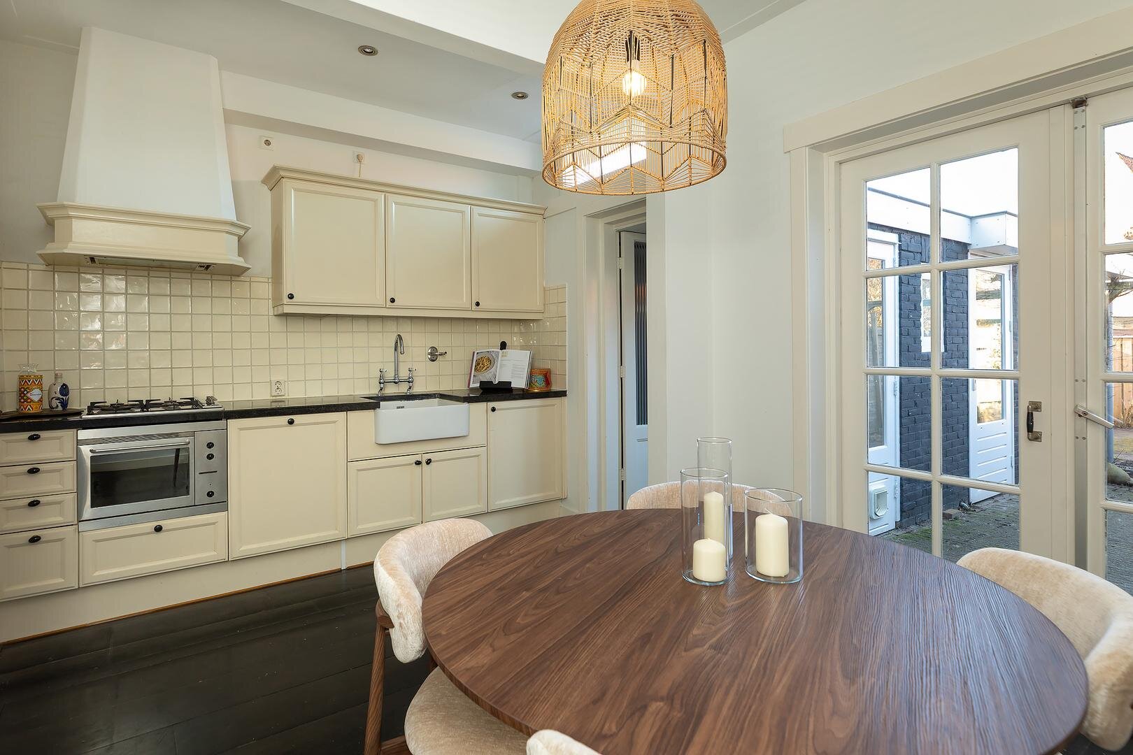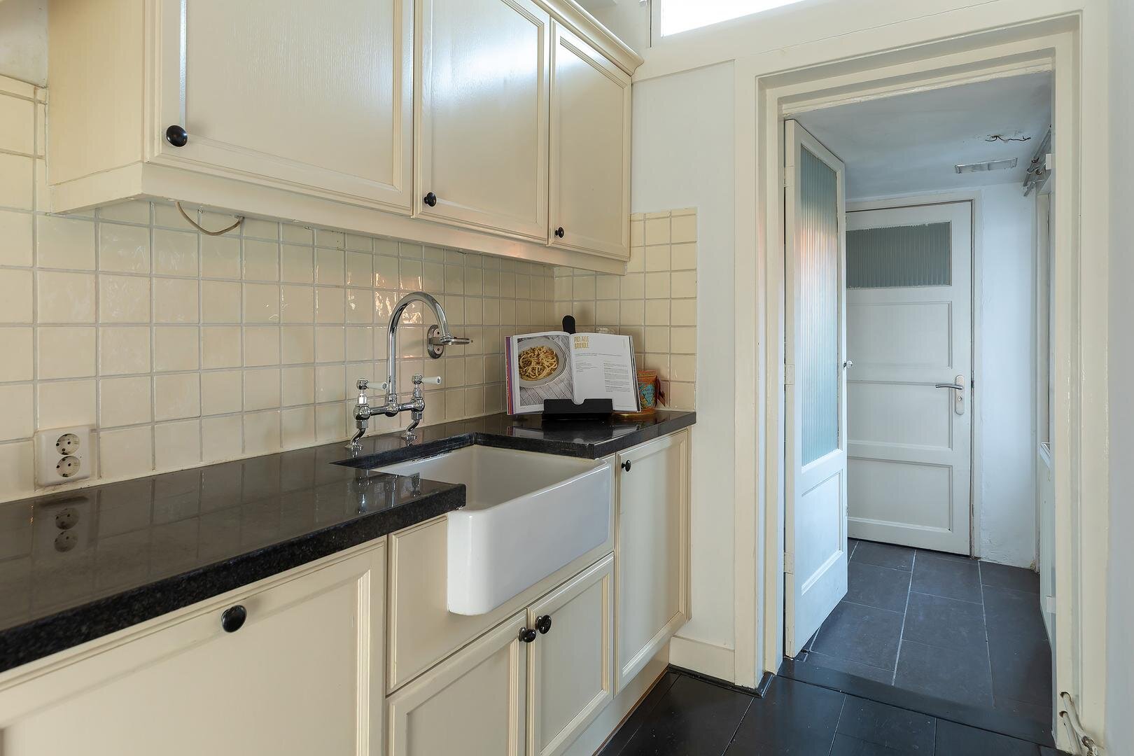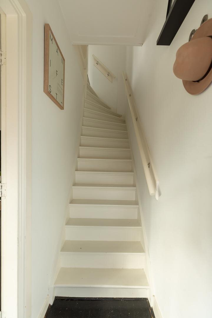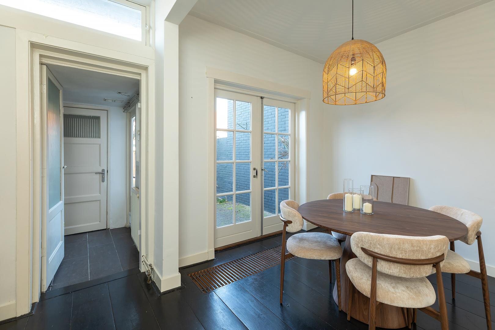 Entree met hal en trapopgang. Vanuit hier bereik je de lichte woonkamer met open keuken, hoge plafonds en authentieke elementen die zorgen voor een aangename sfeer. De openslaande deuren bieden toegang tot de ruime achtertuin en zorgen voor een mooie verbinding tussen binnen en buiten. Onder de trap bevindt zich een praktische bergkast met daarin ook de vernieuwde meterkast. Achter de keuken ligt een bijkeuken met aansluitingen voor wasmachine en droger en toegang tot het toilet. De woning beschikt over een diepe voortuin én een heerlijke achtertuin met volop ruimte om te ontspannen of groen aan te brengen. Groot pluspunt: aan het huis vast bevindt zich een bijgebouw/tuinkamer, ideaal als kantoor, hobbyruimte of extra kamer.
