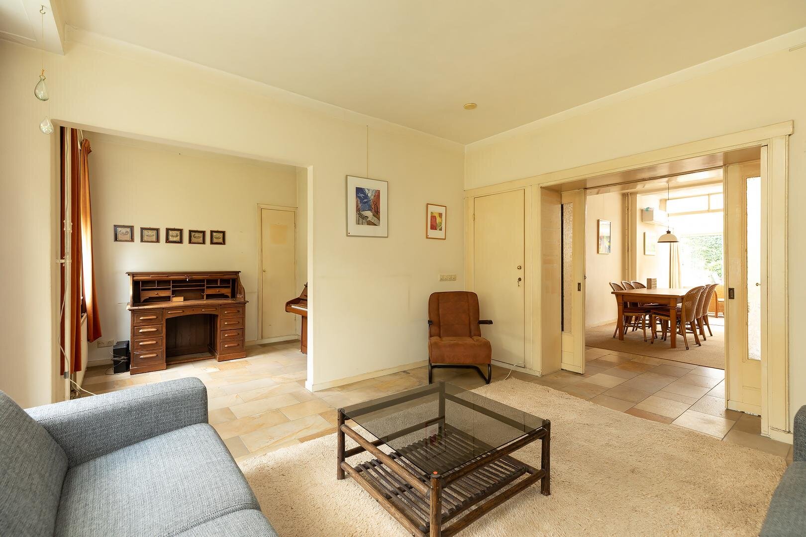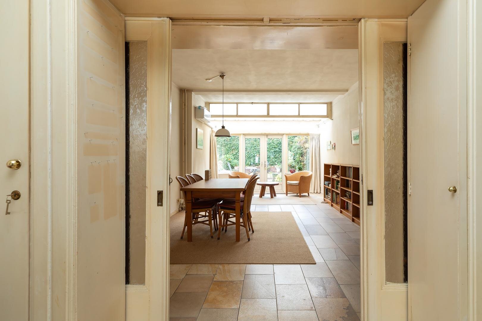 Entree via de voordeur naar een vestibule, doorlopend naar de hal met trapopgang en toegang tot de kelder. De royale L-vormige woonkamer en suite met schuifdeuren is aan de achterzijde uitgebouwd en heeft grote raampartijen en openslaande deuren naar de zonnige tuin. Hierdoor is er een prachtige verbinding tussen binnen en buiten.