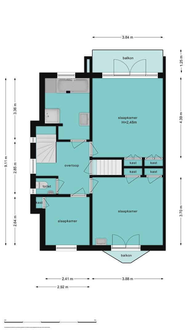 Overloop. Drie in grootte variërende slaapkamers, alle met inbouwkasten. Aan zowel de voorzijde als achterzijde bevindt zich een balkon, te bereiken via de slaapkamers. De badkamer is voorzien van een ligbad, separate douche en wastafel. Separaat toilet op de overloop.