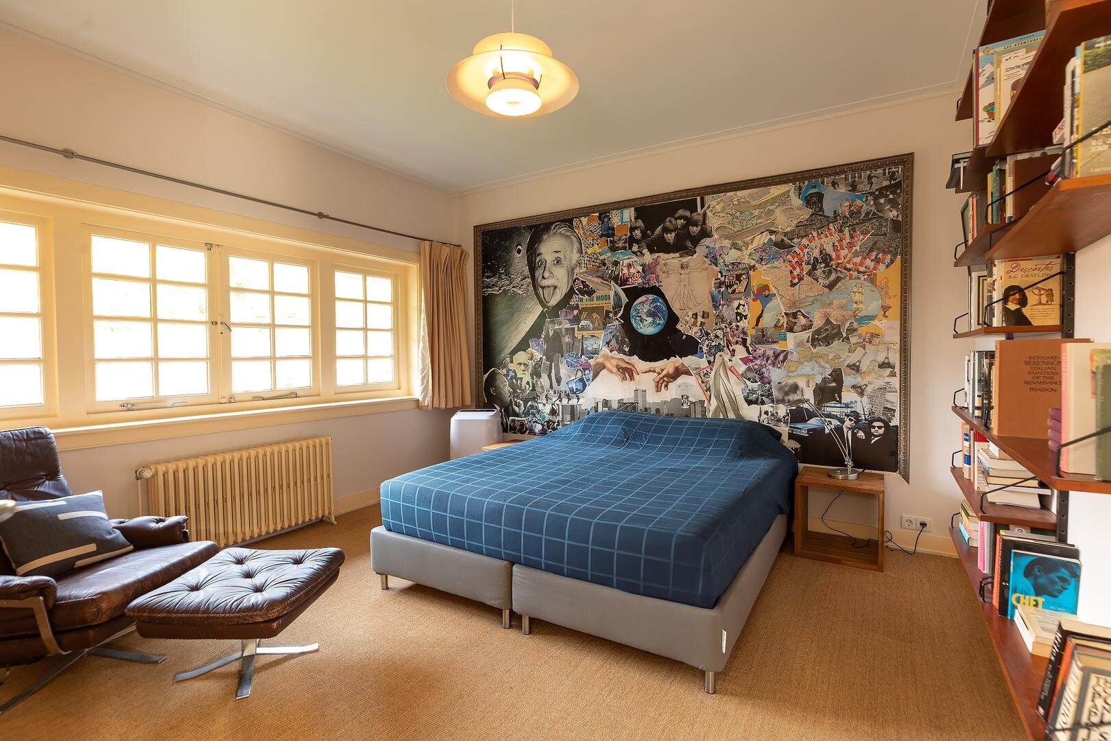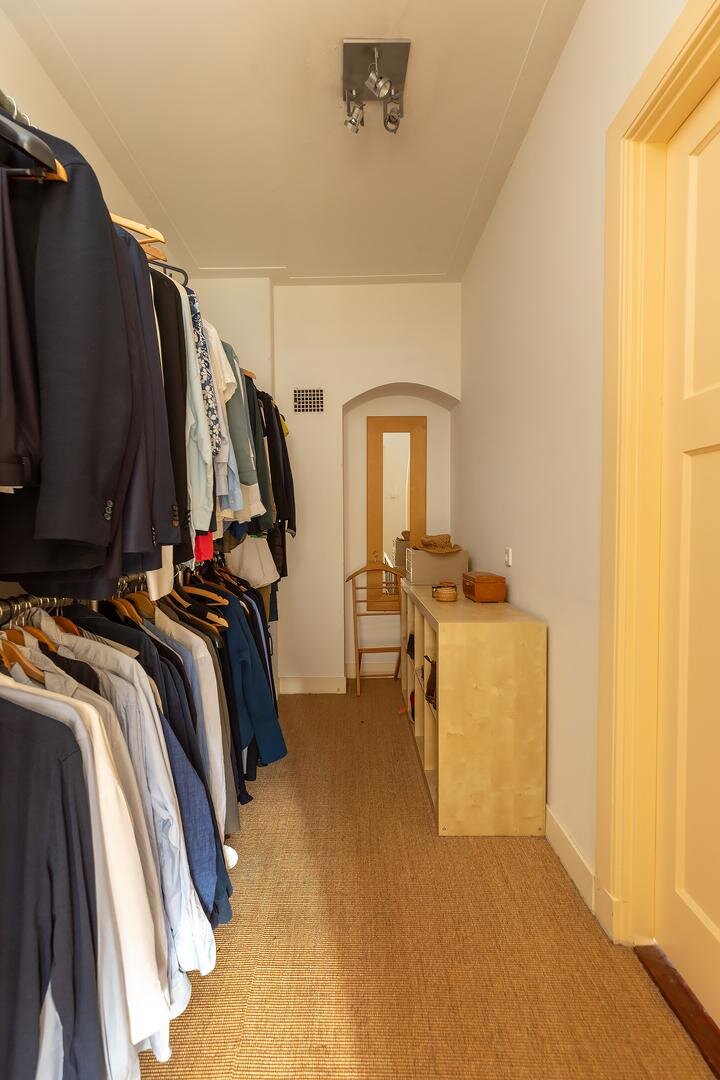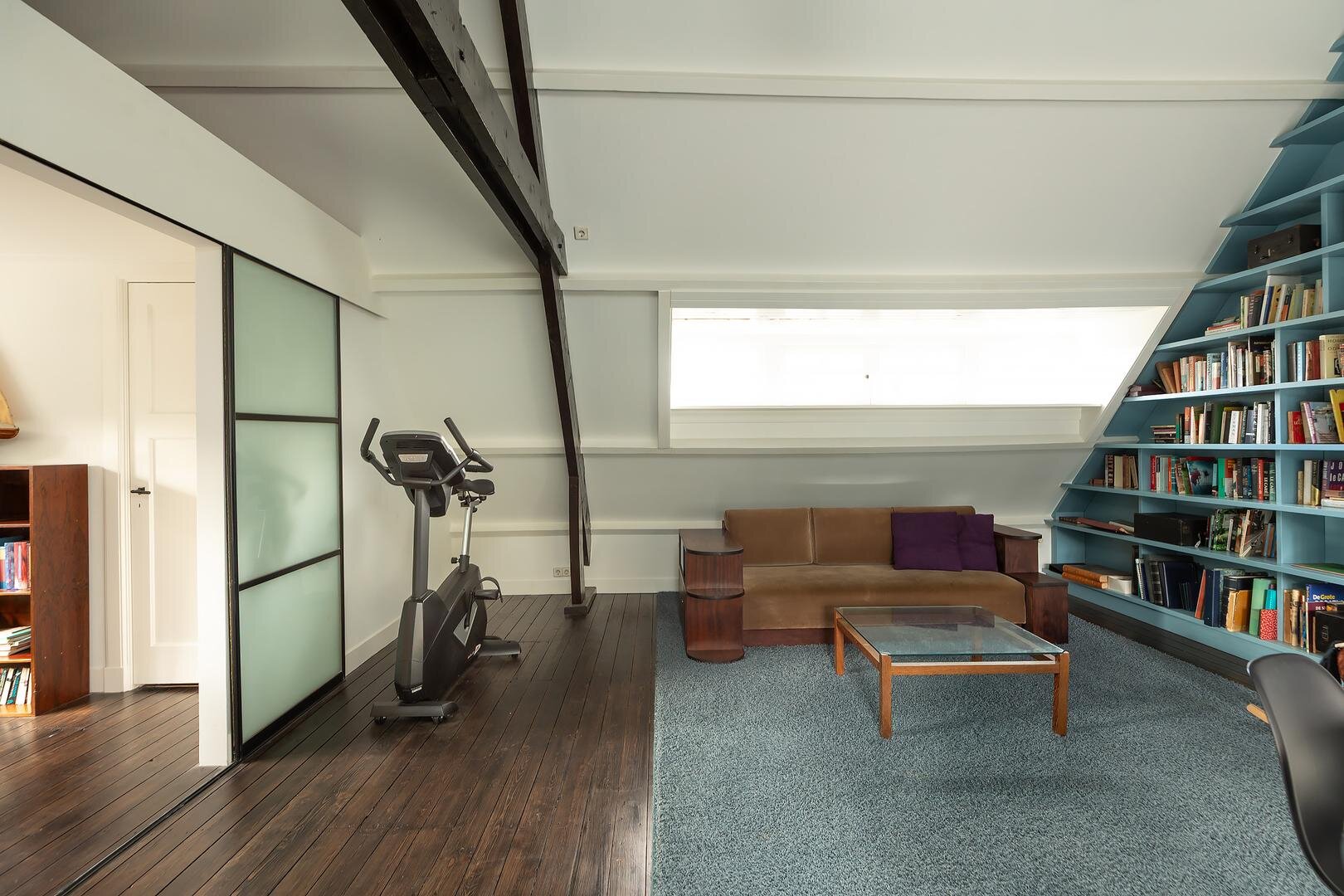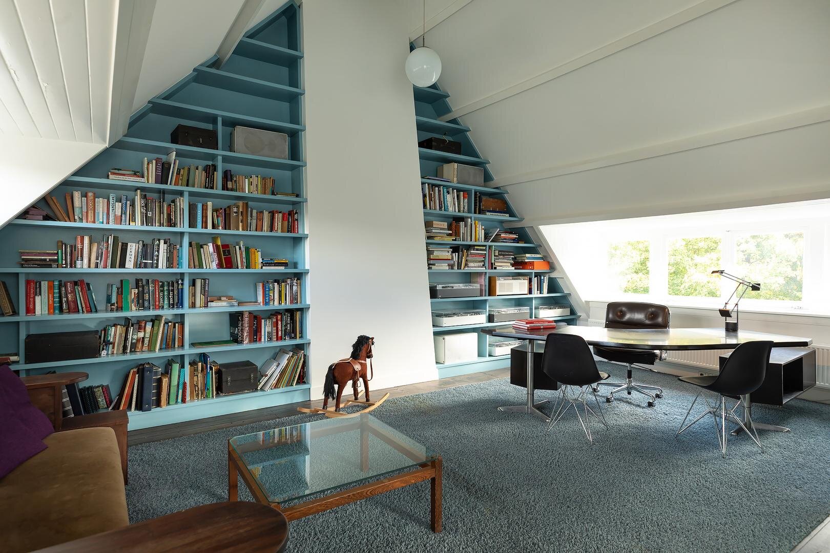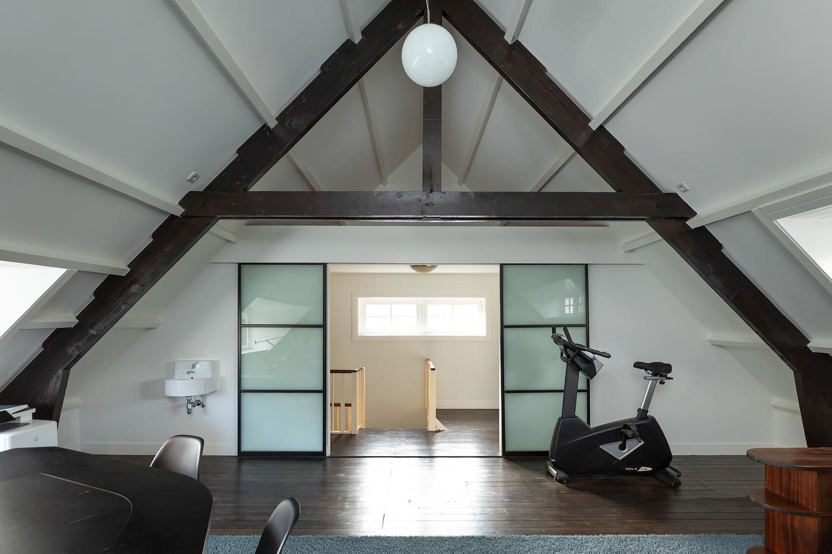 Aanloop middels de doorlopende voorname bordestrap, ruime hal/voorzolder die toegang biedt tot een afgesloten bergruimte en die via schuifdeuren toegang geeft tot de opmerkelijk volumineuze zolderetage met dakkapel aan de voor- en- achterzijde en een nokhoogte van maar liefst 4.30 m (!). De uitgestrekte open ruimte met licht inval van drie zijden is voorzien van nokhoge vaste boekenkasten en is thans in gebruik als bibliotheek en kantoor/werkruimte..