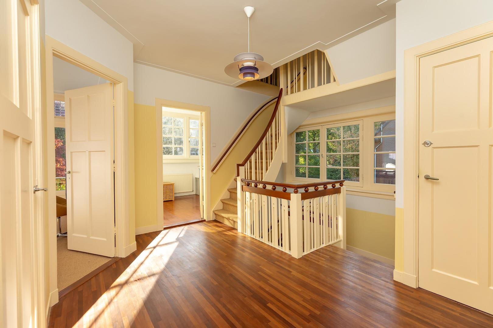 Aanloop middels fraaie bordestrap naar ruime, van parketvloer voorziene, overloop met toegang tot het separate toilet, de badkamer en alle slaapvertrekken; ouderslaapkamer met veel lichtinval, openslaande deuren naar het balkon en toegang tot de ruime “walk-in closet”, de 2e ruim bemeten slaapkamer aan de voorzijde met vaste kasten, 3e slaapkamer met vaste kasten en diepe bergruimte, lichte en ruime badkamer met hoge dakkapel en voorzien van een ligbad, separate douche, twee wastafels en grote plafond hoge vaste kast.