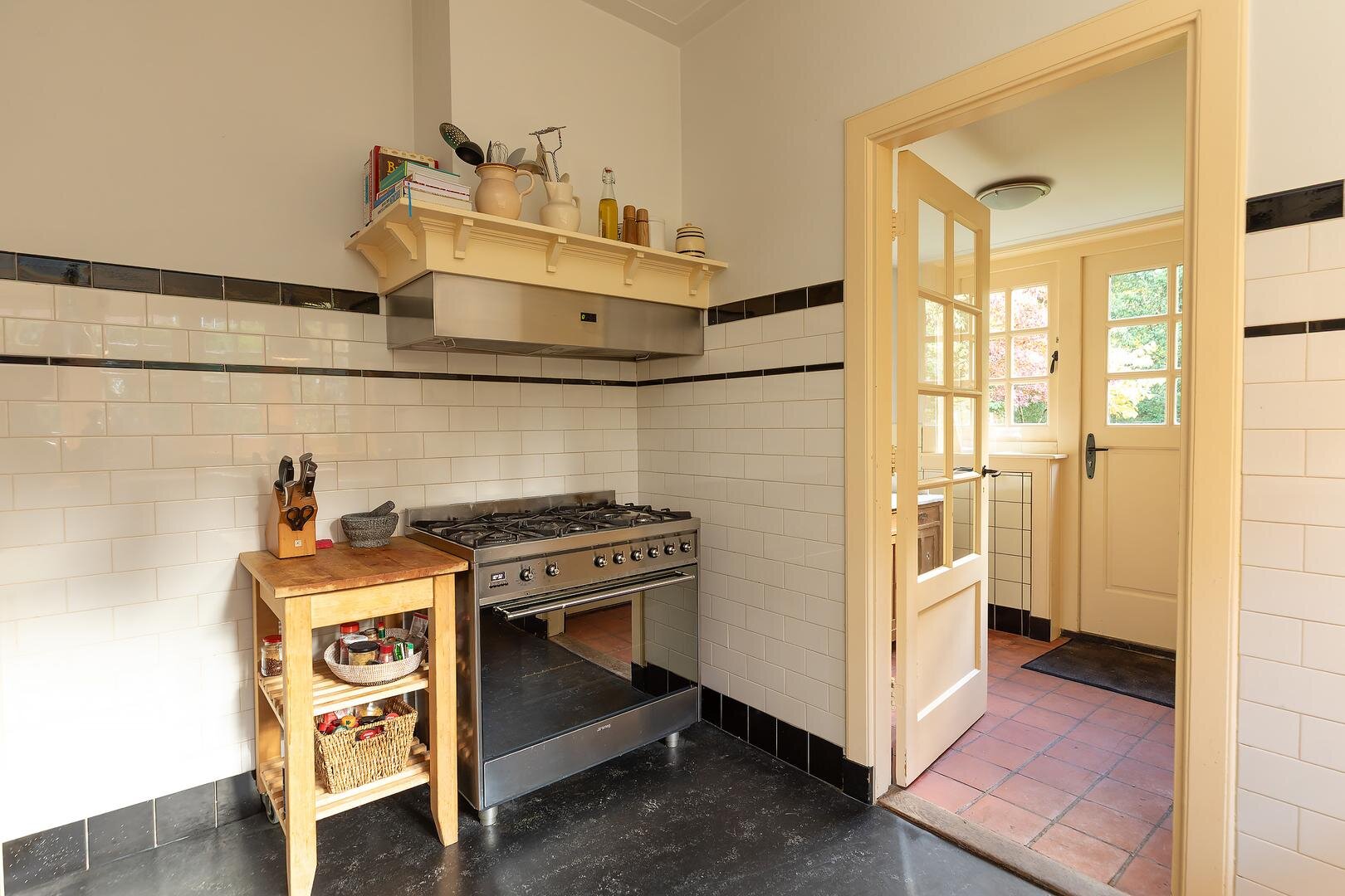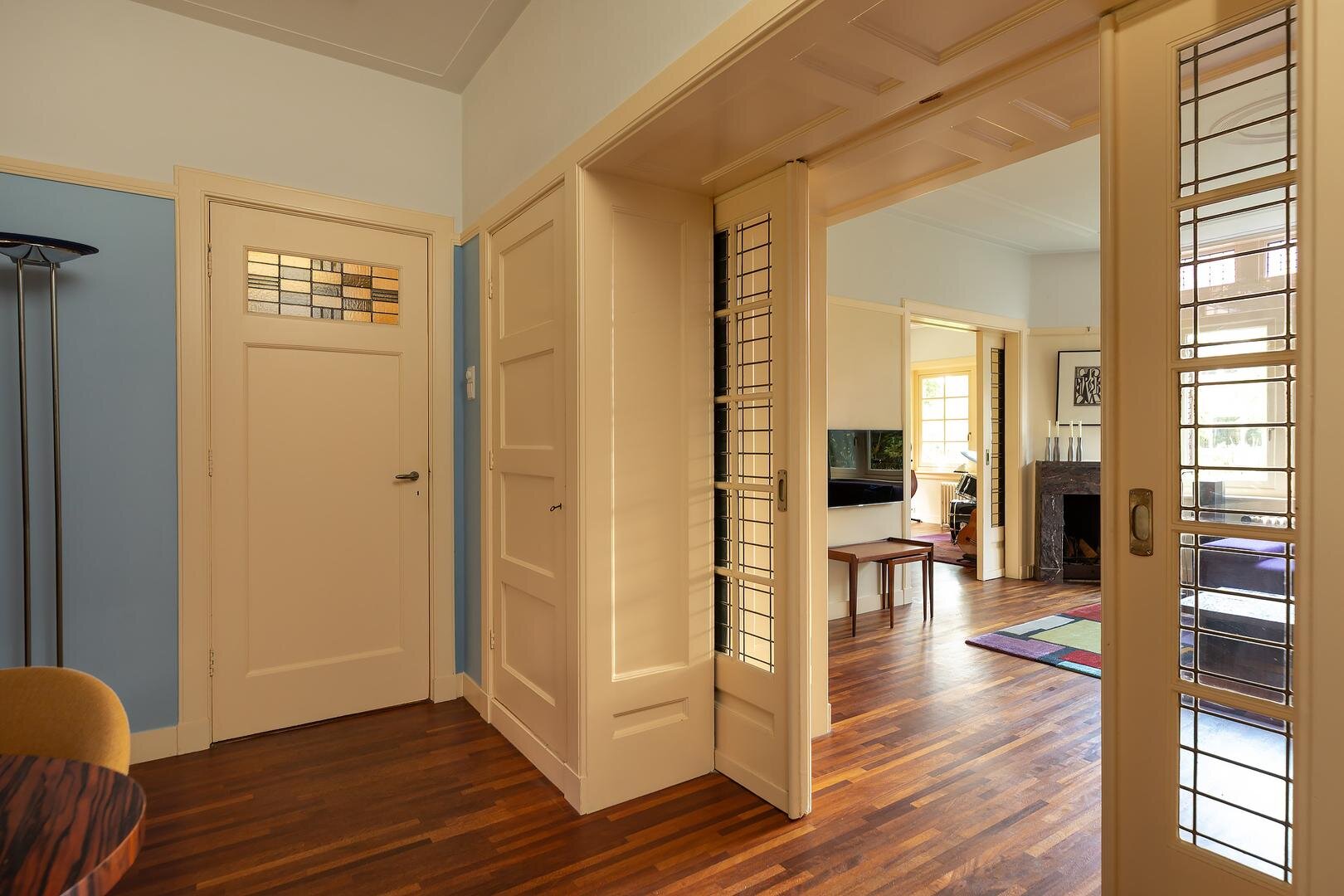 Entrée, vestibule met originele betegeling, garderobe en fraaie glas-in-lood tochtdeur, ruime hal met originele paneeldeuren, glas-in-lood ramen en indrukwekkende bordes-trapopgang voorzien van fraai spijlenwerk. De hal biedt toegang tot de drie woonvertrekken (eet-, zit- en zijkamer), keuken, toilet, en de sta-hoge ruim bemeten kelder met bergruimte voor proviand en een stookruimte met C.V. en boiler. De drie geschakelde woonvertrekken met dubbele en-suite kenmerken zich door de vele authentieke details zoals de ramen in roedeverdeling, de naar ruime terassen openslaande deuren aan zowel tuinzijde als zijkant, glas-in-lood schuifdeuren tussen eet- en zit kamer en tussen zit- en zij kamer, twee marmeren schouwen (in eet- en zitkamer) met open haarden. De woonkamers en hal zijn voorzien van een kambala stroken parket vloer. De keuken is voorzien van een origineel granito aanrechtblad, een onderbouw vaatwasser, een robuust 5-pits gasfornuis met ruime oven en vele authentieke kasten voor servies e.d. Via de keuken is de ruim bemeten bijkeuken bereikbaar met bergruimten, wasmachine-/drogeropstelling en een achterdeur naar de vrij gelegen achtertuin.