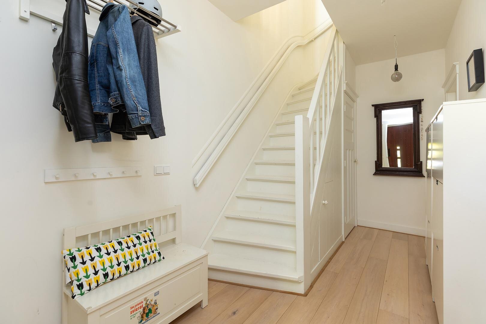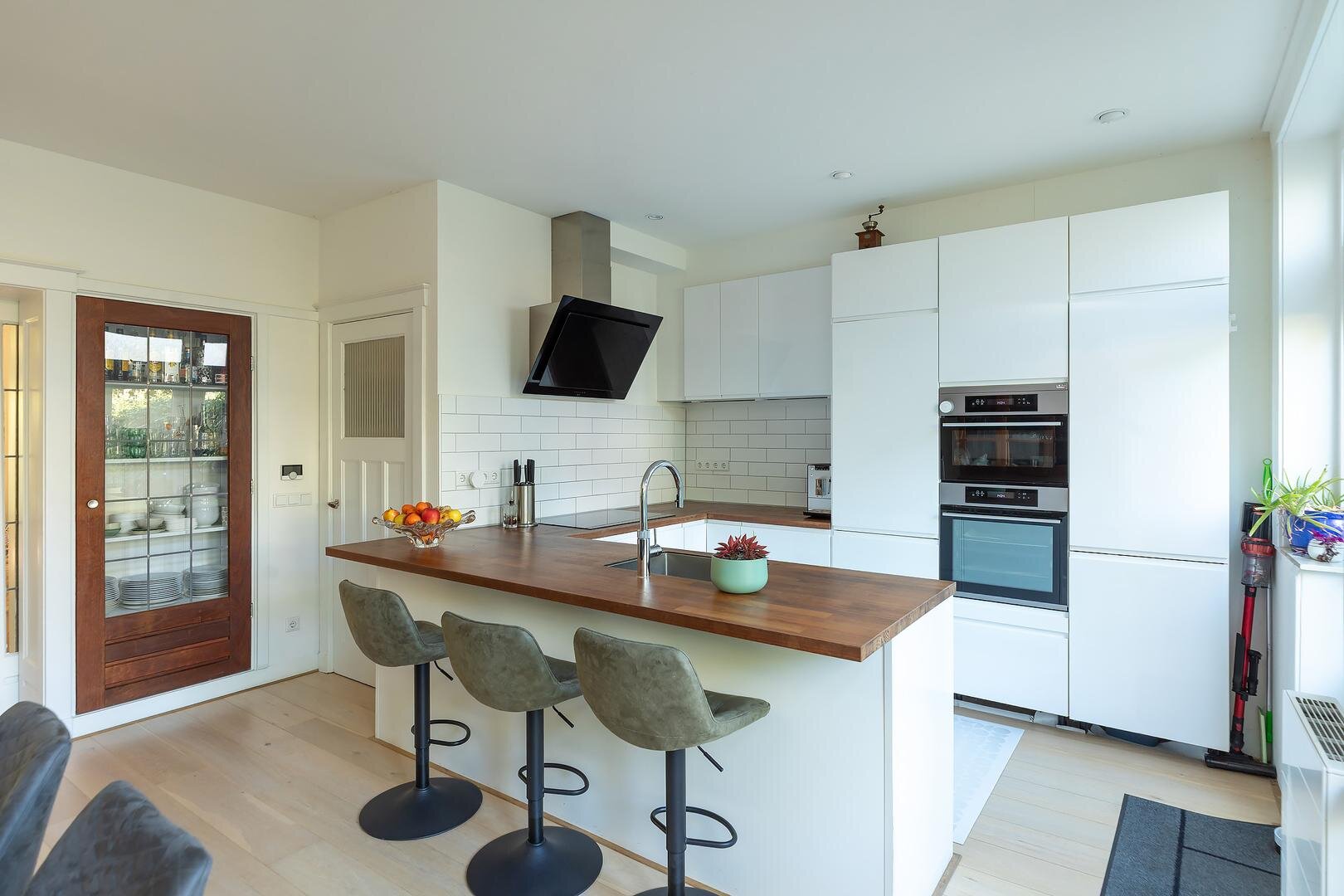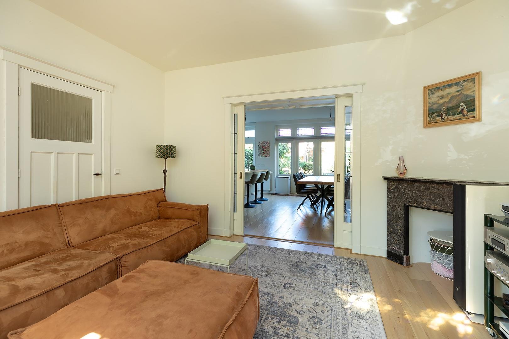 Overdekte entree, vestibule, hal met trapopgang en fraaie hoge plafonds, modern hangend toilet met fonteintje, trapkast met meterkast en toegang naar de sta-hoge kelder, lichte woonkamer en suite, houthaard met originele schouwen en over de gehele begane grond een massief eiken visgraat parketvloer. De keuken is open gebroken en vernieuwd in 2020 en is voorzien van een inductie kookplaat, combi- oven/magnetron, stoomoven, koel-/vriescombinatie, vaatwasser en een Quooker. De woning is aan de achterzijde voorzien van openslaande deuren en een separate achterdeur naar de tuin met achterom en berging voorzien van elektra en bergruimte op de vliering.