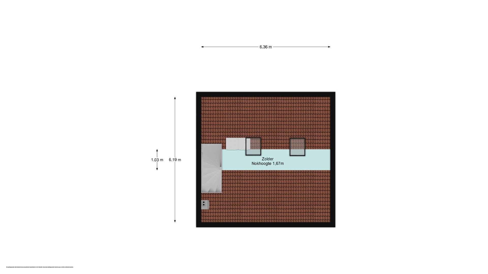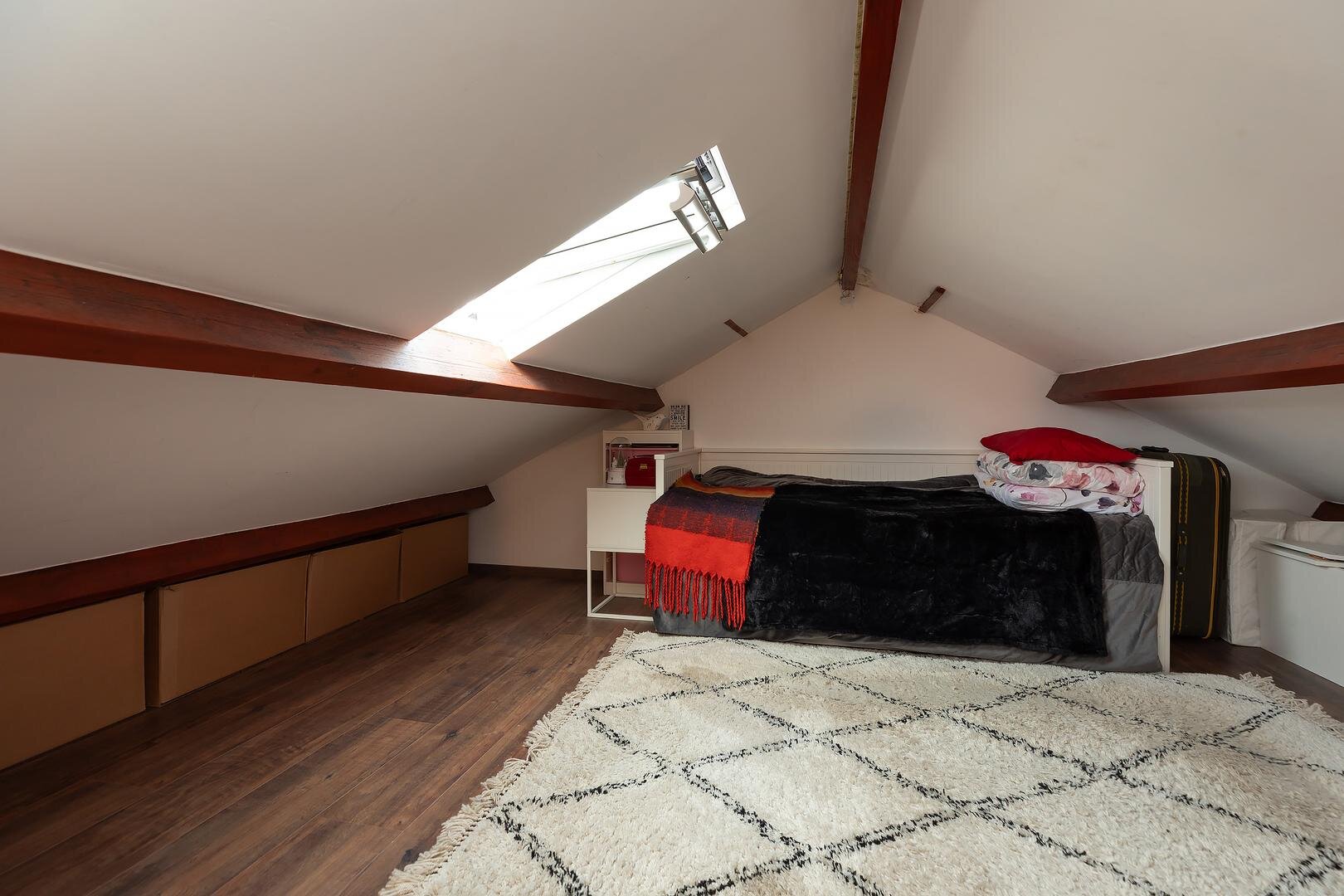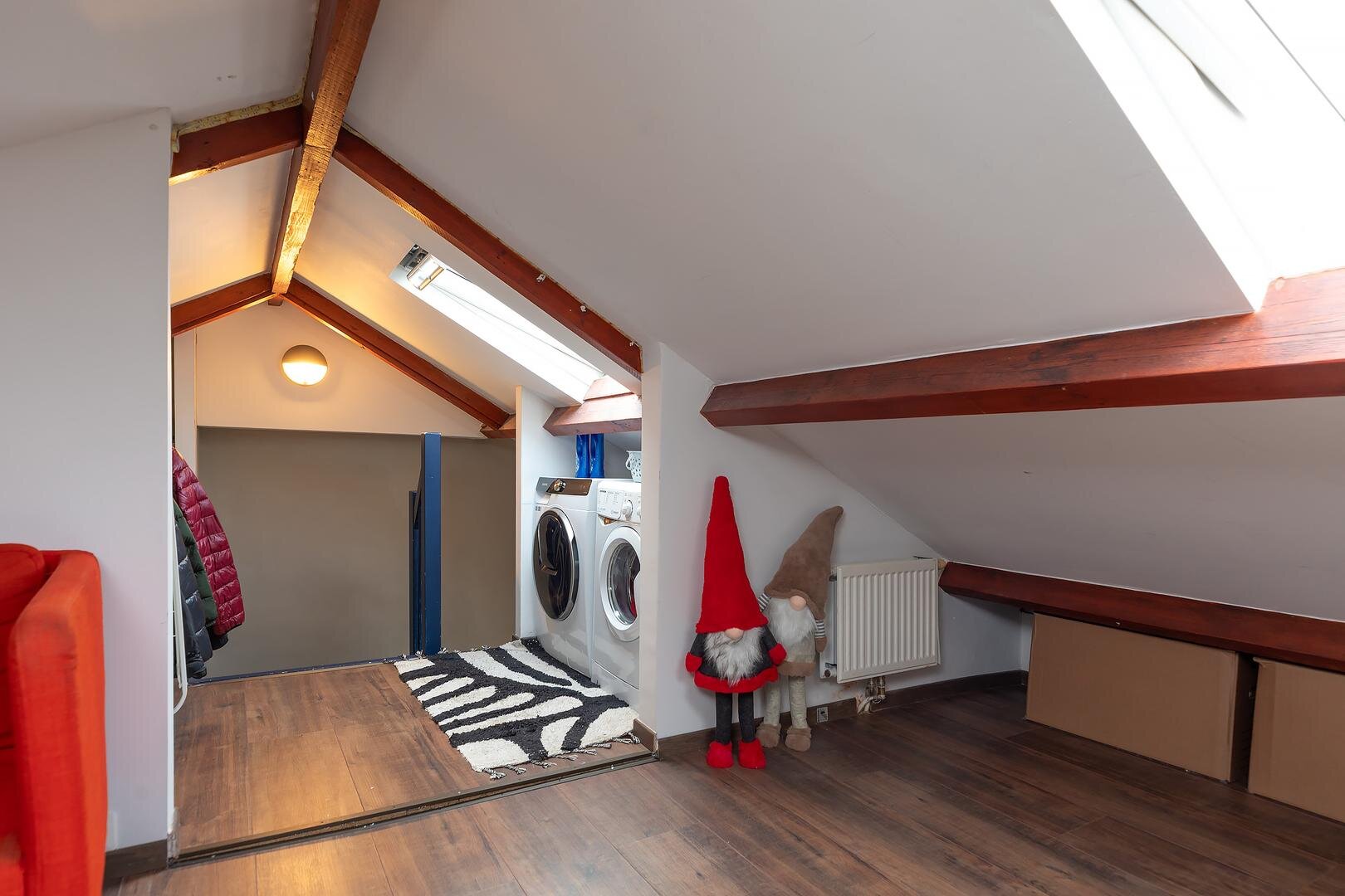 2e verdieping: via vaste trap bereikbare geïsoleerde zolderverdieping (1,67 m hoog) met 2 dakramen en aansluitingen wasapparatuur en c.v.-opstelling. De oppervlakte van deze zolder is vanwege de geringe hoogte niet meegenomen in het totale woonoppervlak echter is vanwege afwerking en afmeting heel goed bruikbaar als kinder- / werk- of logeerkamer.