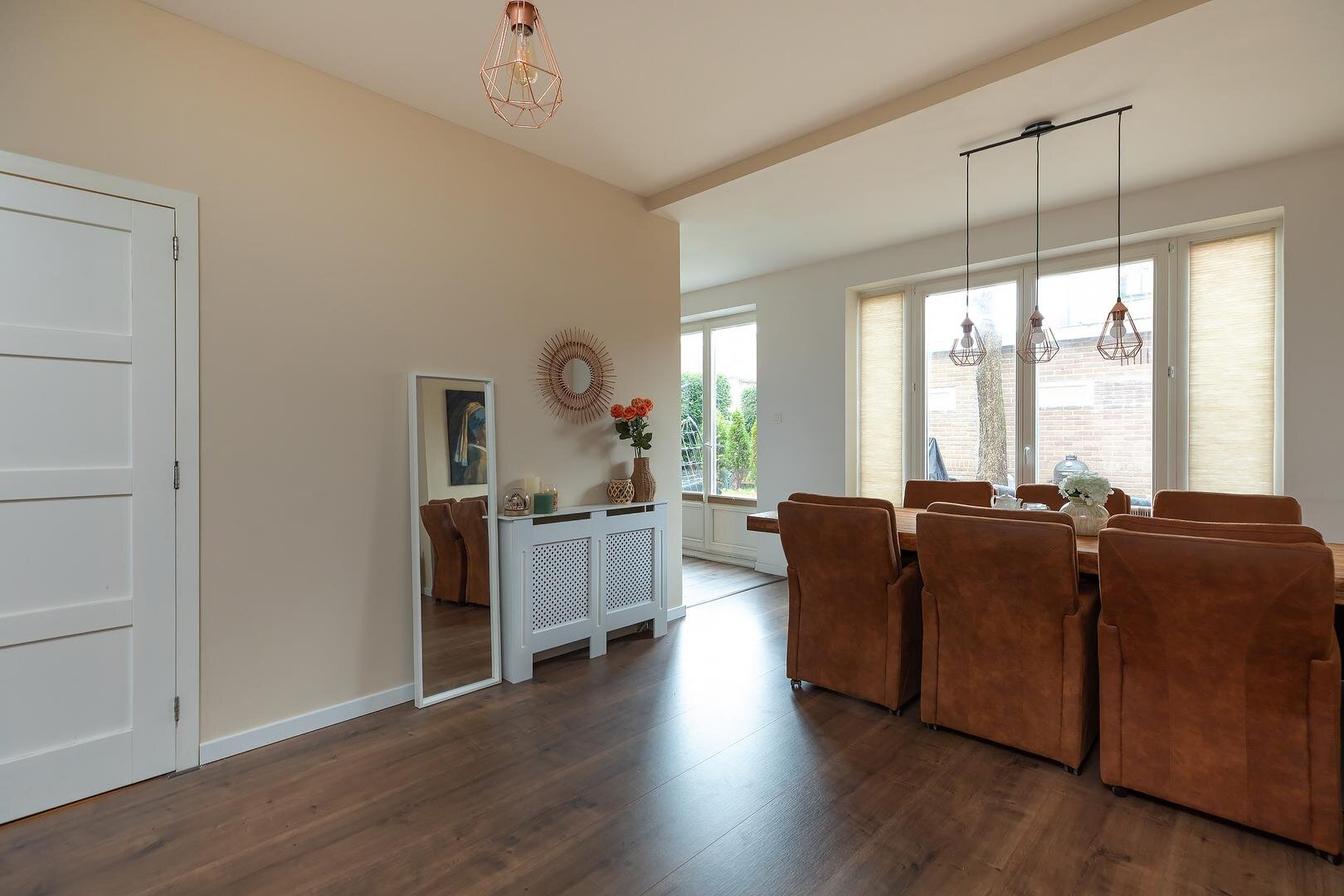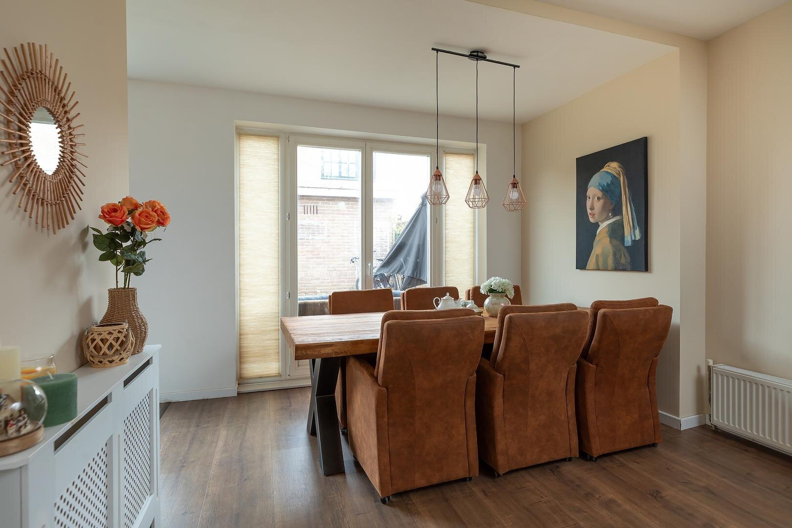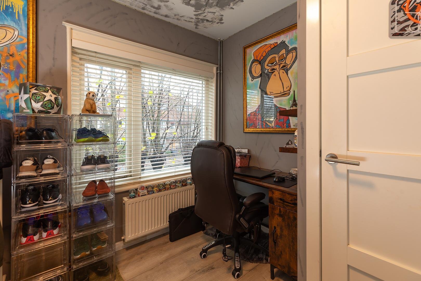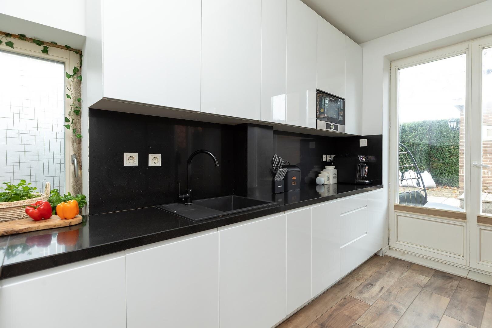 Indeling woning: entree / hal, met trapopgang en toilet met fonteintje. Ruime, uitgebouwde woon- / eetkamer met openslaande deuren naar de achtertuin, moderne semi-open keuken in L-opstelling voorzien van granieten blad, inbouwapparatuur, volop bergmogelijkheden en openslaande deuren naar de achtertuin. Vanuit de hal tevens toegang tot de het kantoor aan de voorzijde wat afgesloten van de rest van de verdieping een rustige plek biedt om te kunnen werken en studeren. In de achtertuin bevindt zich de verbouwde garage die dienst kan doen als studio / kantoor / guesthouse met eigen voorzieningen in de vorm van woon-/slaapkamer met keuken, compacte badkamer met douchecabine, wastafelmeubel, toilet en wasmachineaansluiting.