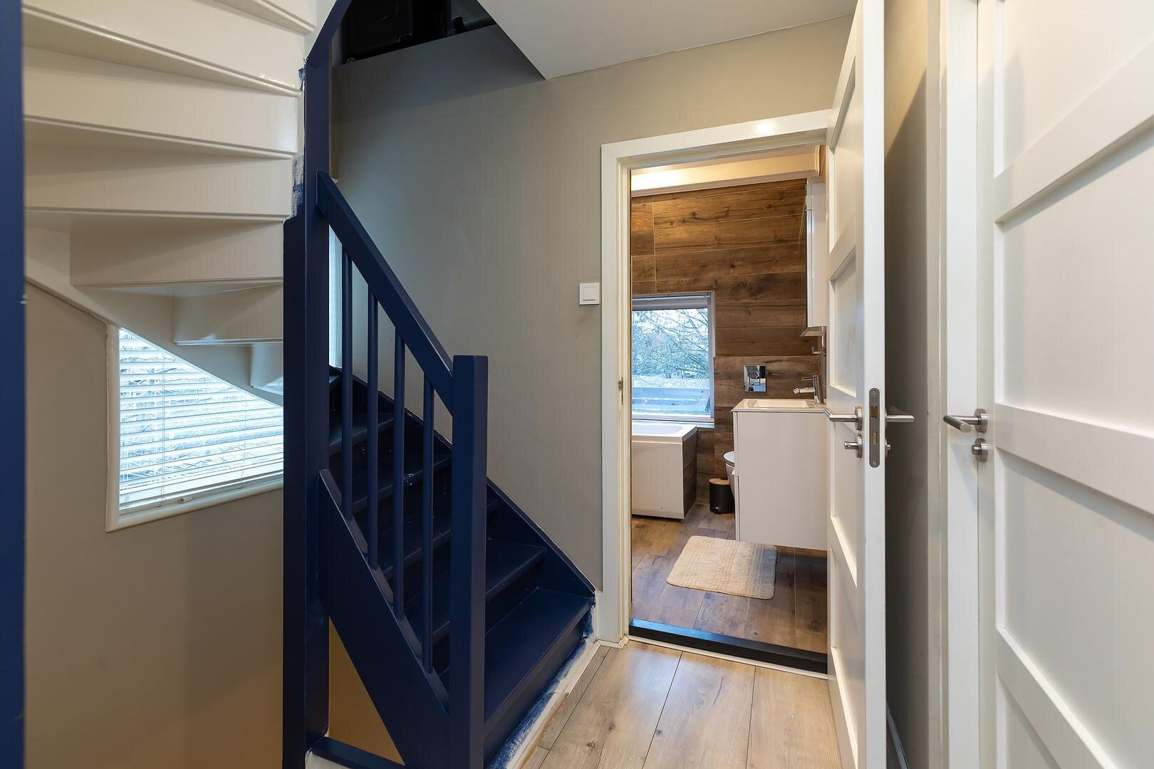 1e verdieping: overloop, 2 ruime slaapkamers van circa 14 m2 waarvan de slaapkamer aan de achterzijde met openslaande deuren naar het dakterras over de volle breedte op het westen. De 3e kleinere slaapkamer (circa 7 m2) is gelegen aan de voorzijde en is thans in gebruik als werkkamer. De moderne badkamer is gesitueerd aan de achterzijde en is voorzien van douche, ligbad met whirlpool, toilet, wastafelmeubel, dakraam en handdoekradiator.