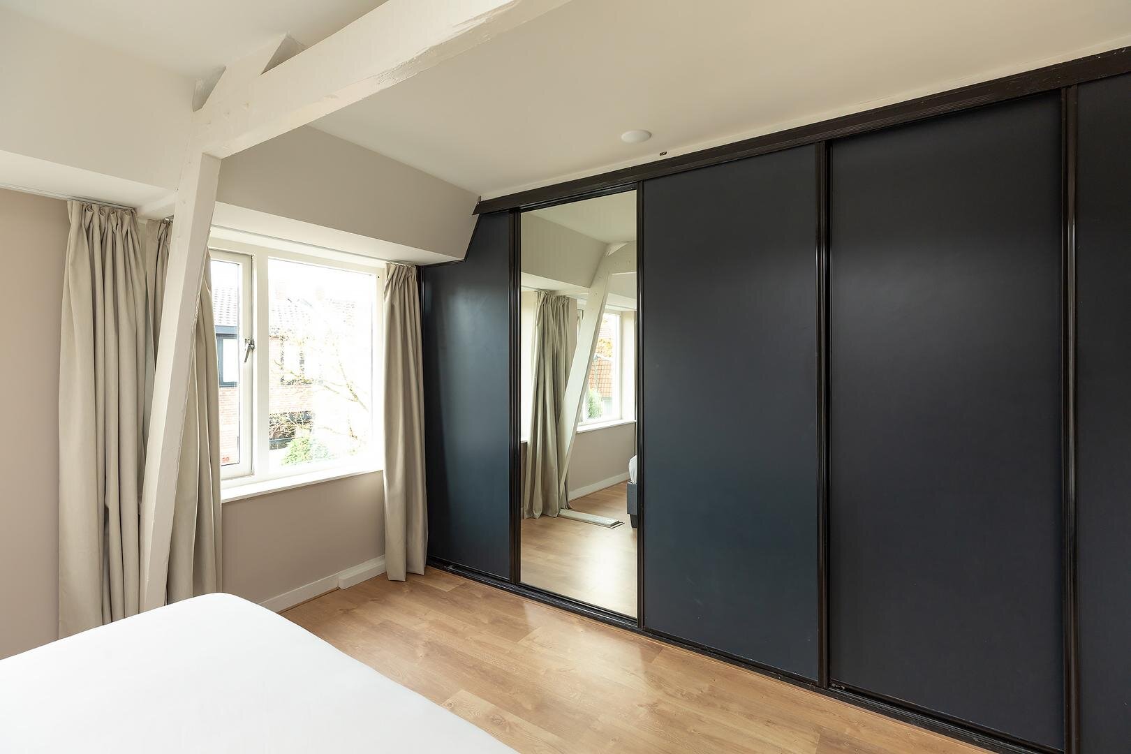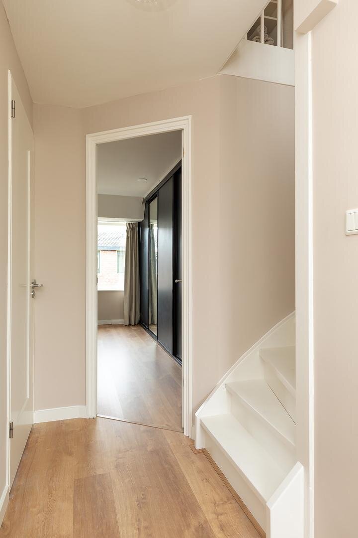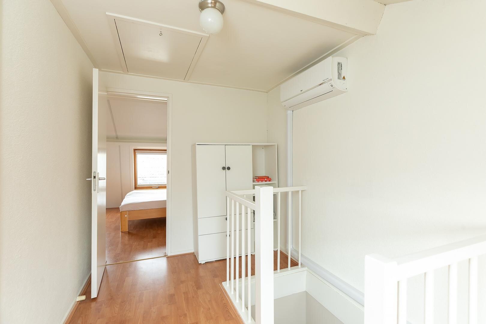 Op de eerste verdieping bevinden zich twee slaapkamers. De ruime hoofdslaapkamer aan de achterzijde beschikt over airconditioning (2023) en een inbouwkast over de volle breedte. De moderne badkamer is stijlvol uitgevoerd en voorzien van een inloopdouche, wastafelmeubel en tweede toilet. De tweede verdieping heeft een royale overloop met eveneens airconditioning, een wasruimte met wasmachine- en drogeraansluiting, en de cv-opstelling (2021). Aan de voorzijde ligt een derde ruime slaapkamer. Via een luik op de overloop is de vliering bereikbaar voor extra bergruimte.