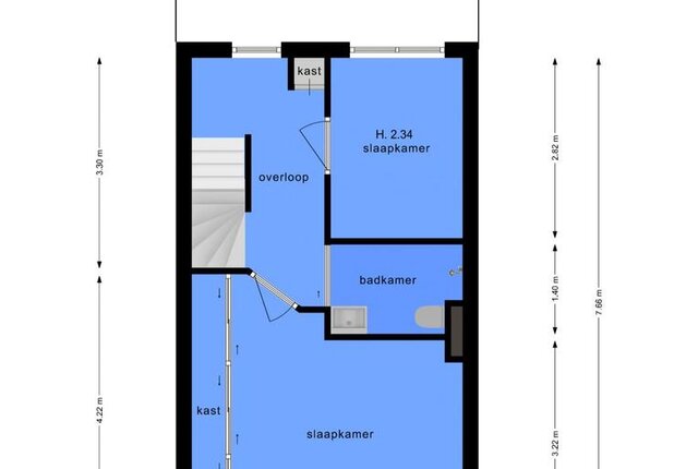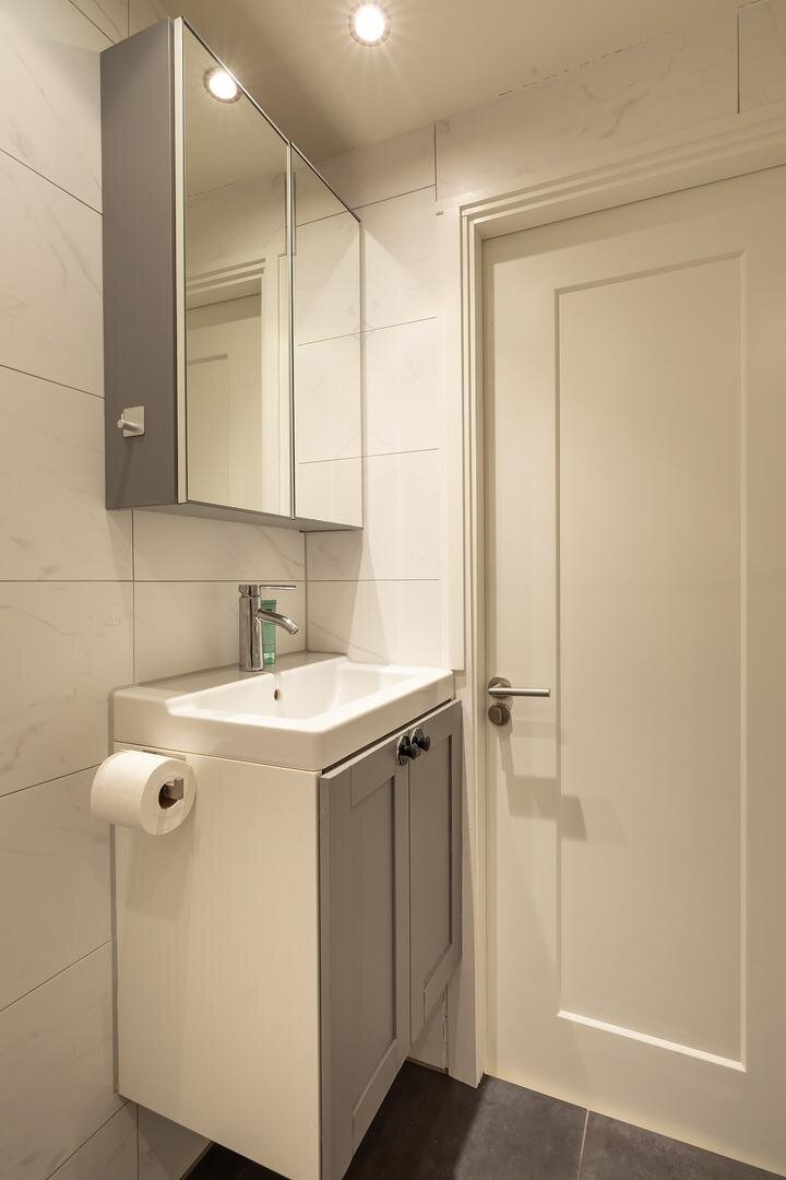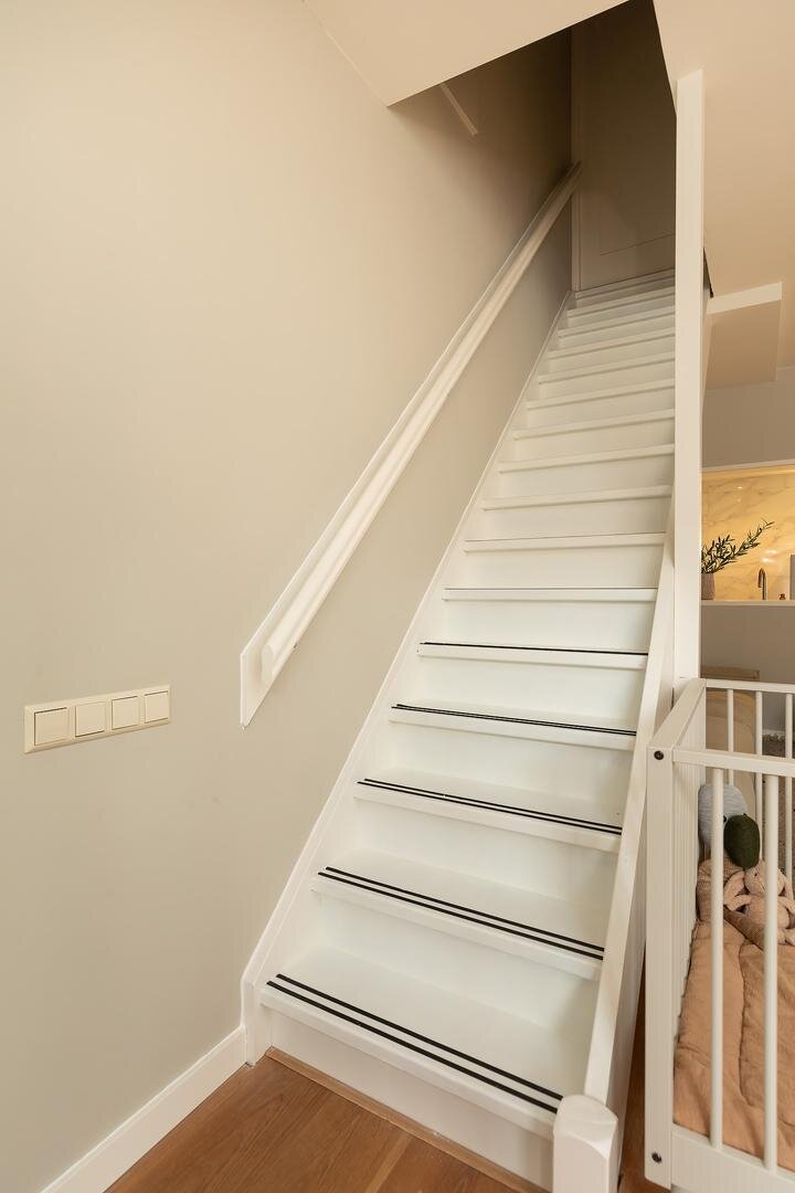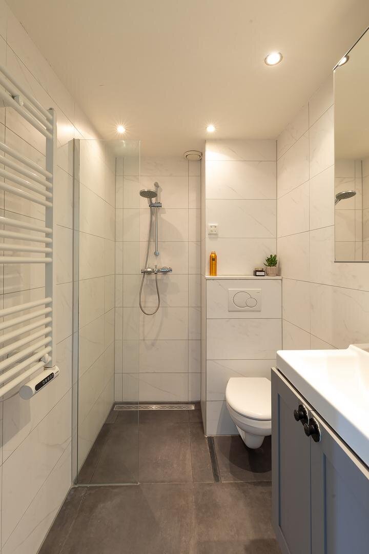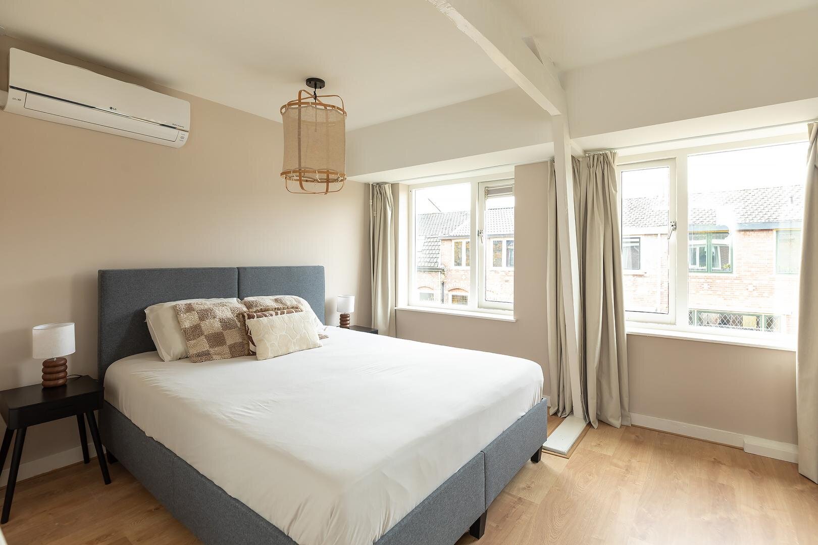 Op de eerste verdieping bevinden zich twee slaapkamers. De ruime hoofdslaapkamer aan de achterzijde beschikt over airconditioning (2023) en een inbouwkast over de volle breedte. De moderne badkamer is stijlvol uitgevoerd en voorzien van een inloopdouche, wastafelmeubel en tweede toilet. De tweede verdieping heeft een royale overloop met eveneens airconditioning, een wasruimte met wasmachine- en drogeraansluiting, en de cv-opstelling (2021). Aan de voorzijde ligt een derde ruime slaapkamer. Via een luik op de overloop is de vliering bereikbaar voor extra bergruimte.