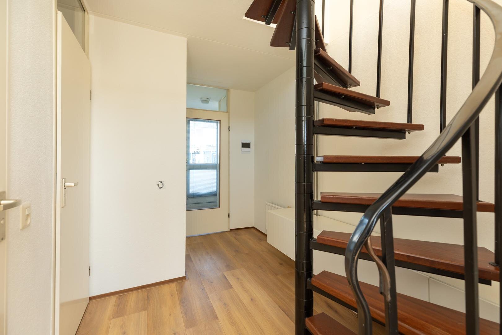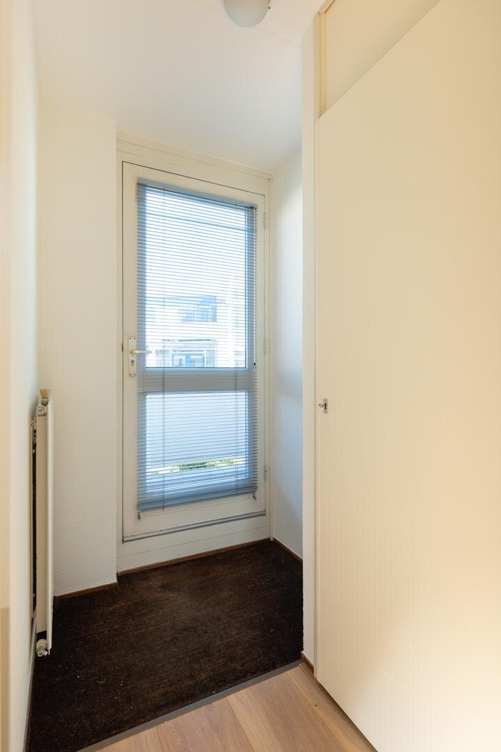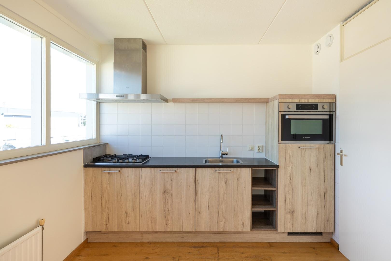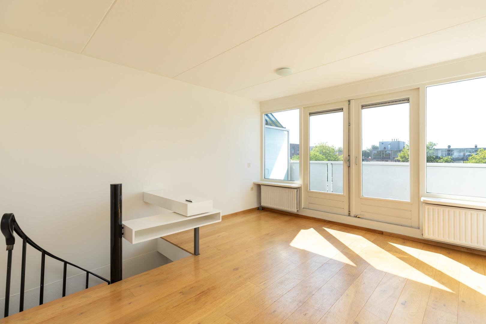 Verdieping: middels wenteltrap naar lichte woonkamer voorzien van houten vloerdelen en vaste kast. Openslaande deuren naar het zonnige balkon over de volle breedte met vrij uitzicht en gelegen op het zuiden. Moderne keuken voorzien van gaskookplaat, combi oven/magnetron, koelkast en vaatwasser, bergkast met c.v. opstelling en wasmachine aansluiting.