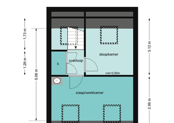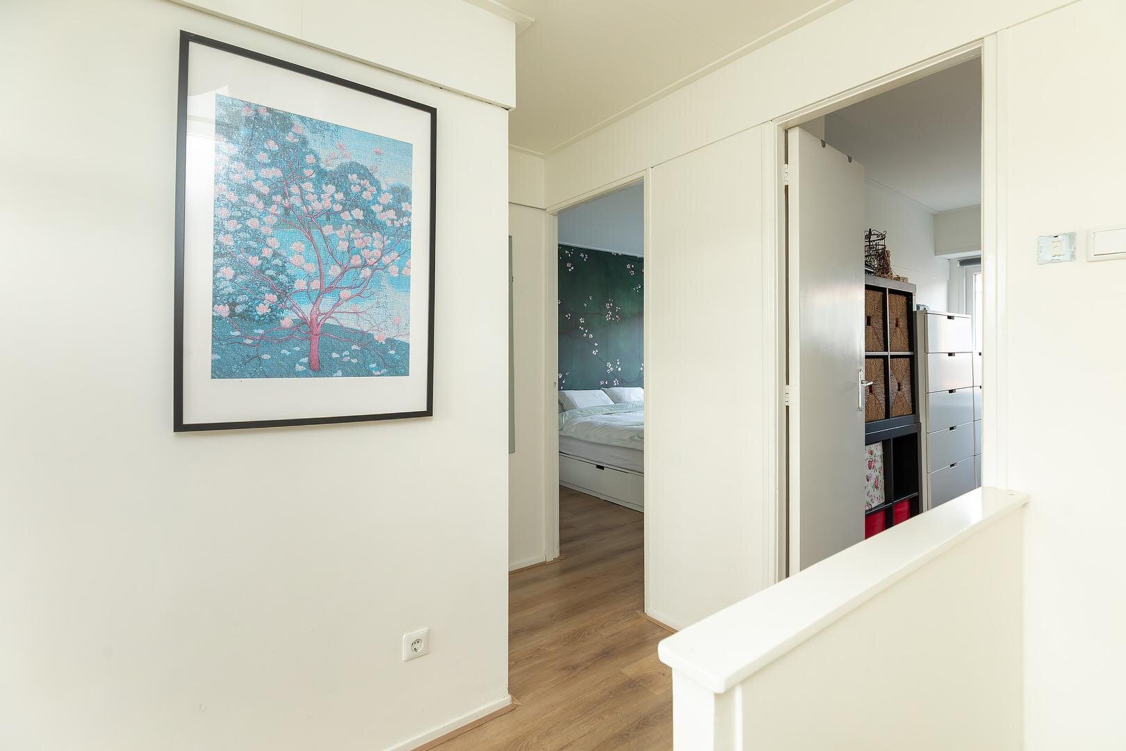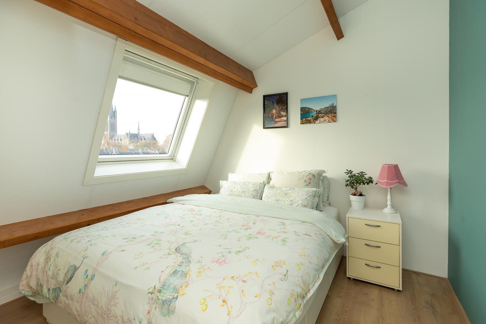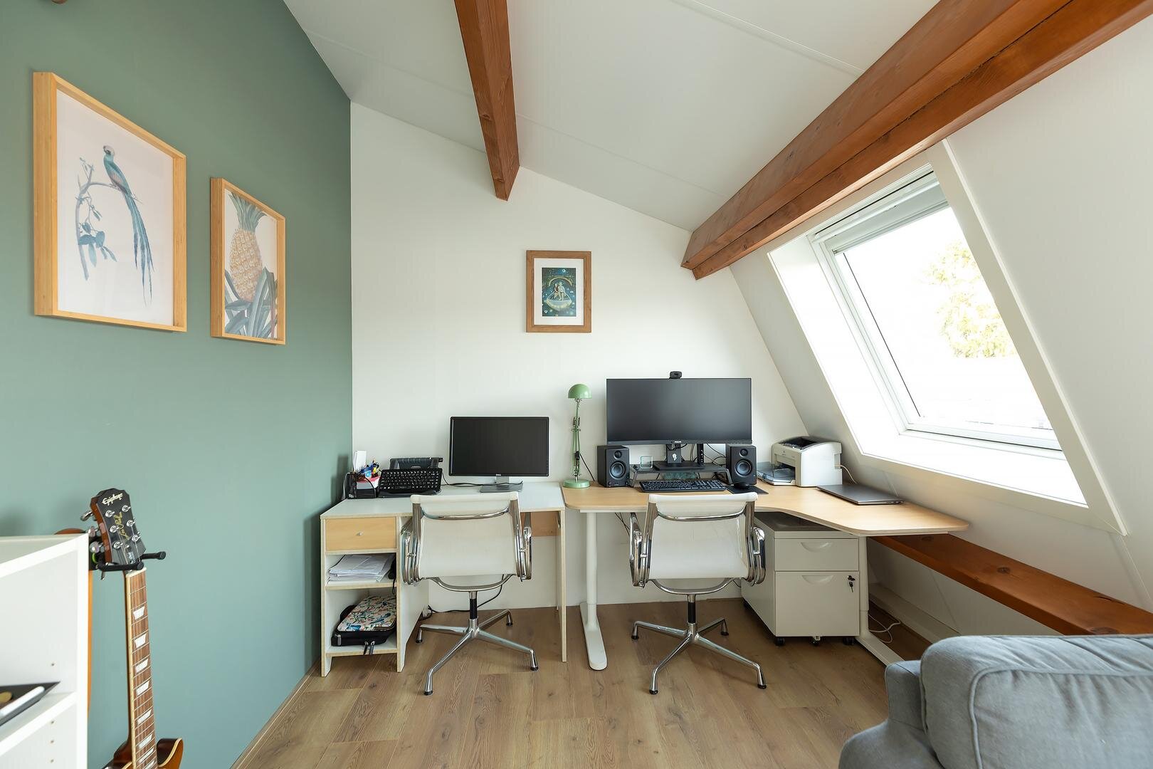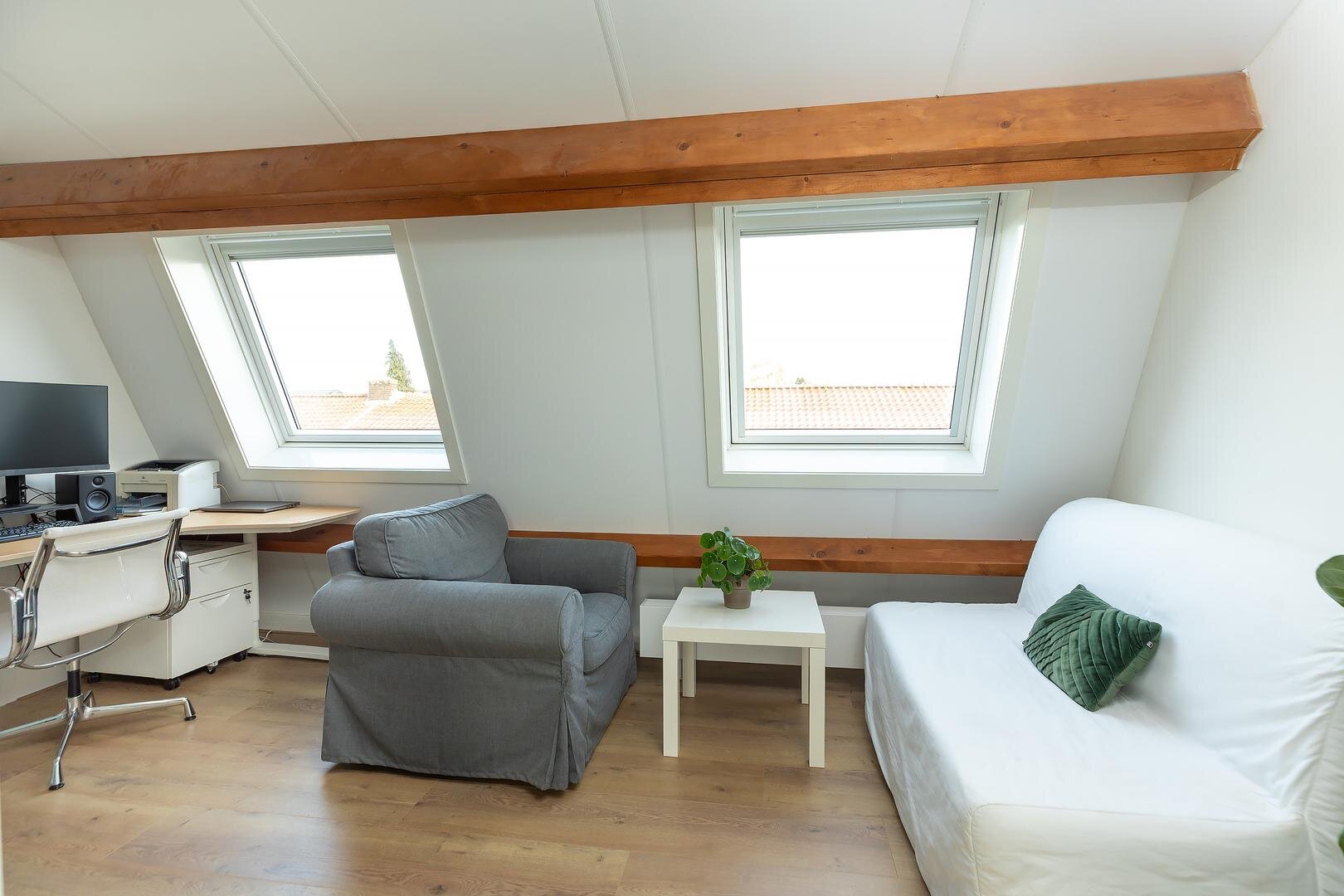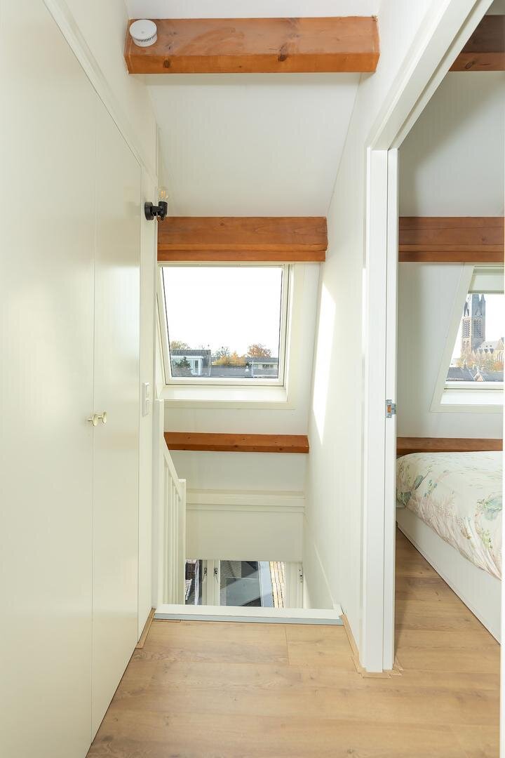2e verdieping: Via vaste trap bereikbare overloop met verrassend veel daglicht door dakraam en een ruime vaste kast. Slaapkamer aan de achterzijde (circa 8 m2) en royale 4e slaapkamer (circa 13m2 ) aan de voorzijde met wastafelmeubel en veel daglicht door de 2 grote dakramen. Ook deze verdieping voorzien van een lichte laminaat vloer.