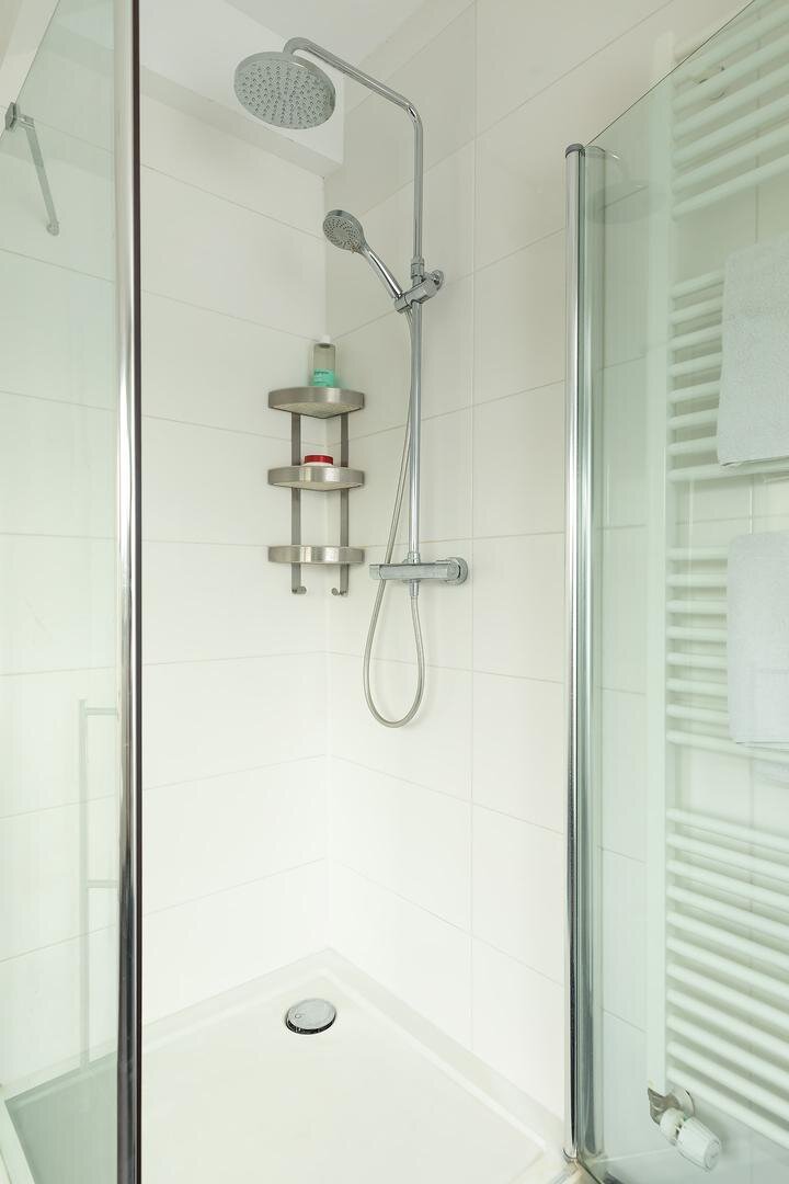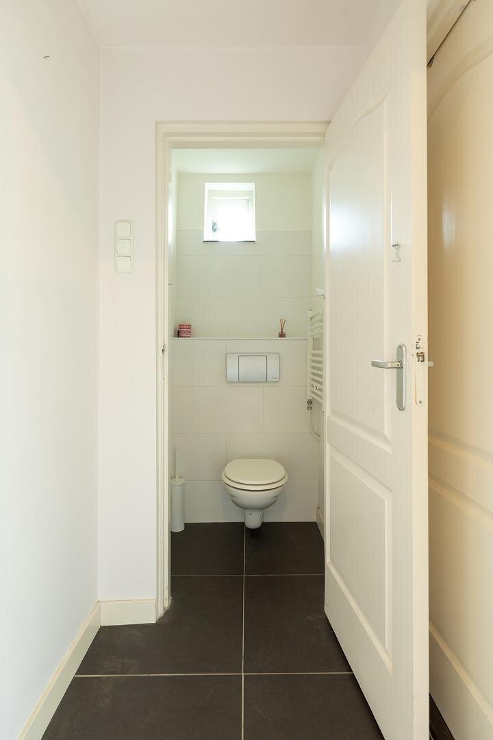 1e verdieping: ruime en lichte overloop, 2 slaapkamers aan de voorzijde (groot circa 6 en 9 m2) waarvan de grote slaapkamer met inloopkast. De ruime badkamer is gelegen aan de achterzijde en beschikt over een douche, 2e toilet, dubbele waskom met meubel, handdoekradiator en deur naar het dakterras van circa 17m2 waar ook vroeg en laat in het seizoen als snel van de zon genoten kan worden. Deze gehele verdieping is voorzien van een lichte laminaat vloer.