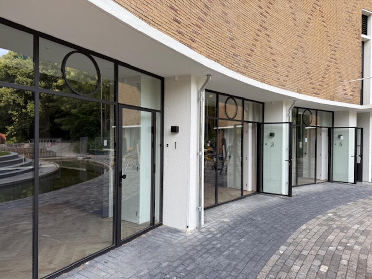Vanuit de woonkamer stap je zo het ruime terras op, dat grenst aan stadspark De Oude Haven. Het terras wordt op een speelse manier afgeschermd van het park door een sierlijke vijver.