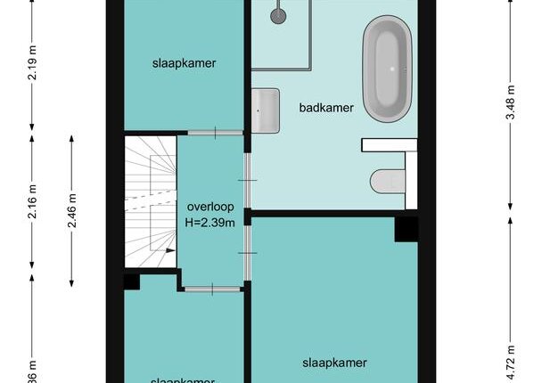 Overloop met een parketvloer, drie verschillende slaapkamers, een balkon en een riante badkamer met een vrijstaand bad, inloop regendouche, wastafelmeubel, toilet en handdoekradiator.