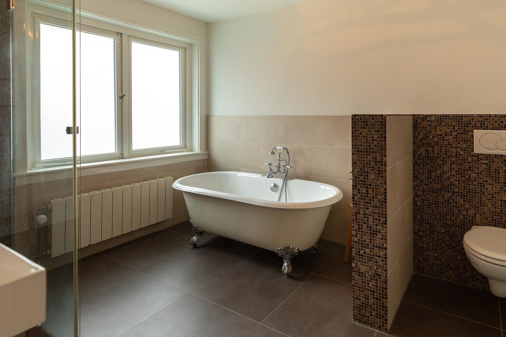 Overloop met een parketvloer, drie verschillende slaapkamers, een balkon en een riante badkamer met een vrijstaand bad, inloop regendouche, wastafelmeubel, toilet en handdoekradiator.
