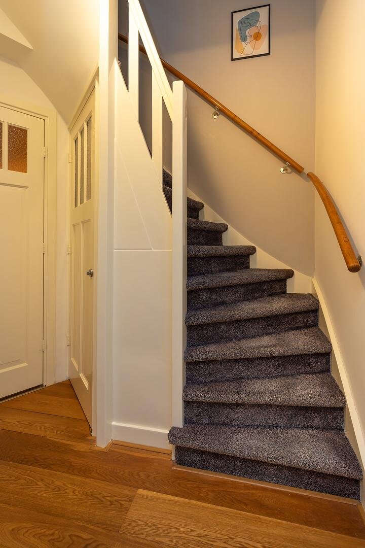 berg / meterkast met moderne groepen en de trapopgang naar de verdieping.