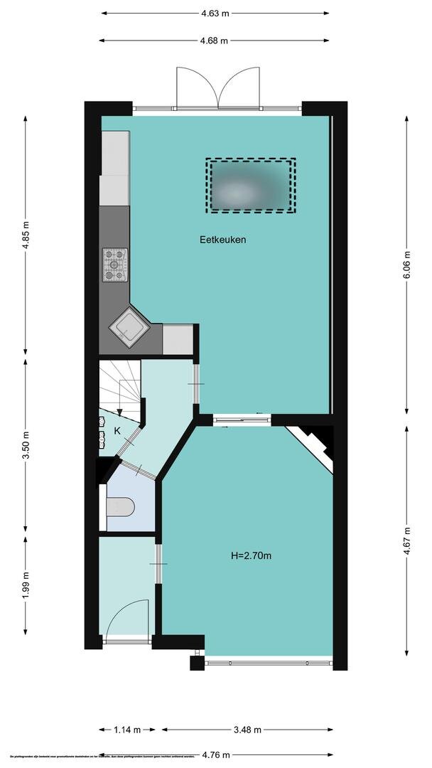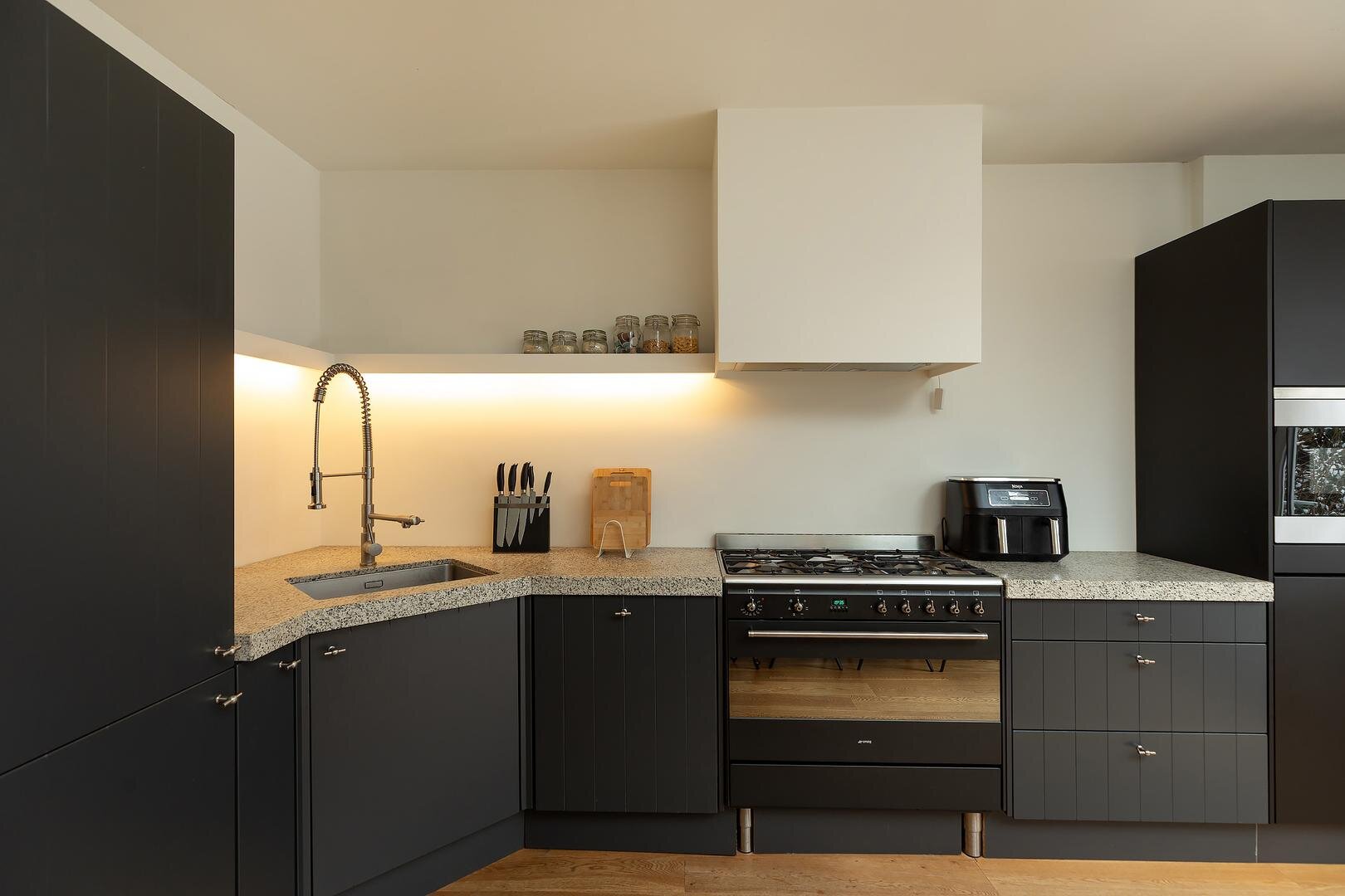 De begane grond heeft een charmante woonkamer met originele en suite met met glas-in lood deuren en een parketvloer. De uitgebouwde woonkeuken is voorzien van moderne apparatuur en een brede lichtstraat, waardoor er veel lichtinval ontstaat. De openslaande deuren bieden toegang tot de zonnige tuin. Via de tussenhal bereik je het moderne toilet, de
