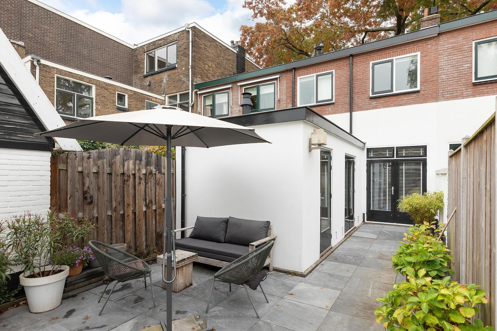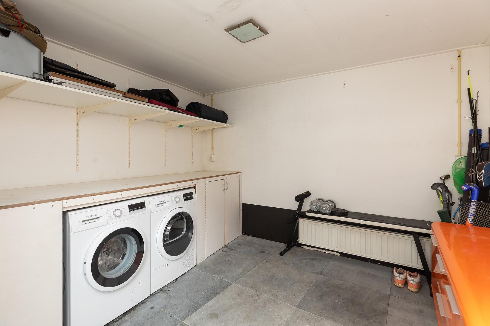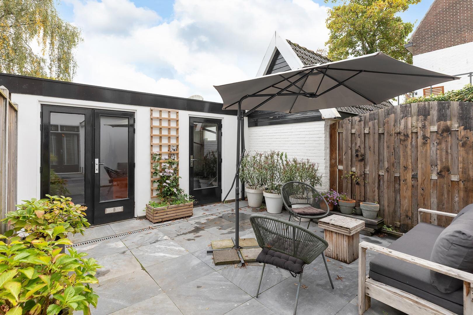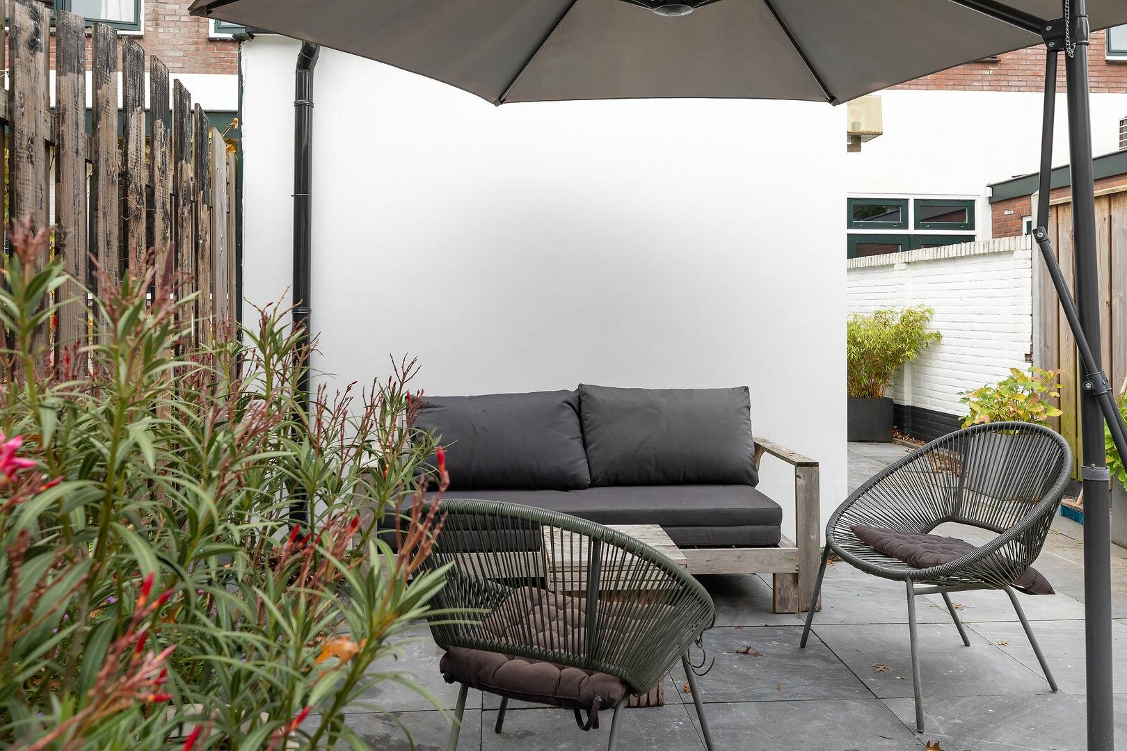 De achtertuin is zowel via de openslaande deuren als via de keukendeur toegankelijk. In de onderhoudsvriendelijk aangelegde achtertuin is plaats voor een eettafel en een loungebank. Achterin de tuin staat een dubbele stenen schuur met bergruimte v.v. aansluitingen voor de wasmachine en droger en een tweede schuur voor fietsen en kliko’s. Vanuit deze schuur is het achtergelegen parkeerterrein met recht van overpad bereikbaar.