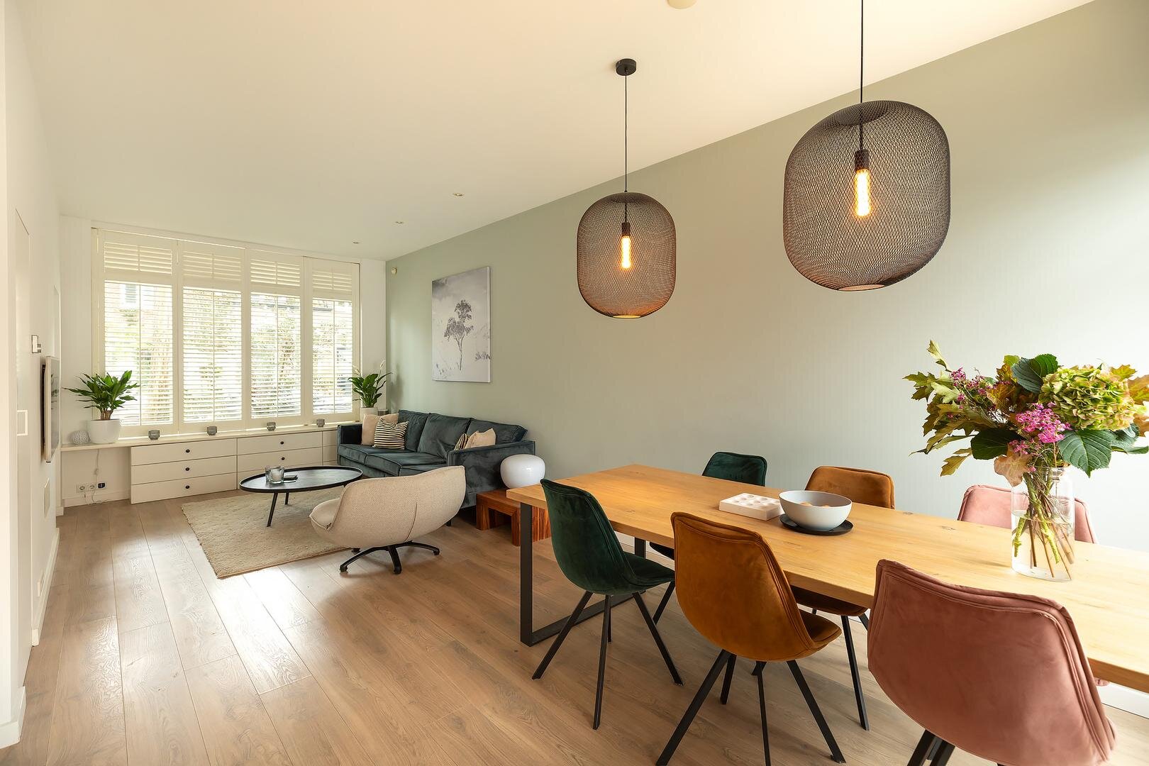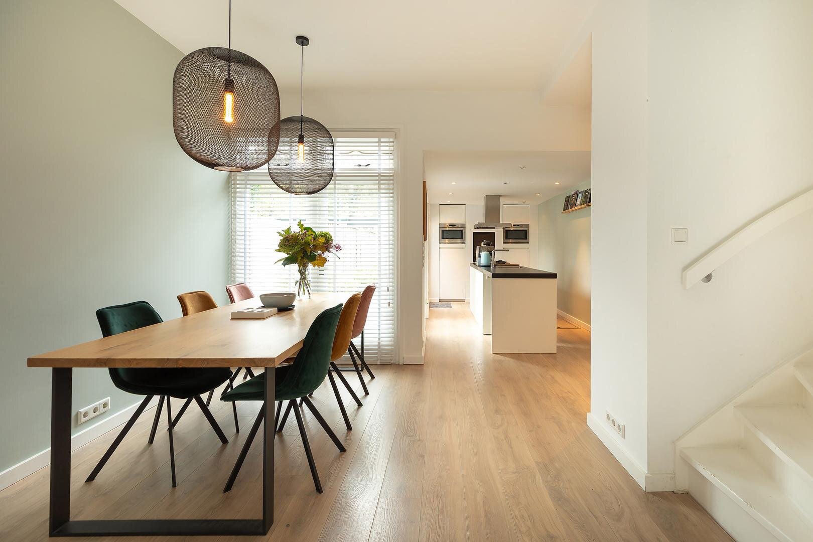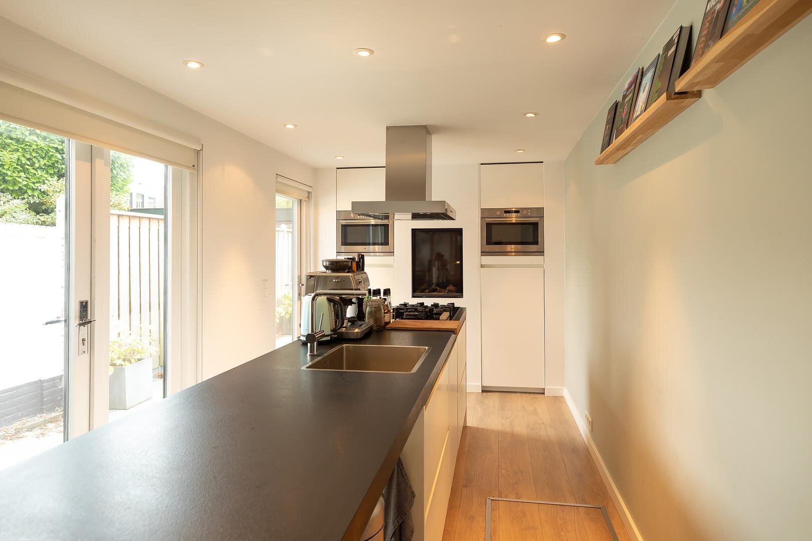 Begane grond: entree, hal met recent vernieuwd modern toilet v.v. fontein, zeer aansprekende ruime woon-/eetkamer met hoge plafonds en aan de voorzijde glas in lood en shutters, vaste kast met moderne groepenkast en bergruimte, de openslaande deuren bieden toegang tot de tuin die gelegen is op de avondzon met een fijne afgewerkte berging voorzien van wasmachine- en- drogeraansluiting en een tweede fietsenberging. Aan de achterzijde is de woning uitgebouwd; met open keuken voorzien van kook-/spoeleiland voorzien van bar, vaatwasser, gaskookplaat, afzuigkap en legio lades. De achterwand biedt plaats aan een koelkast, vriezer, combioven/magnetron en een sfeervolle gashaard met afstandsbediening. Onder de keuken is een ruime kelder aanwezig met bergruimte en close in boiler.