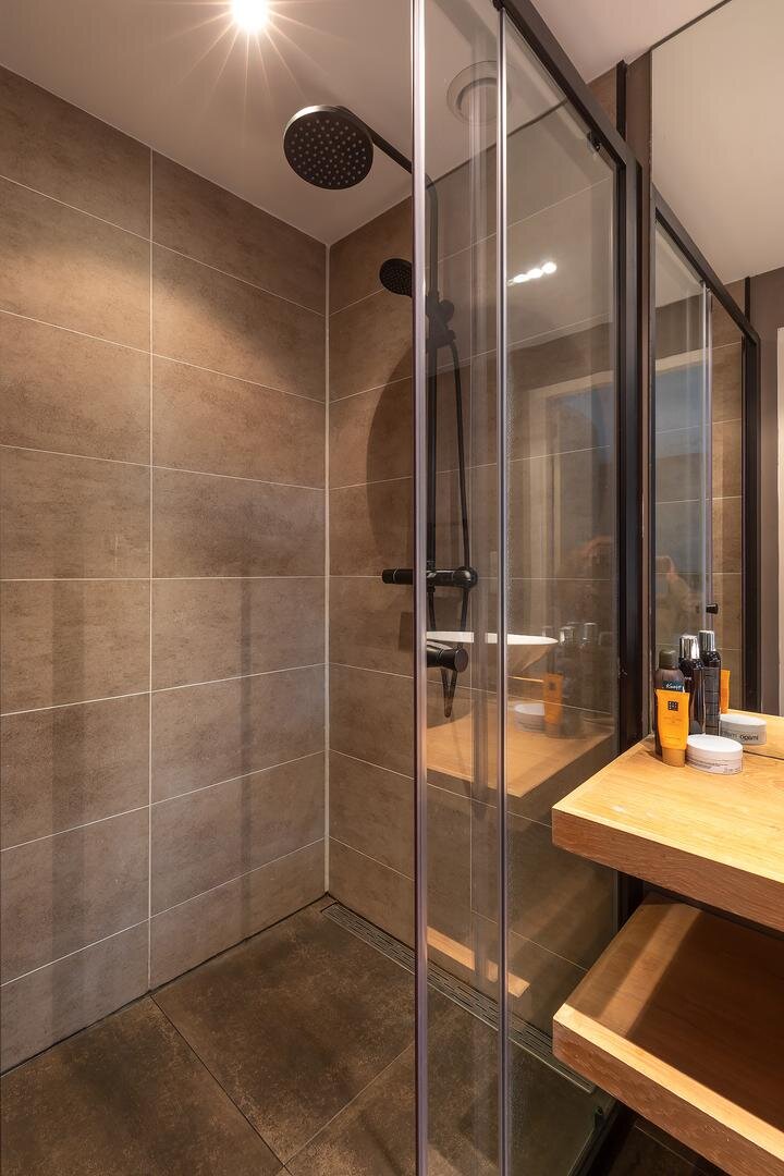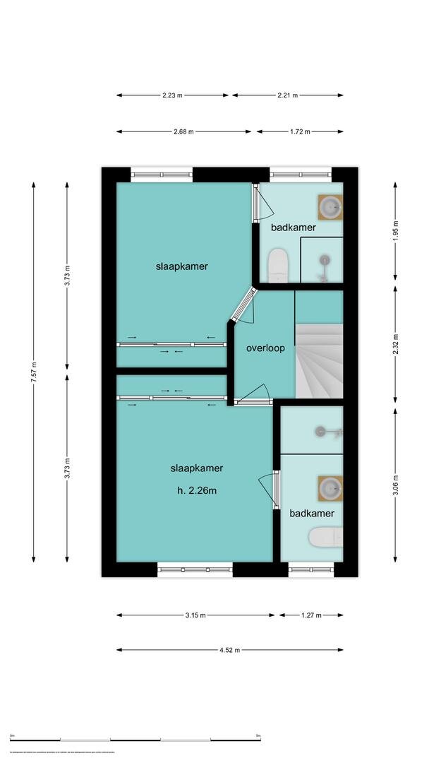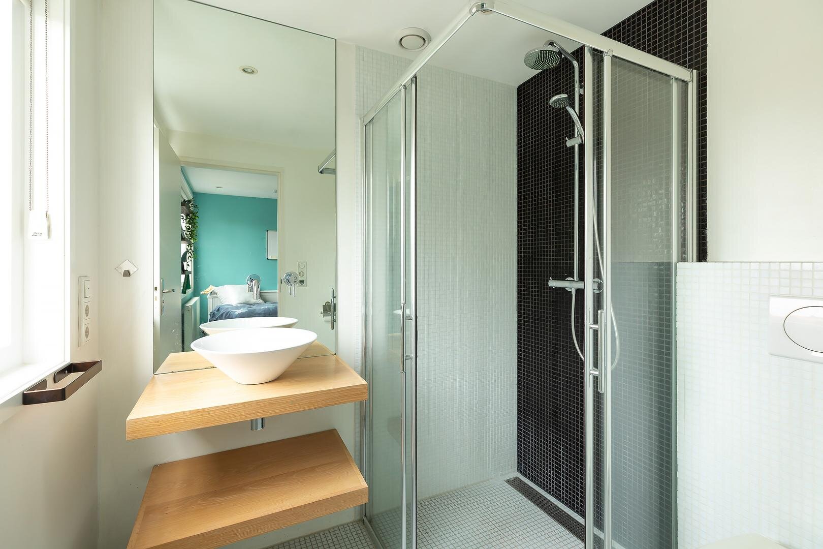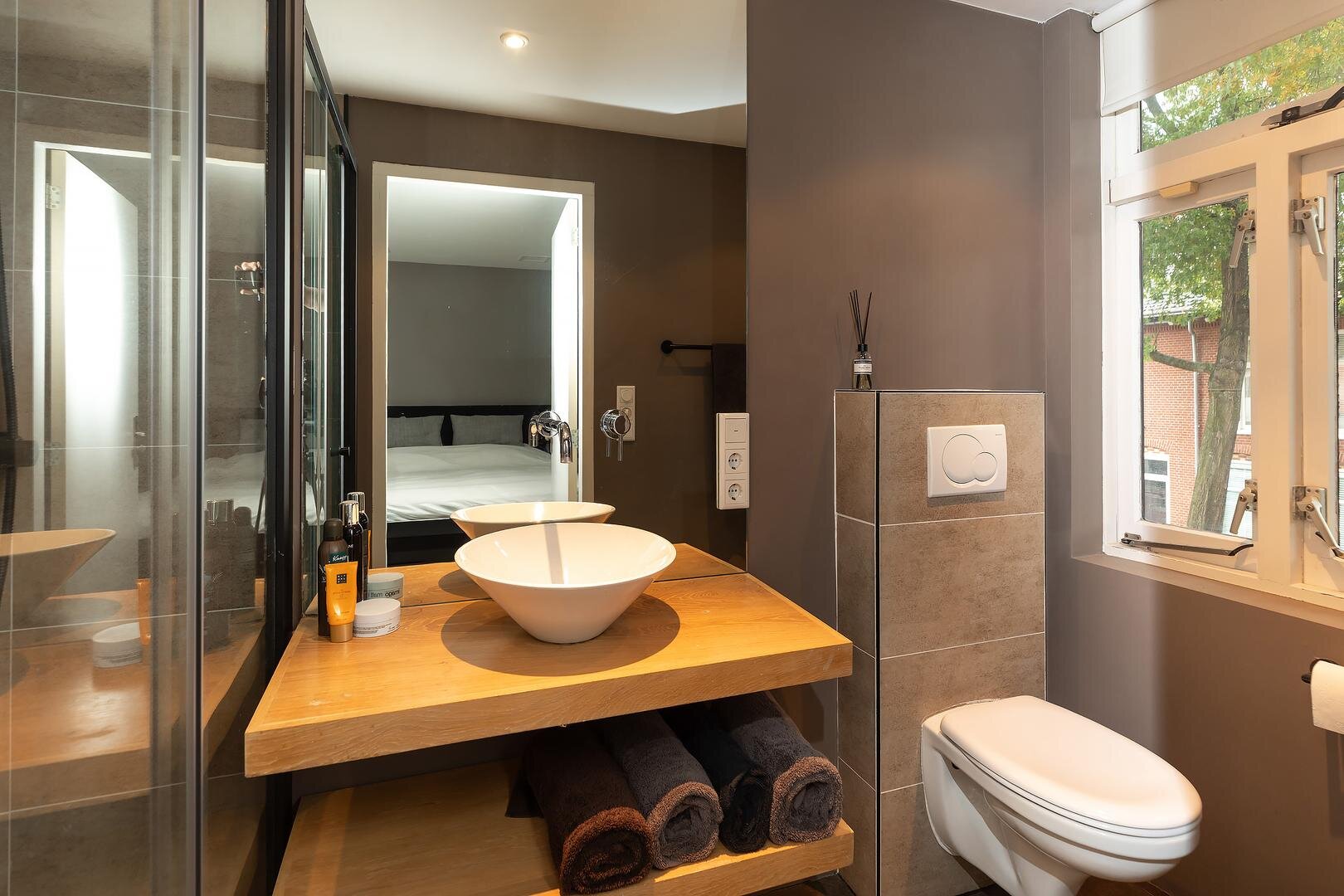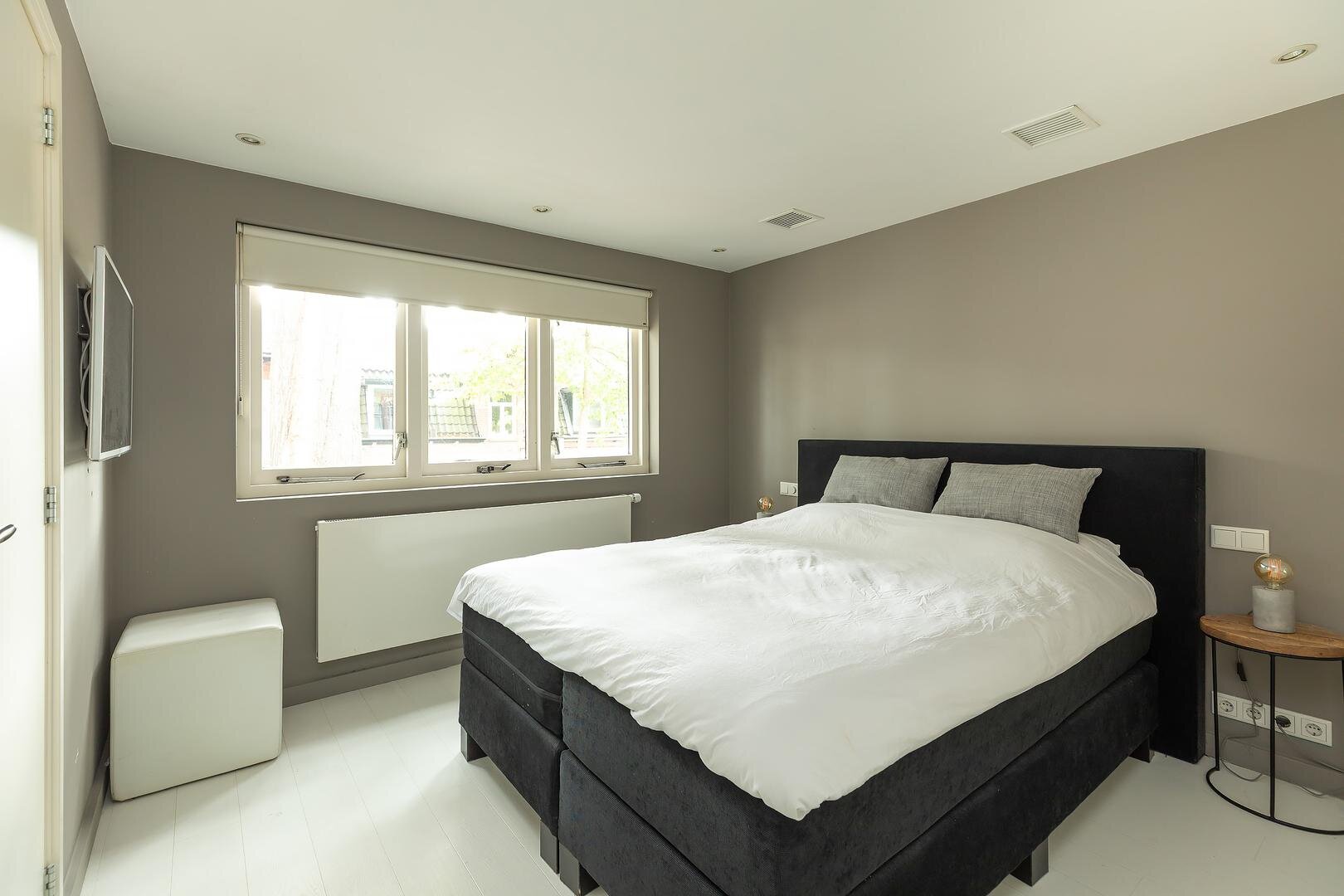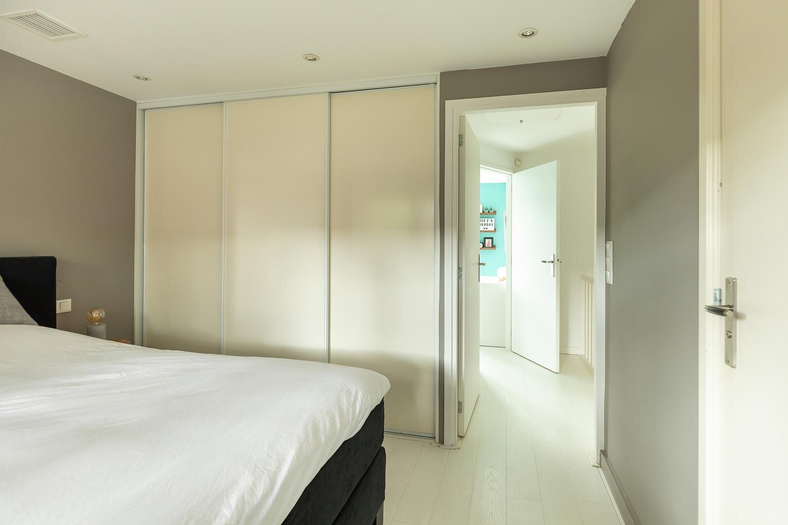 Verdieping: overloop, 1e slaapkamer met ingebouwde kastenwand aan de voorzijde en recent vernieuwde badkamer met inloopdouche, wastafelmeubel, toilet en vloerverwarming. Aan de achterzijde een tweede ruime slaapkamer met kastenwand en een tweede badkamer met douche, toilet en wastafelmeubel, eveneens voorzien van spiegel met wandkranen.