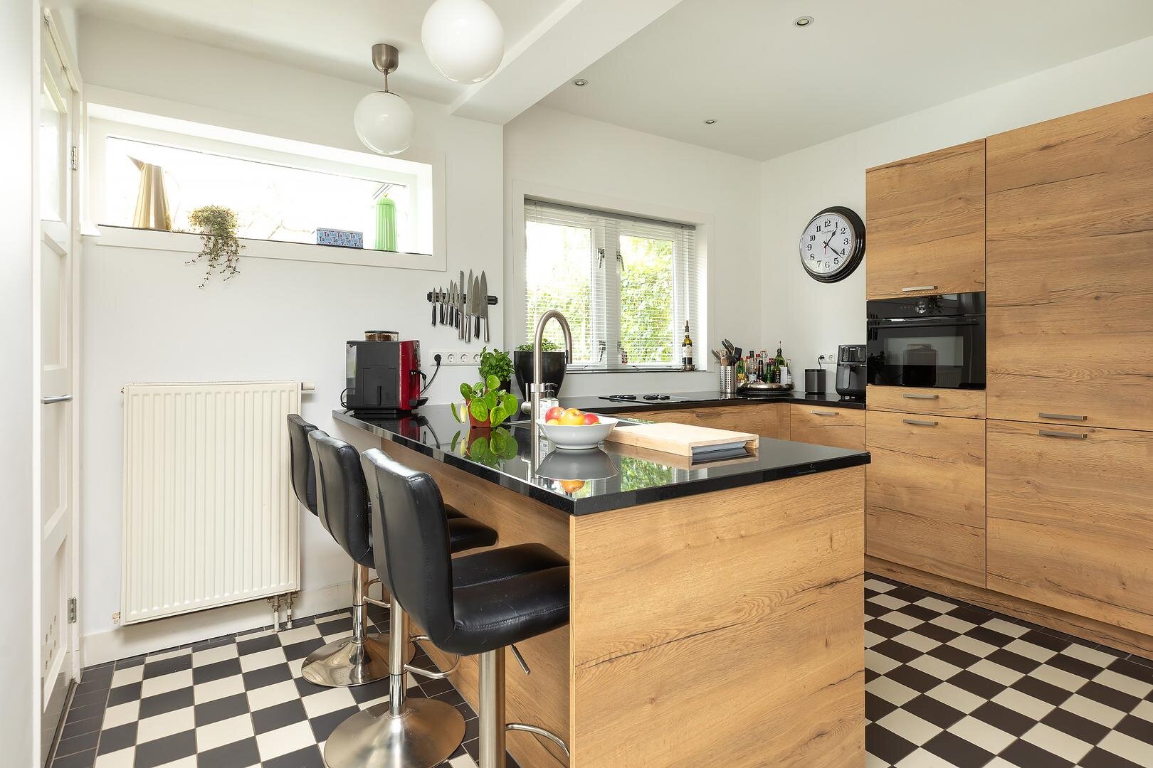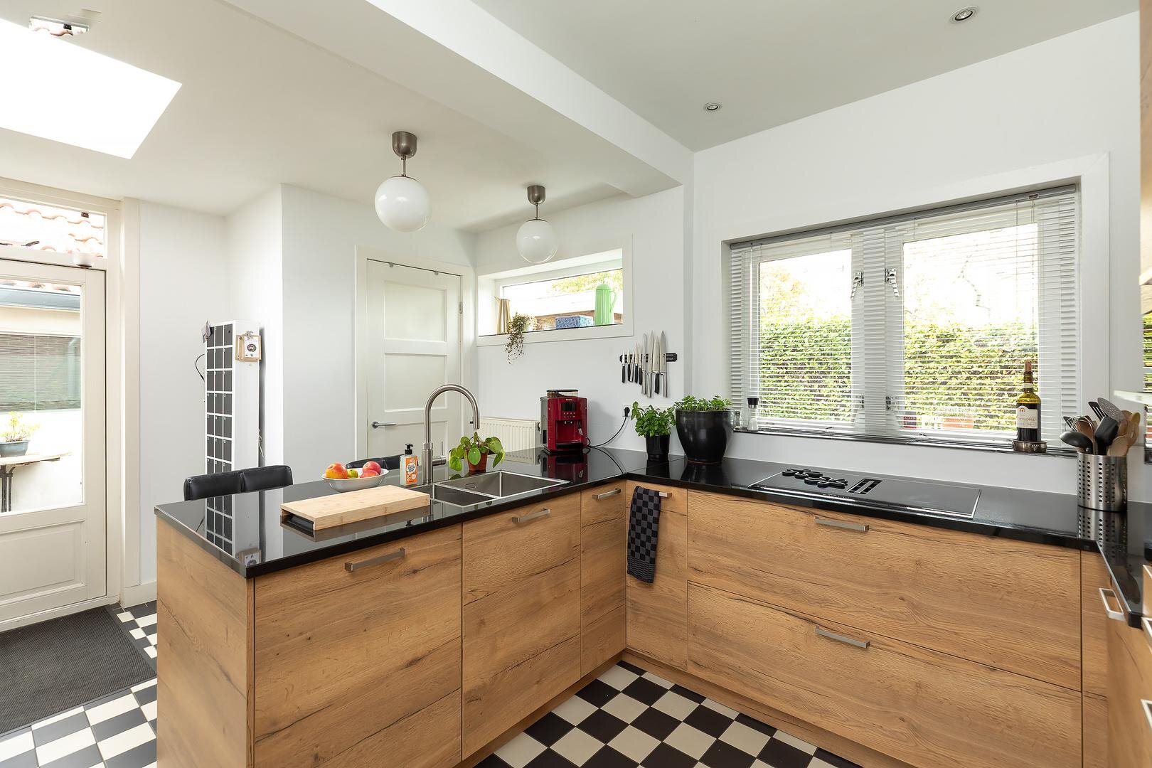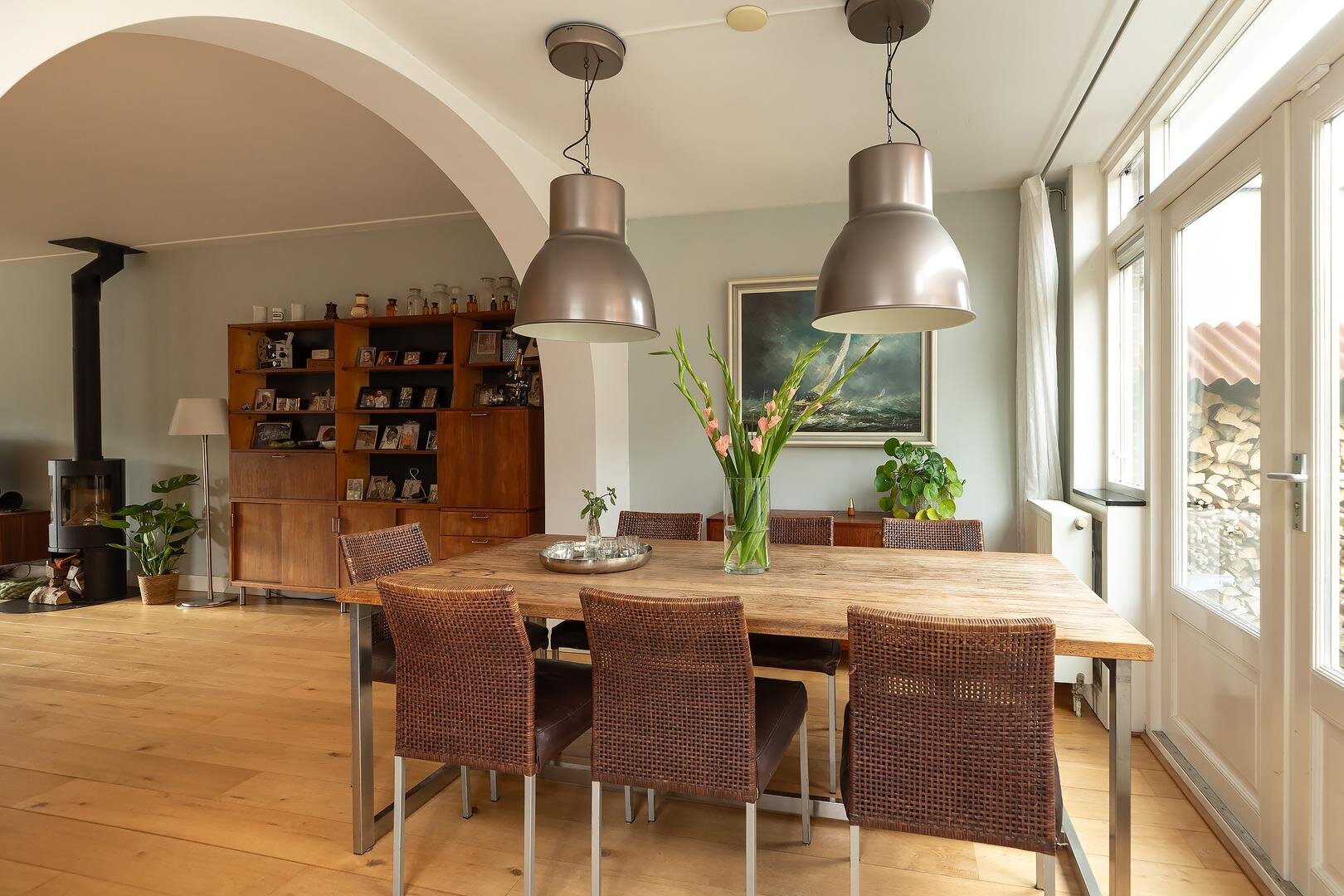 Indeling: overdekte entree, vestibule met meterkast, hal, toilet met fonteintje en trapopgang. Zeer royale L-vormige woonkamer met houtkachel, erker aan de voorzijde en deur naar de voortuin. De eetkamer is gesitueerd aan de achterzijde, beschikt over een gashaard en heeft openslaande deuren naar de achtertuin. De woon- en eetkamer zijn voorzien van lichte houten vloerdelen. De open keuken in U-opstelling is in 2025 geplaatst, voorzien van Bosch inbouwapparatuur waaronder inductieplaat met afzuiging, oven, quooker, vaatwasser dubbele spoelbak, barretje en granieten blad en biedt toegang tot de kelder met bergruimte en c.v.-opstelling (Intergas HRE 2022).