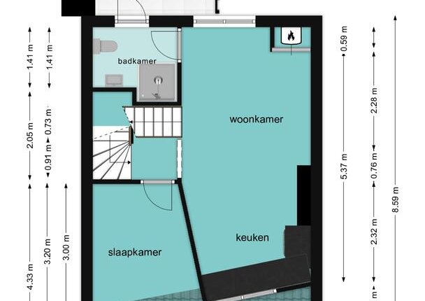 Entree, vestibule met meterkast (voorzien van tussenmeters), centrale overloop, prive trapopgang, open leefruimte met keukenopstelling voorzien van gaskookplaat, afzuigkap en wasmachine-aansluiting, 1e slaap-/werkkamer, badkamer met toilet, douche en wastafel, toegang naar het fijne en ruime dakterras pal op het zuiden! Vaste trap naar de 2e (slaap)verdieping met Velux dakramen.