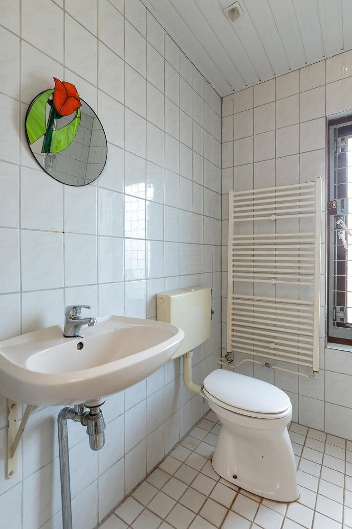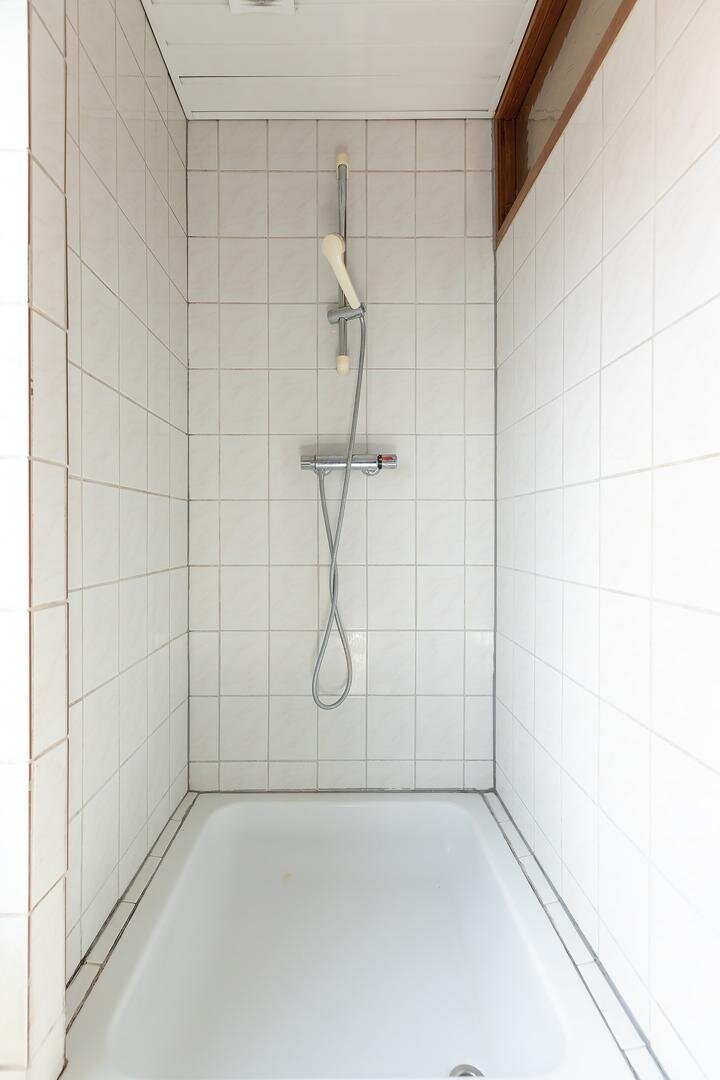 De badkamer is voorzien van een douche, wastafel en toilet.