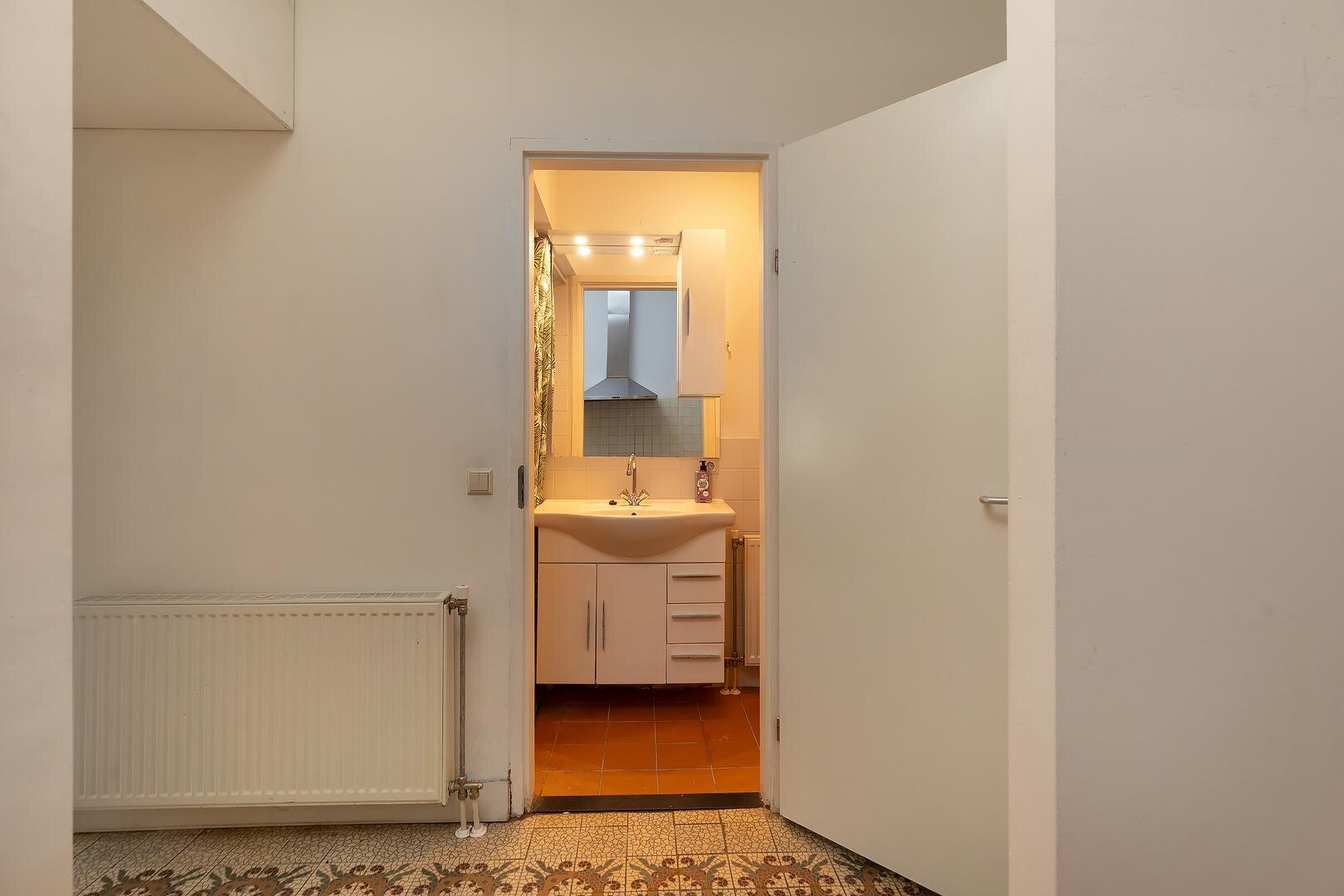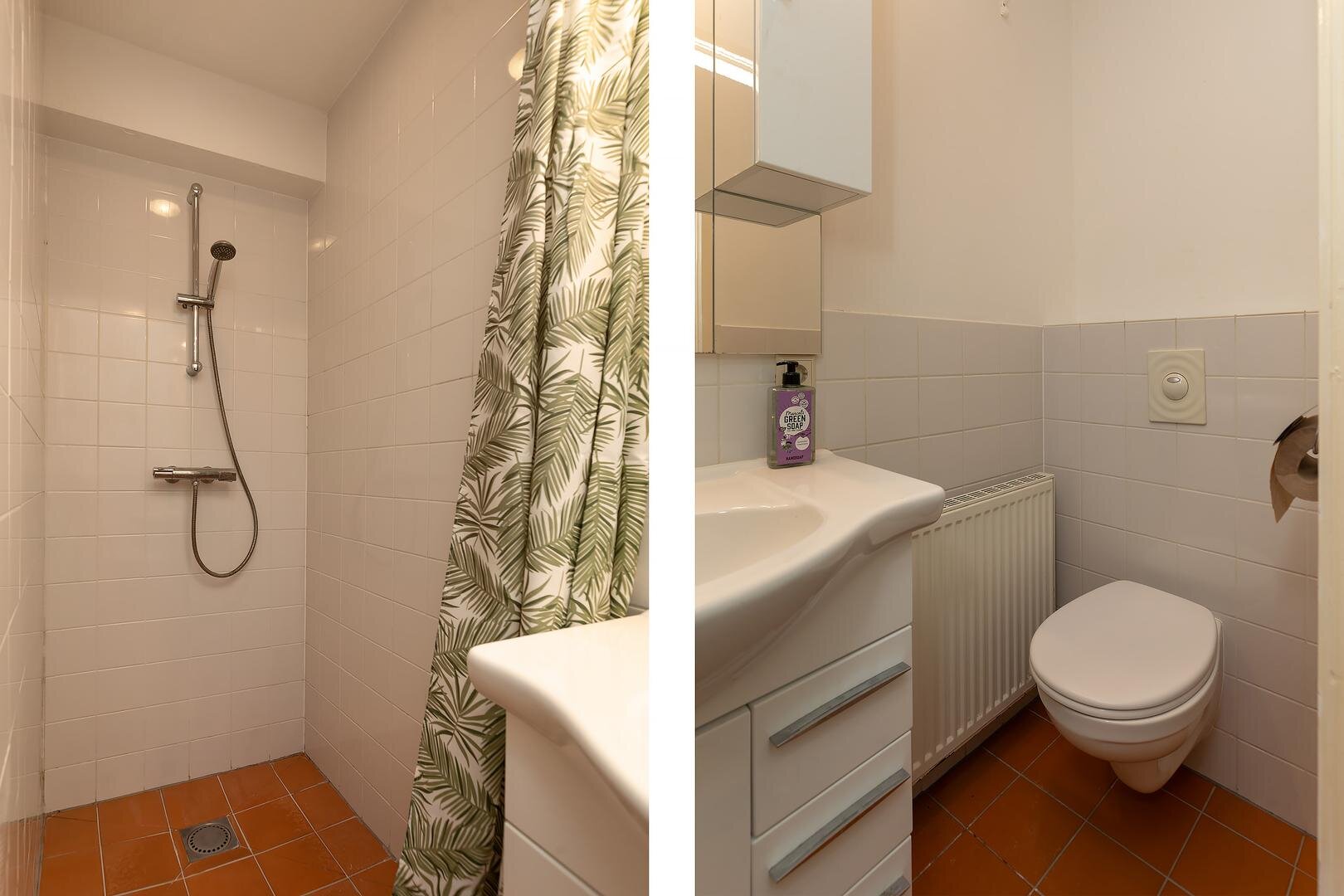 Aansluitend bereik je de keuken en de badkamer, voorzien van een douche, toilet en wastafelmeubel. Aan de tuinzijde bevindt zich de slaapkamer, rustig gelegen en met een directe deur naar de achtertuin — een heerlijke plek om de dag te beginnen of juist af te sluiten.