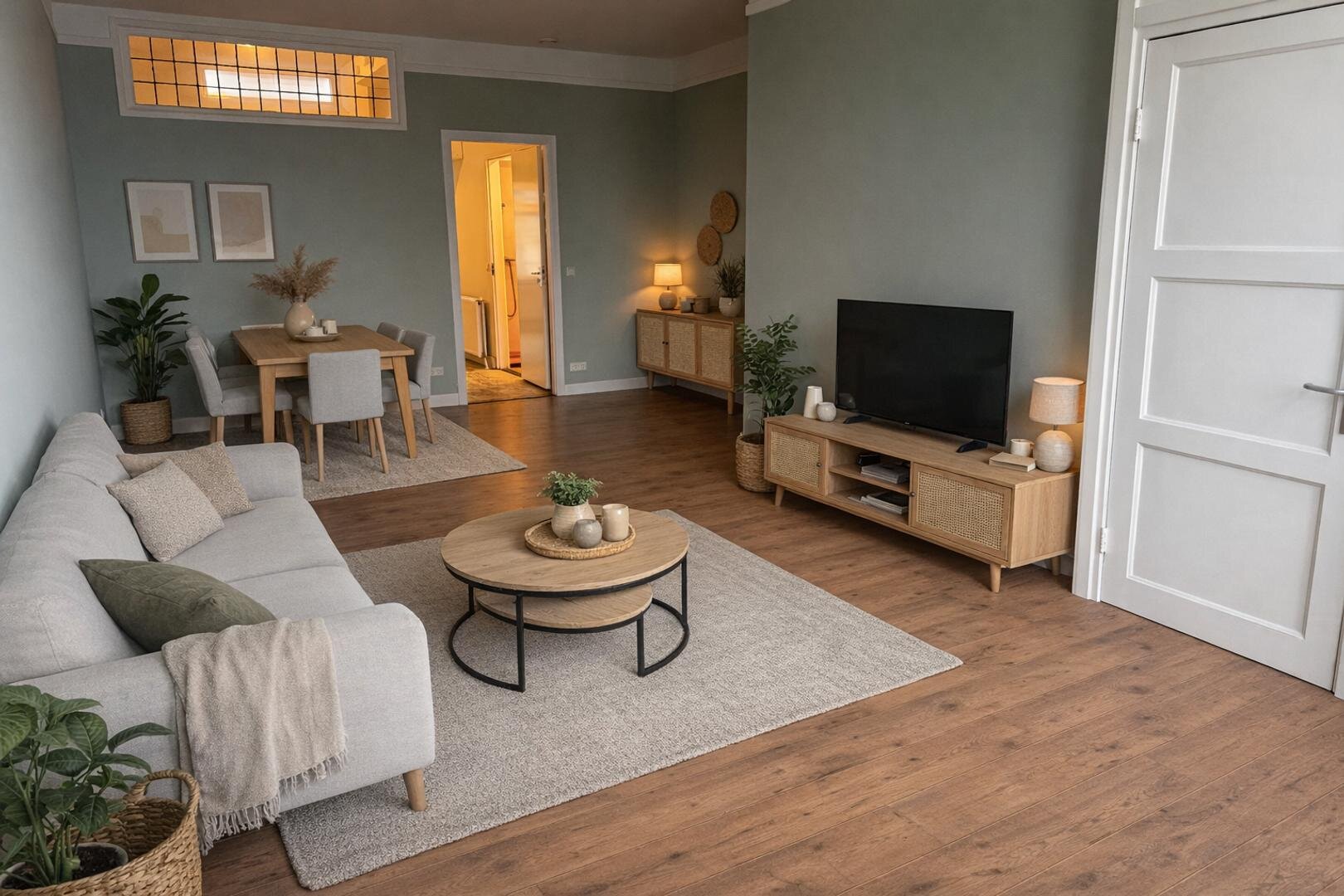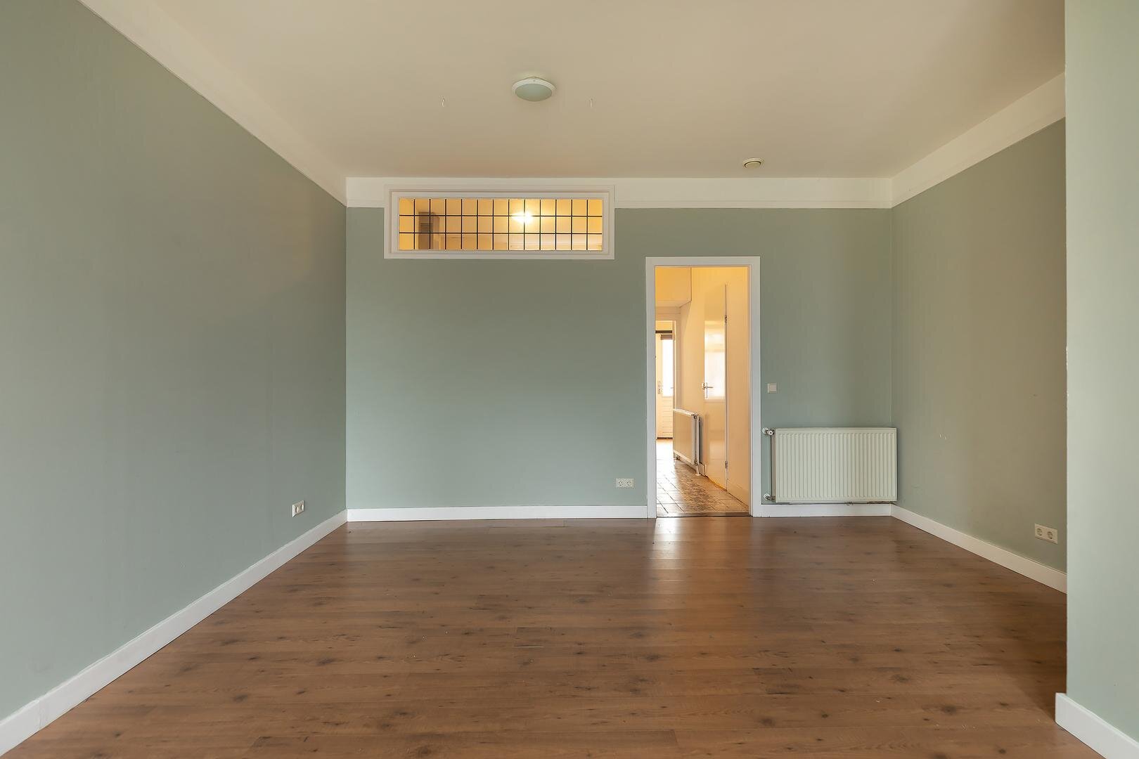 Via een gezamenlijk halletje kom je binnen in de woning. Vanuit hier stap je de ruime woon-/eetkamer in: een prettige leefruimte met volop mogelijkheden voor een royale zithoek en een fijne eettafel. De aanwezige trapkast zorgt voor extra bergruimte.