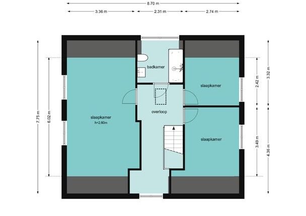 De overloop biedt toegang tot drie slaapkamers, waaronder een royale slaapkamer (circa 25 m2), ideaal als hoofdslaapkamer en twee slaapkamers respectievelijk circa 12 m2 en 9 m2 groot, beide met voldoende licht en ruimte. De badkamer is uitgerust met een ligbad/douche, wastafel en derde toilet.