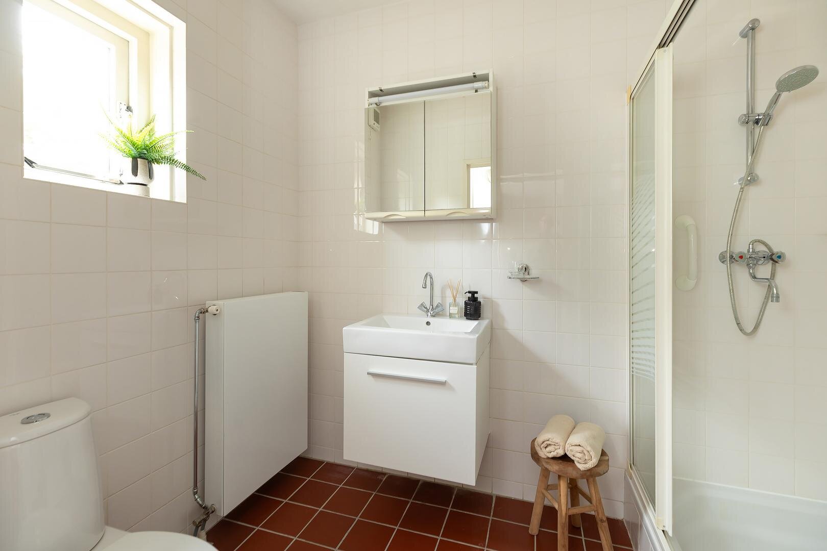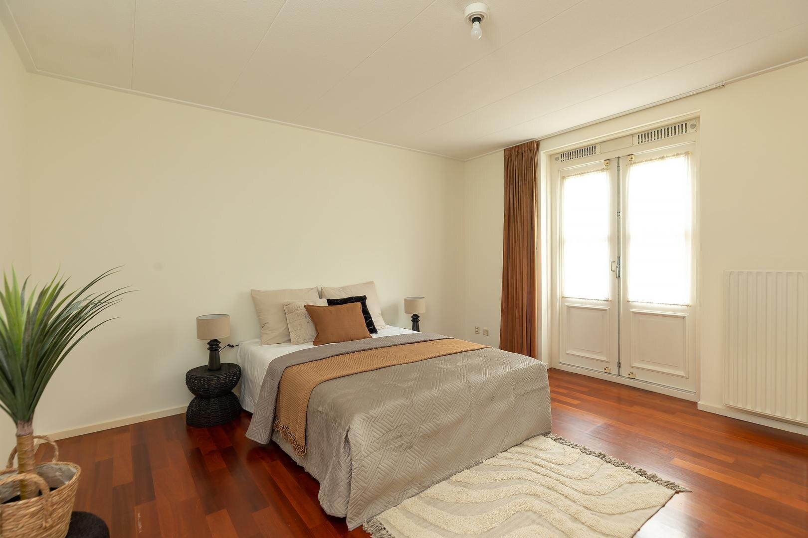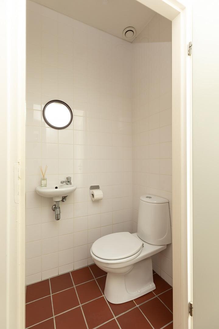 werkkamer. Aan de achterzijde is toegang tot de separate slaapkamer (circa 16 m2), met openslaande deuren naar de zijtuin en een deur naar de badkamer, uitgerust met douche, tweede toilet en wastafelmeubel.