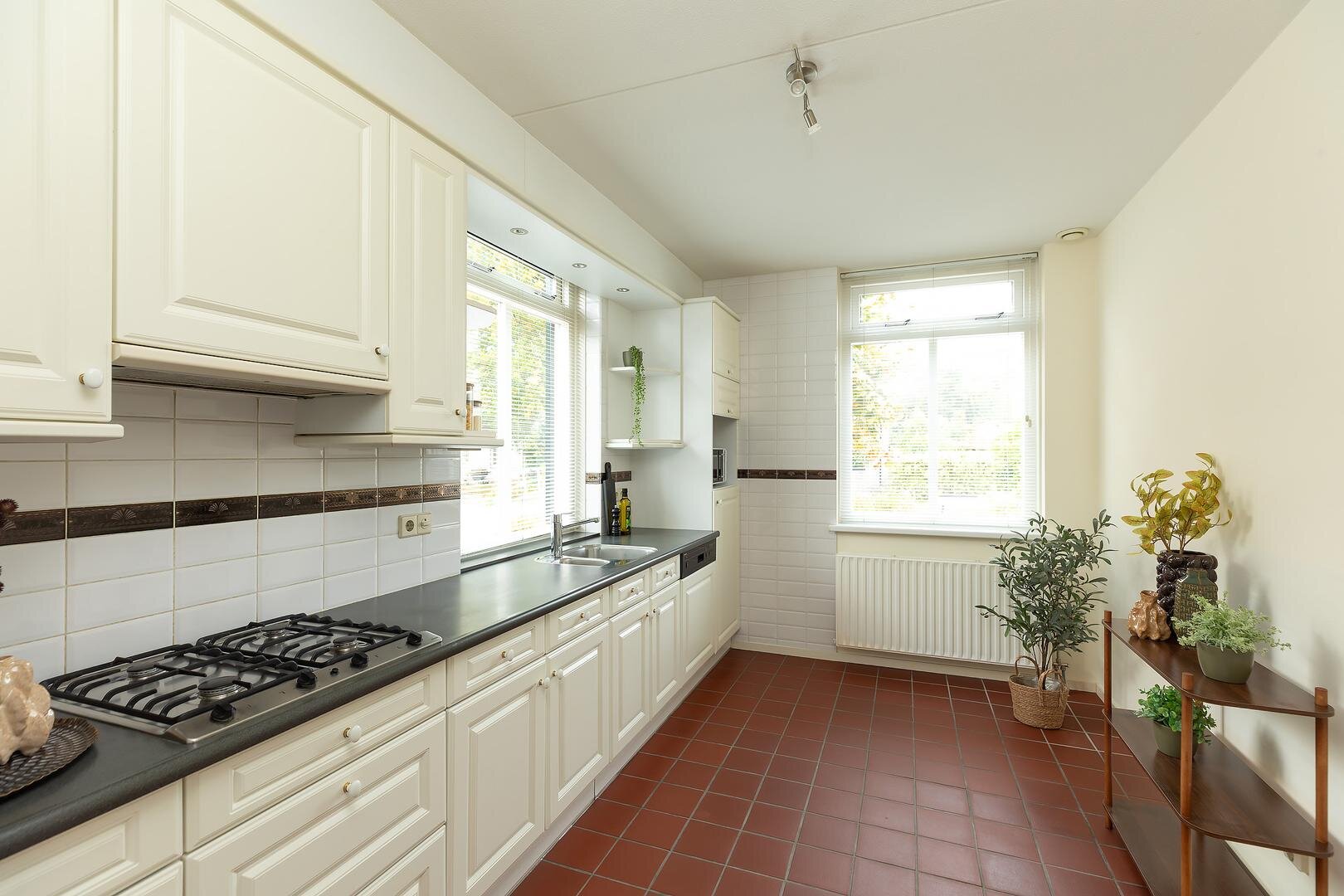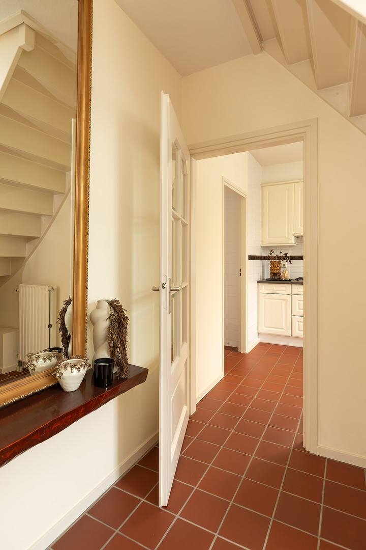 De hal aan de voorzijde biedt tevens toegang tot de dichte keuken, voorzien van dubbele spoelbak, koelkast, gaskookplaat, afzuigkap en vaatwasser. Ook is er een deur naar de bijkeuken aanwezig, waar de wasmachine en droger opgesteld kunnen worden. Tevens is er een spoelbak en een ruimte met de cv-opstelling. Vanuit deze bijkeuken is er direct toegang via de zijdeur naar de oprit/tuin.