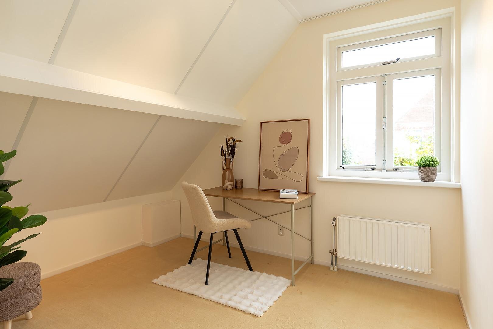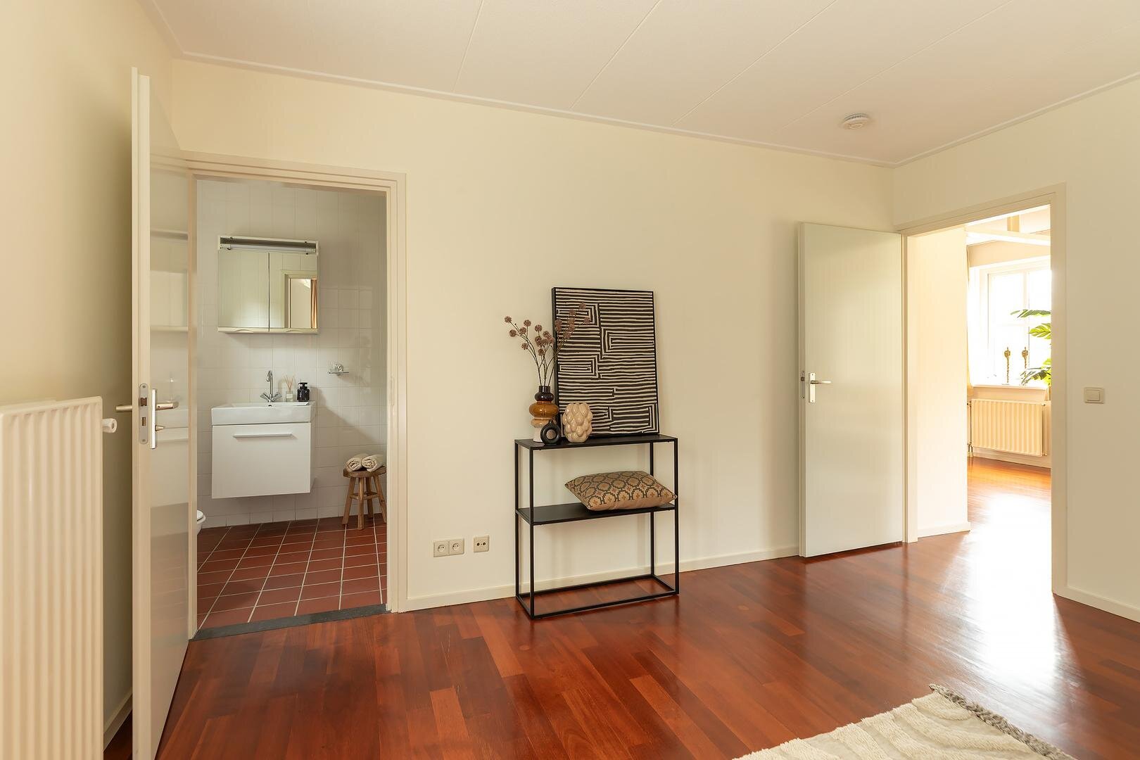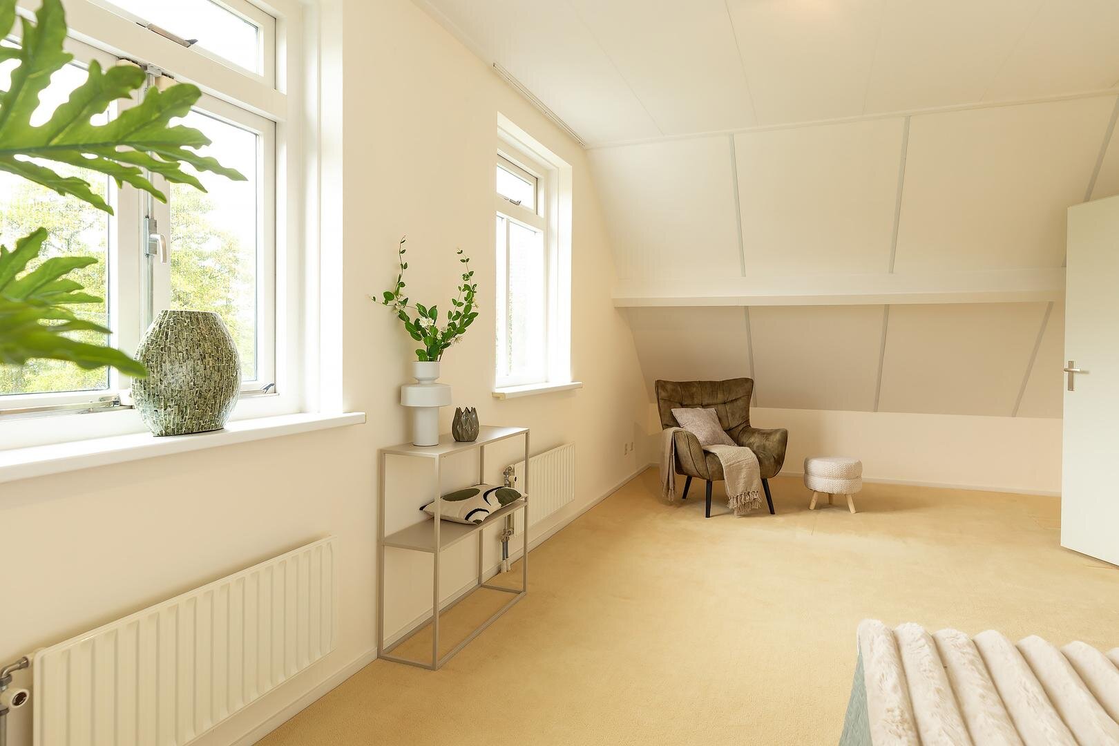 De overloop biedt toegang tot drie slaapkamers, waaronder een royale slaapkamer (circa 25 m2), ideaal als hoofdslaapkamer en twee slaapkamers respectievelijk circa 12 m2 en 9 m2 groot, beide met voldoende licht en ruimte. De badkamer is uitgerust met een ligbad/douche, wastafel en derde toilet.