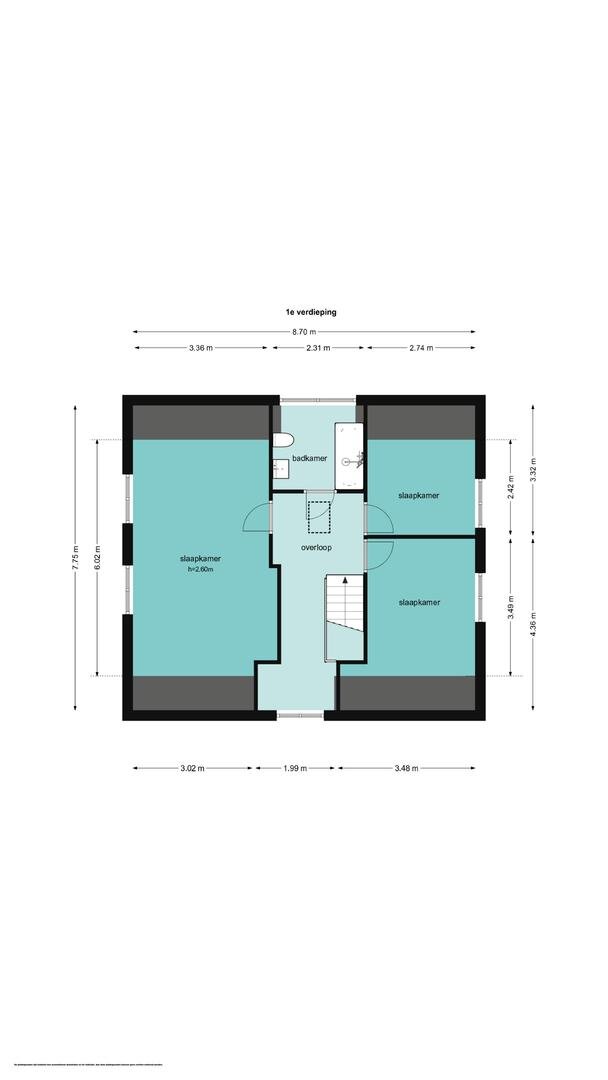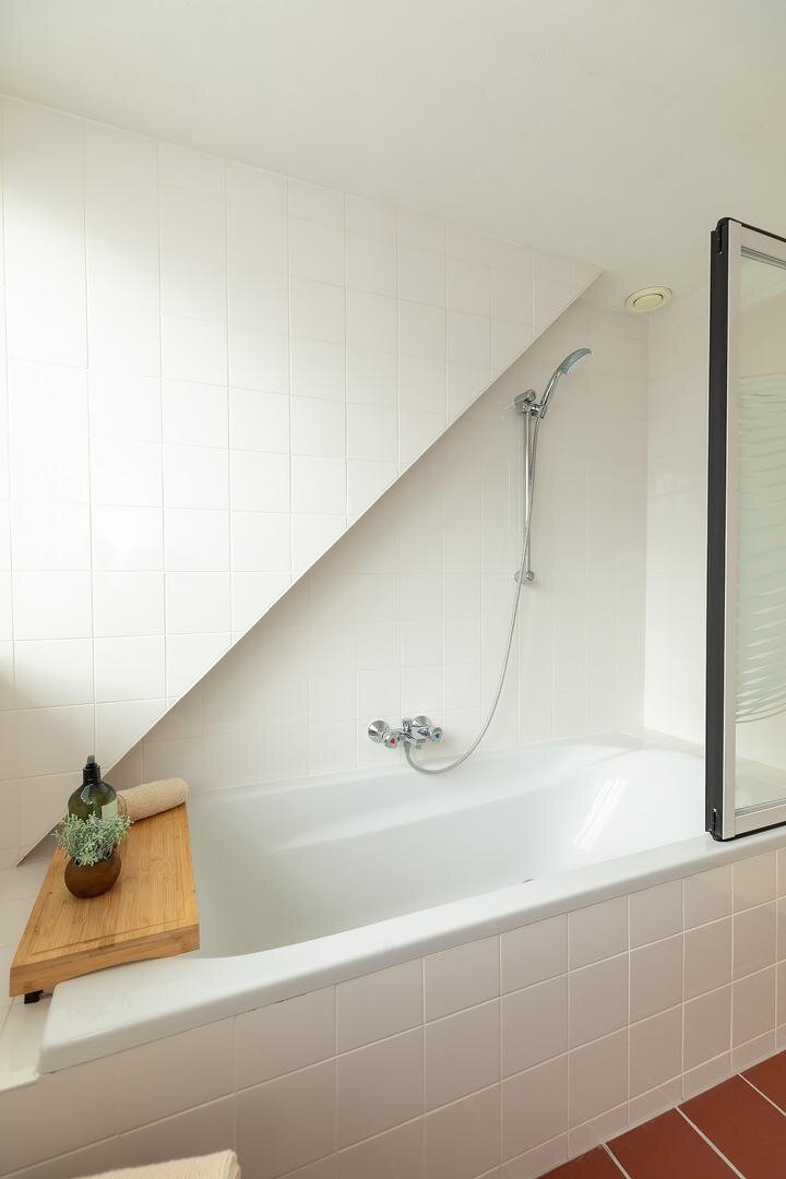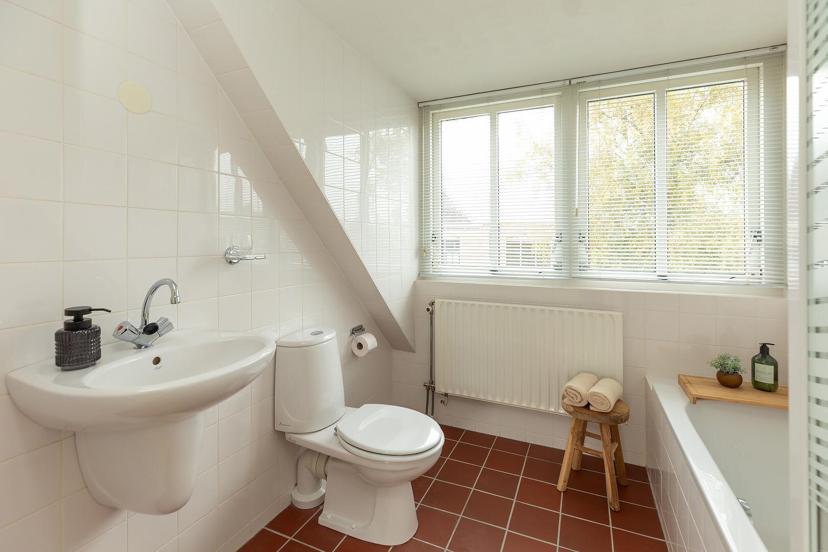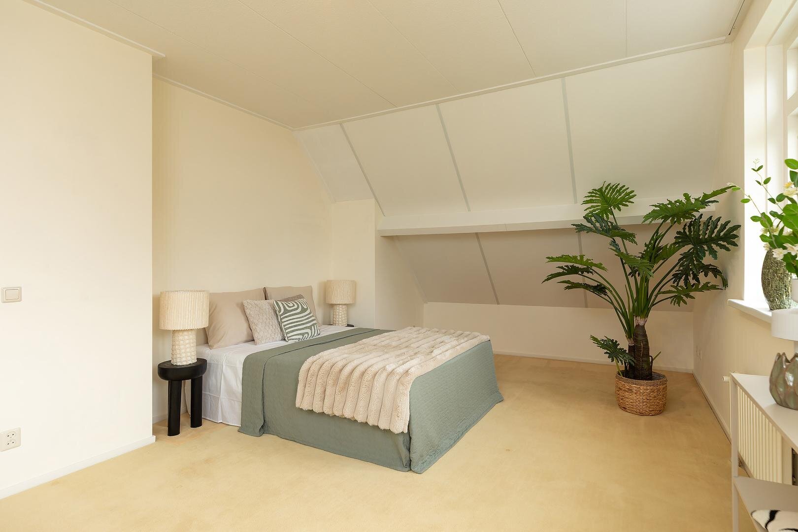 De overloop biedt toegang tot drie slaapkamers, waaronder een royale slaapkamer (circa 25 m2), ideaal als hoofdslaapkamer en twee slaapkamers respectievelijk circa 12 m2 en 9 m2 groot, beide met voldoende licht en ruimte. De badkamer is uitgerust met een ligbad/douche, wastafel en derde toilet.