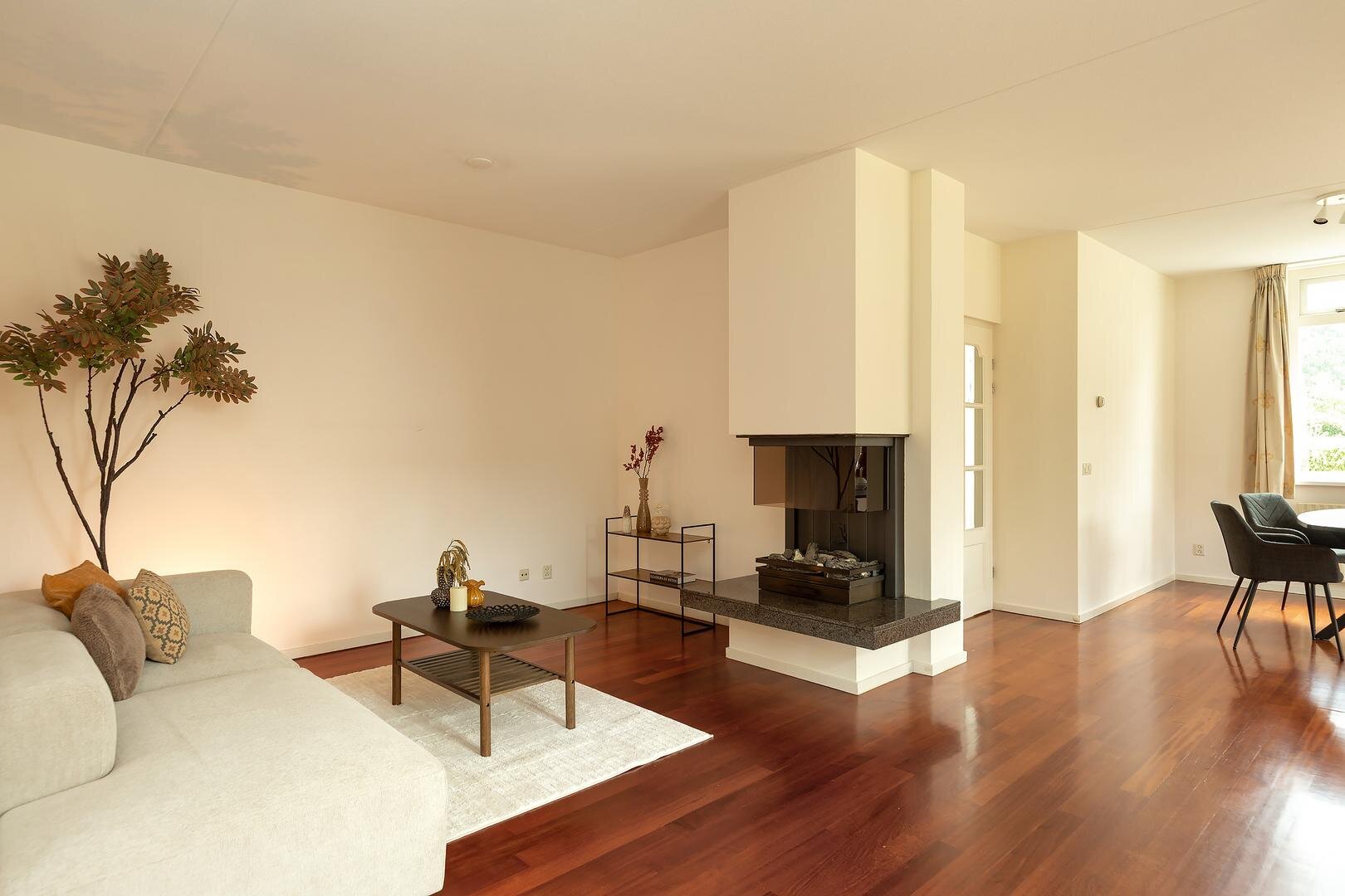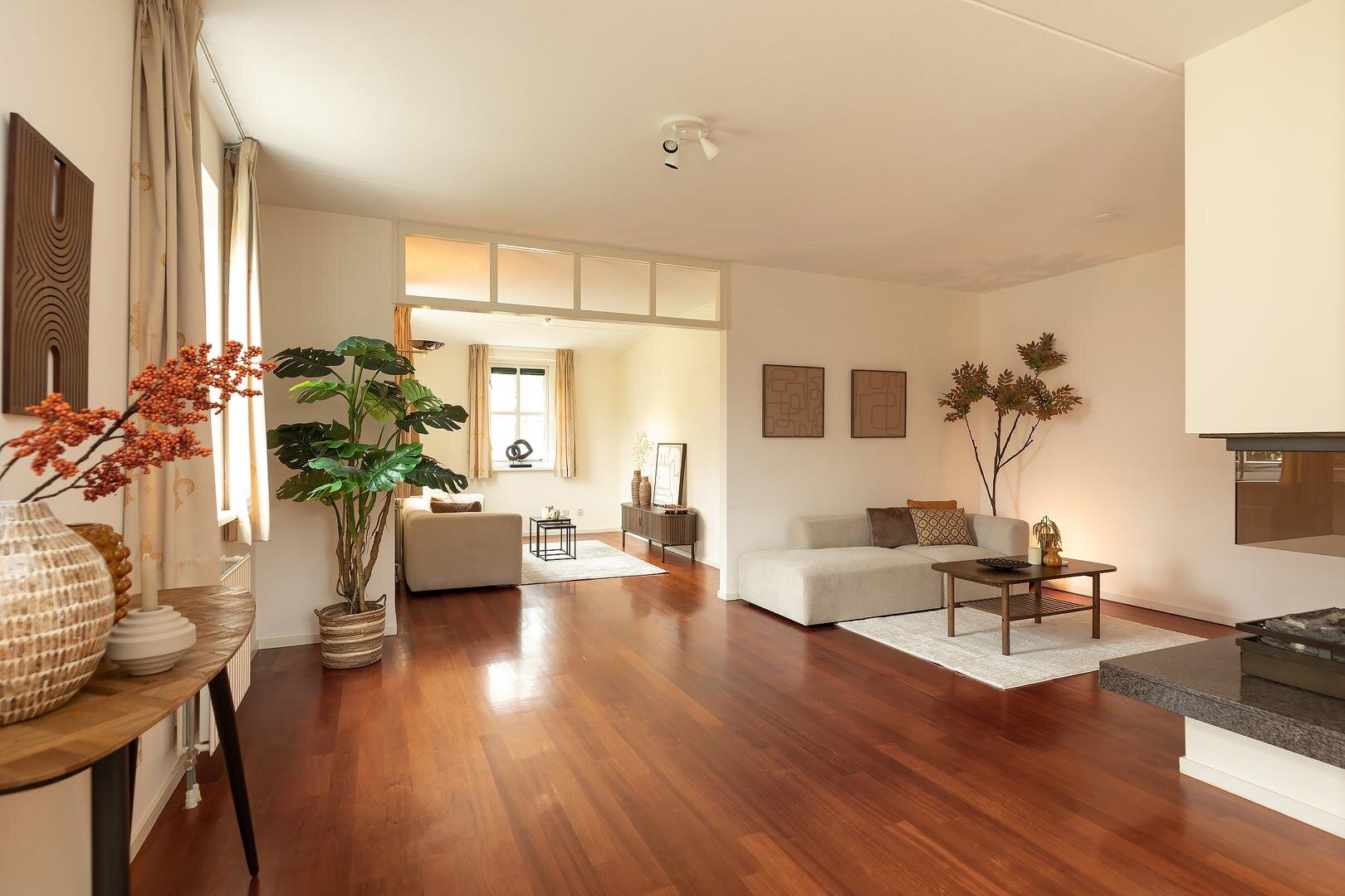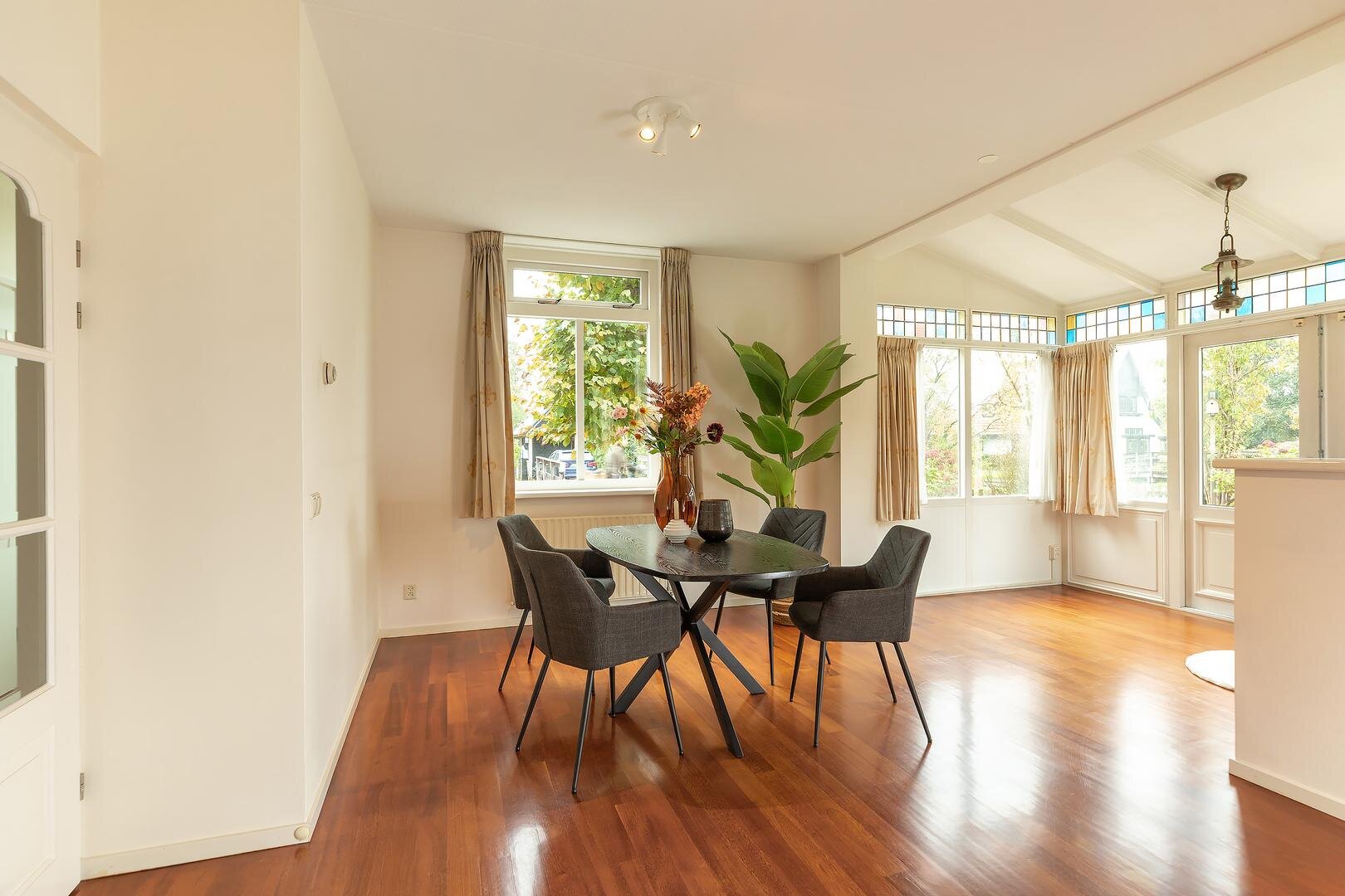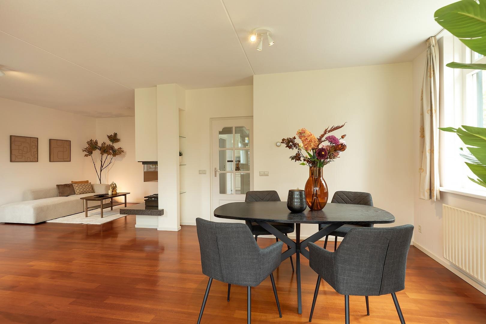 binnenvalt, biedt goed zicht op de tuin en is open, maar toch goed indeelbaar in separate eet-, zit-, lees- en/of
