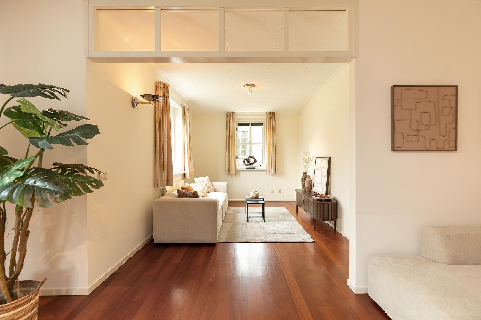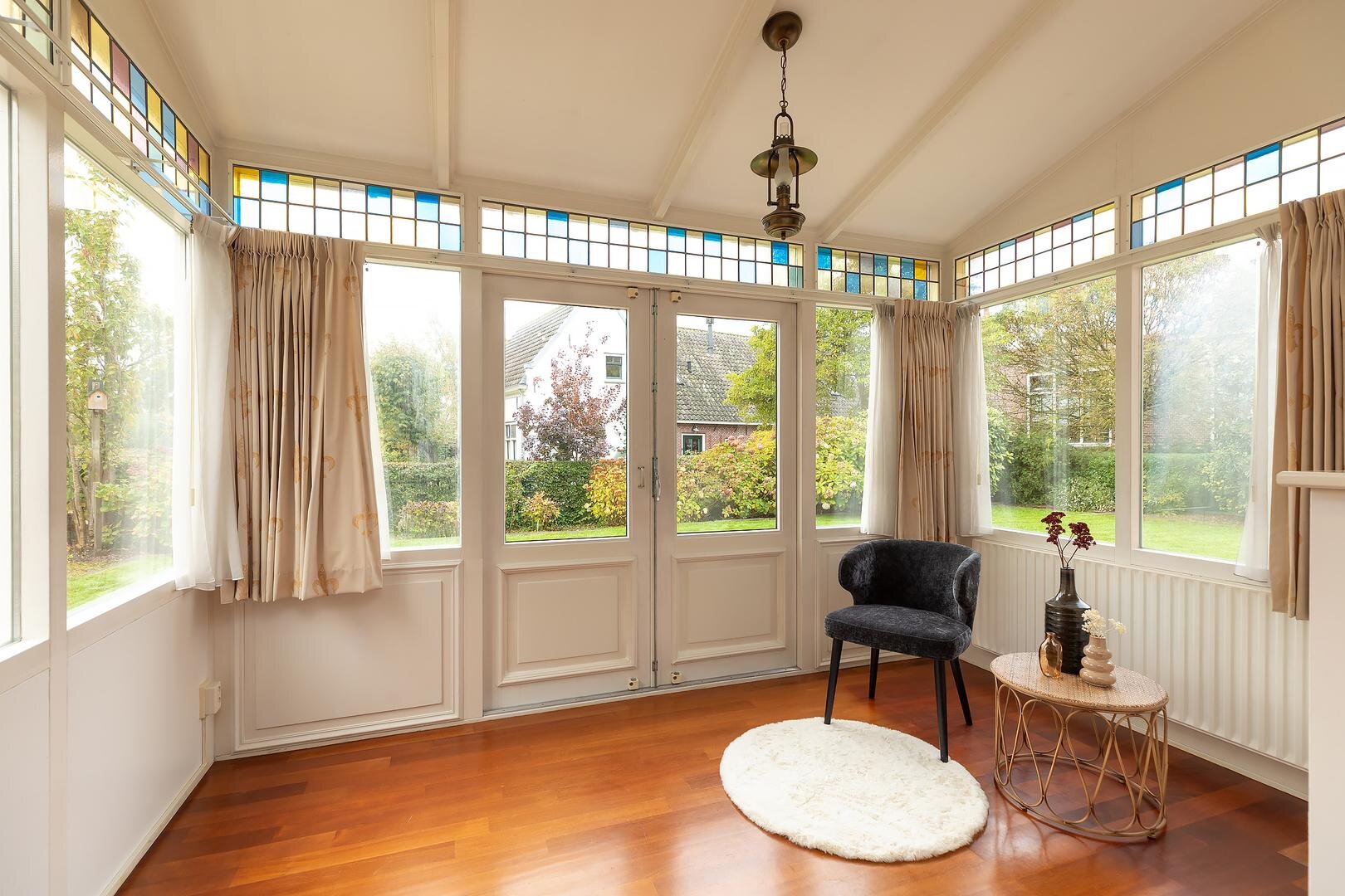 openslaande deuren naar de tuin. Deze sfeervolle leefruimte heeft grote raampartijen, waardoor er veel daglicht
