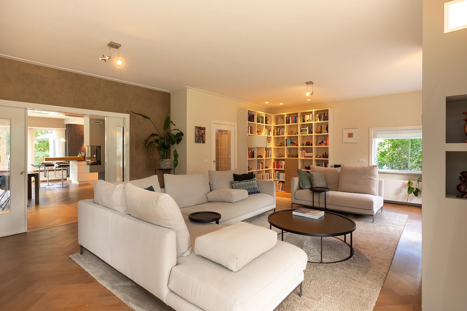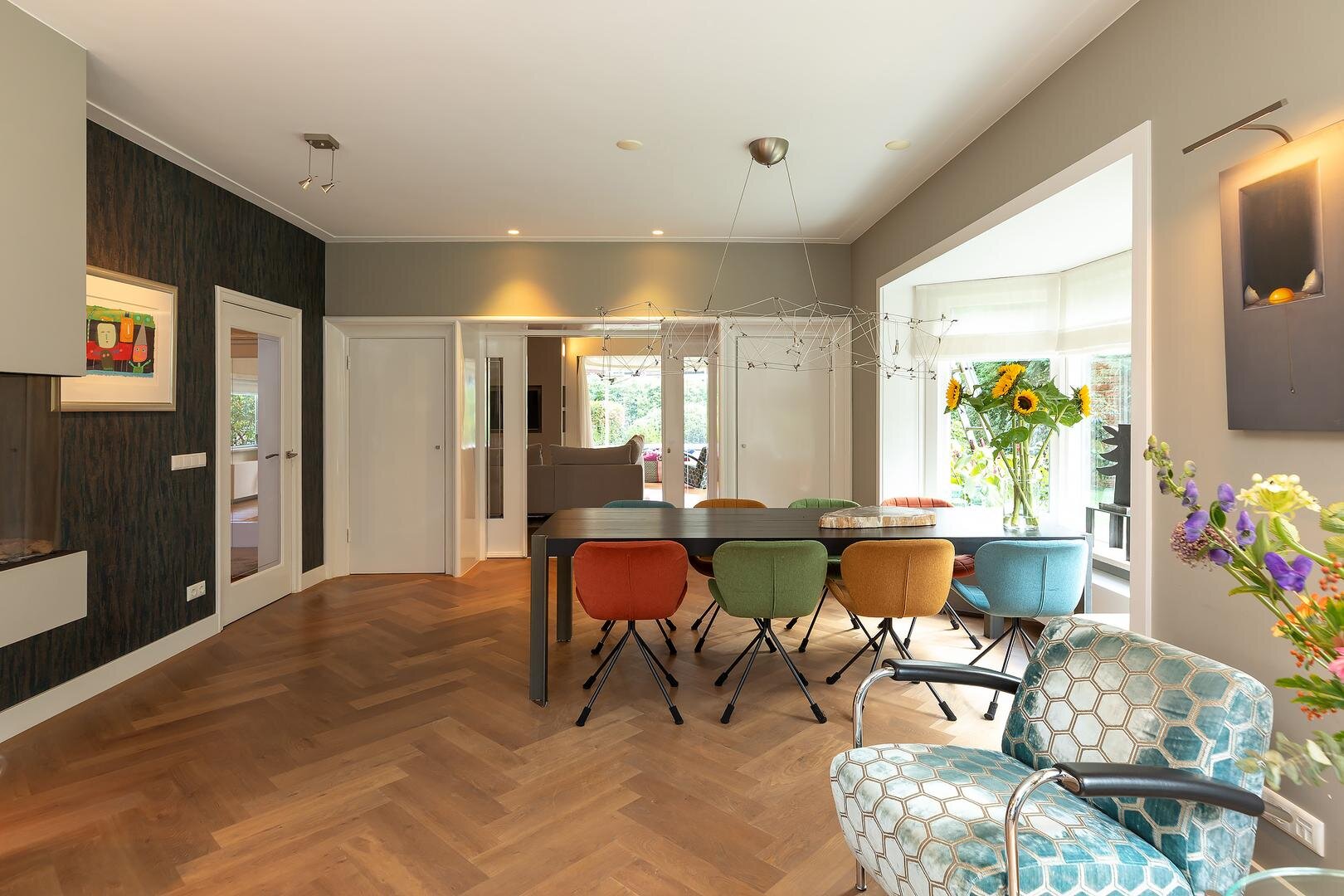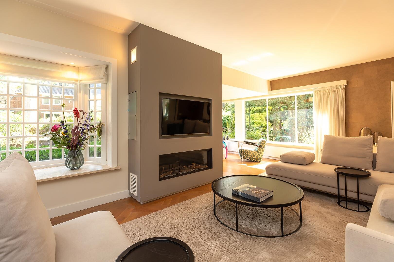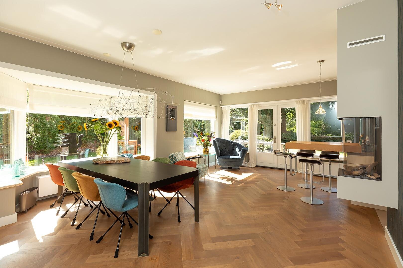 • Lichte woonkamer met grote ramen en erker, sfeervolle gashaard en overgang via kamer-en-suite deuren naar eetkamer en keuken