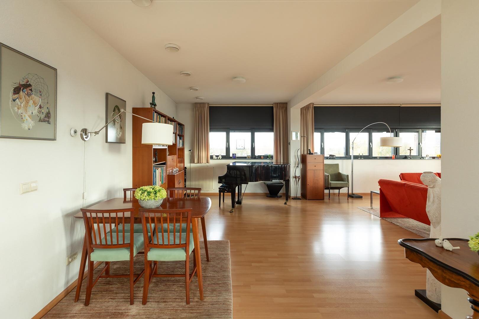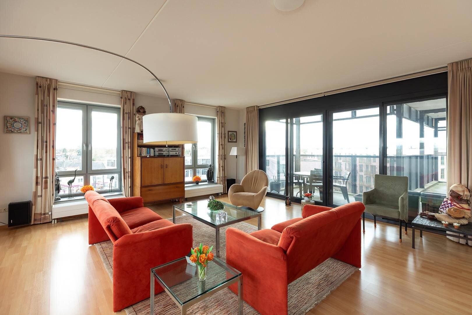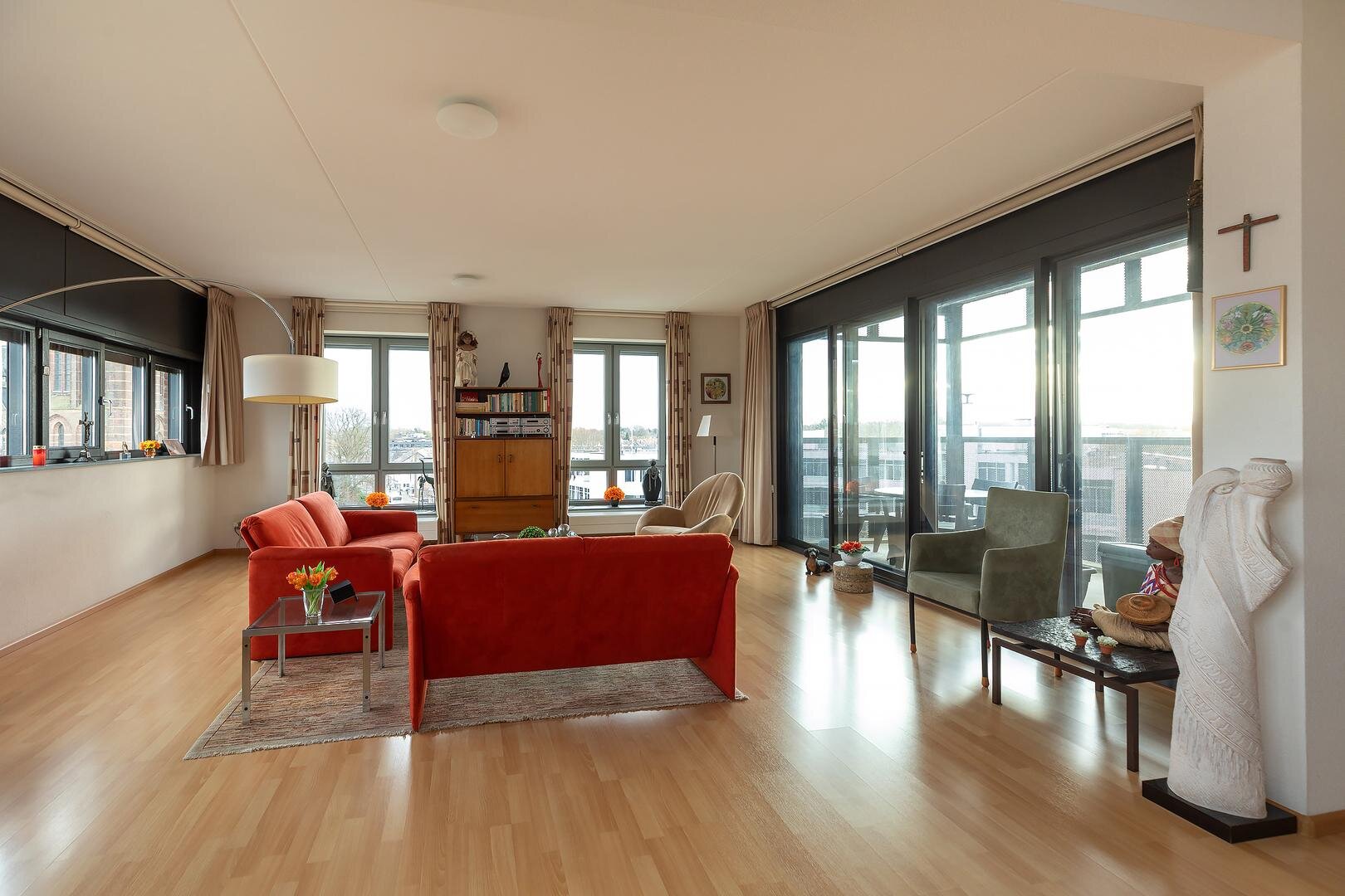 Midden in het centrum van Hilversum, op loopafstand van het NS-station en tegenover het rijksmonumentale Grand Hotel Gooiland én de majestueuze Sint Vituskerk gelegen royaal en energiezuinig (label A!) 4-kamer appartement. Dit heerlijke goed onderhouden appartement is gelegen op de vijfde verdieping van een modern appartementencomplex en beschikt over een eigen parkeerplaats in afgesloten parkeerkelder en een berging op de begane grond. Met een woonoppervlak van 121 m² en een ruim L-vormig balkon van 20 m2 is de leefruimte royaal, en met 3 slaapkamers ook praktisch ingericht.