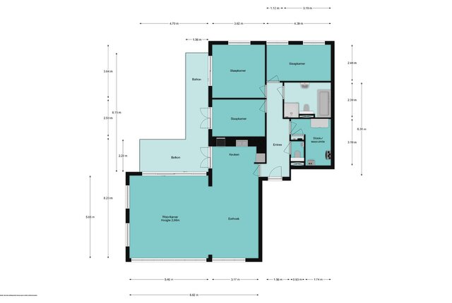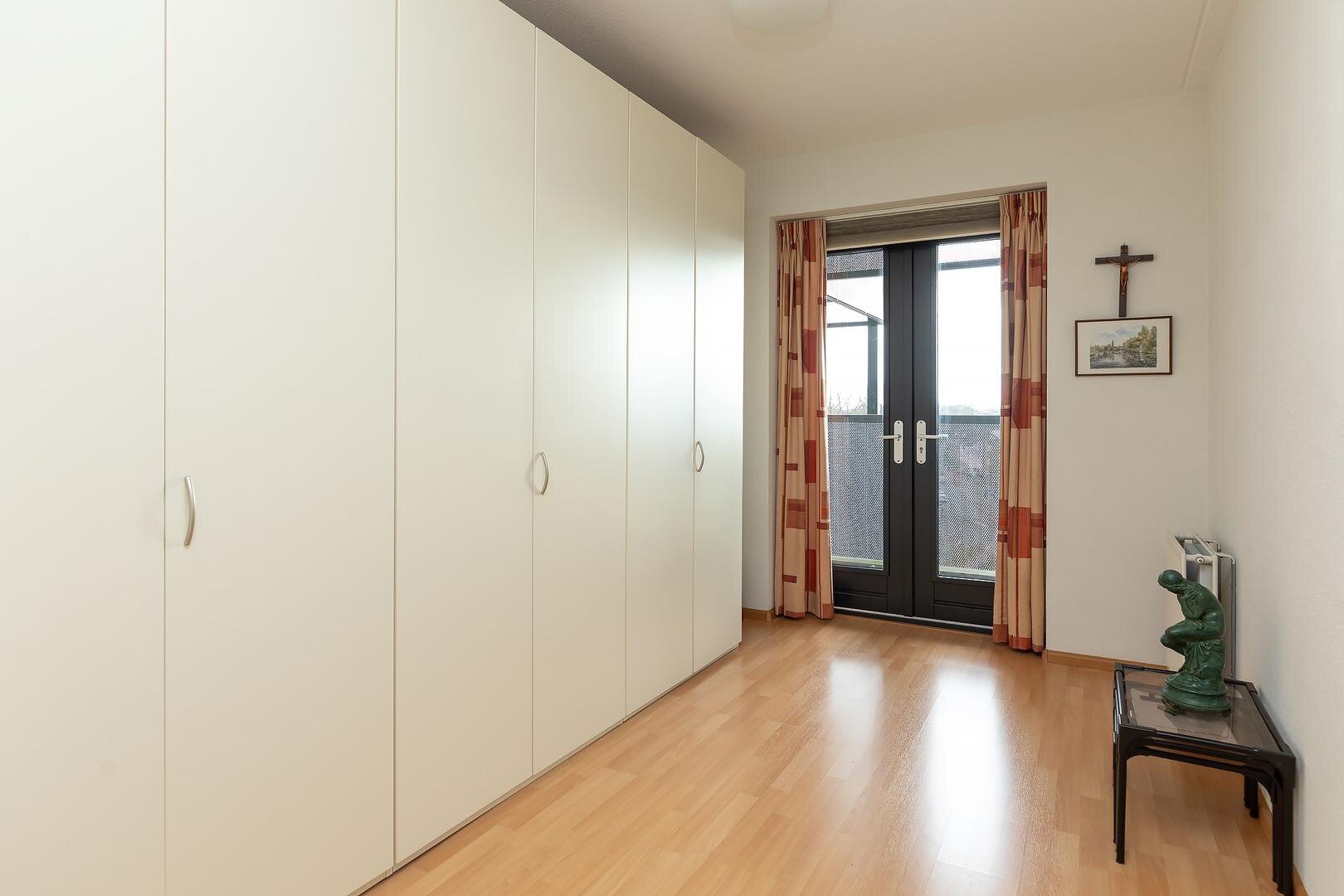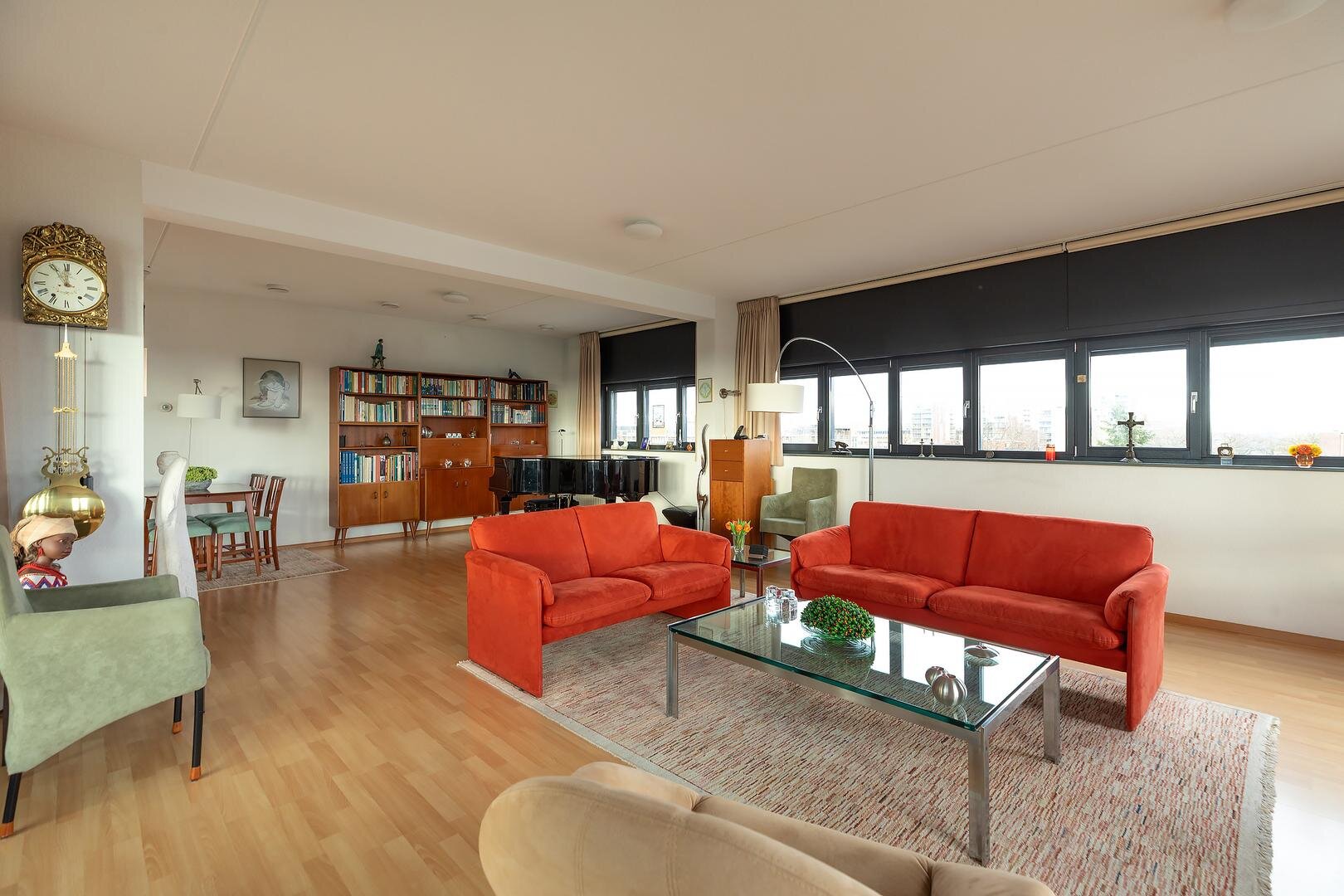 Indeling: entree/hal met toilet met fonteintje, zeer royale en lichte woon-/eetkamer met prachtig panoramisch uitzicht over Hilversum aan 3 zijden en schuifpui naar zonnig balkon op het zuidwesten. Open keuken in L-opstelling voorzien van inbouwapparatuur en openslaande deuren naar het balkon. Vanuit de hal toegang tot de 3 slaapkamers (groot 13, 11 en 9 m2) waarvan de hoofdslaapkamer met schuifpui, en de kleinste kamer met openslaande deuren naar balkon. De complete badkamer is voorzien van ligbad, douche, wastafelmeubel en 2e toilet. Separate stook-/wasruimte met aansluiting wasmachine, c.v.-opstelling, WTW-installatie en bergruimte. Het gehele appartement is voorzien van een laminaatvloer.