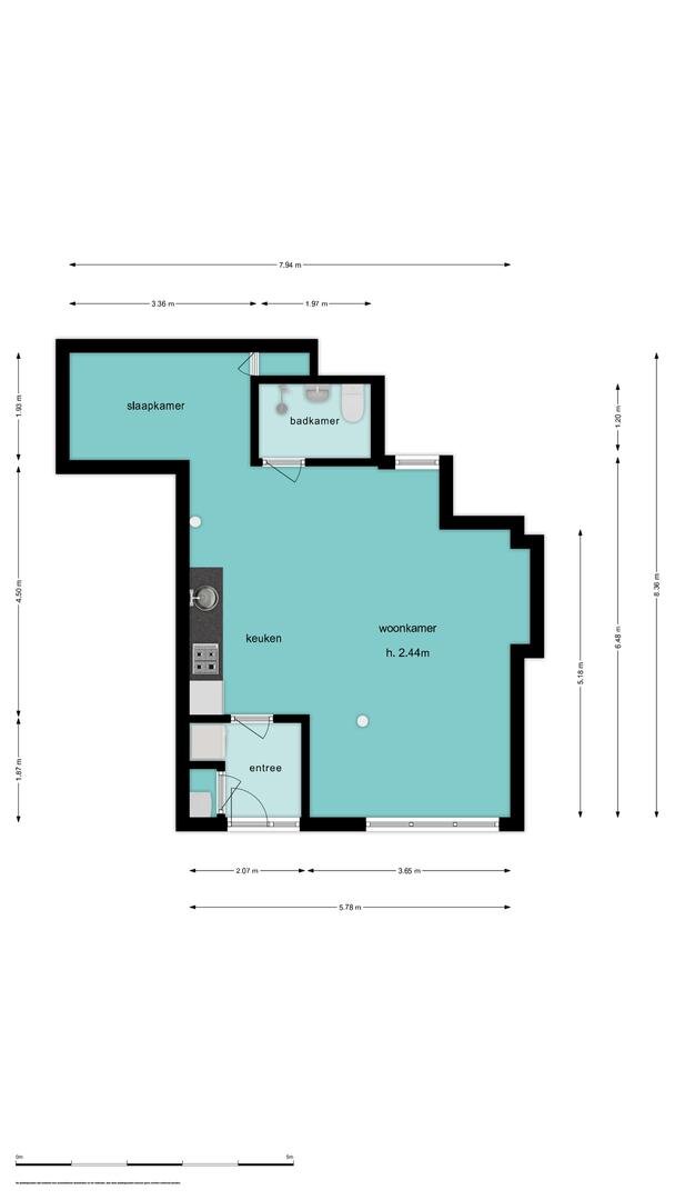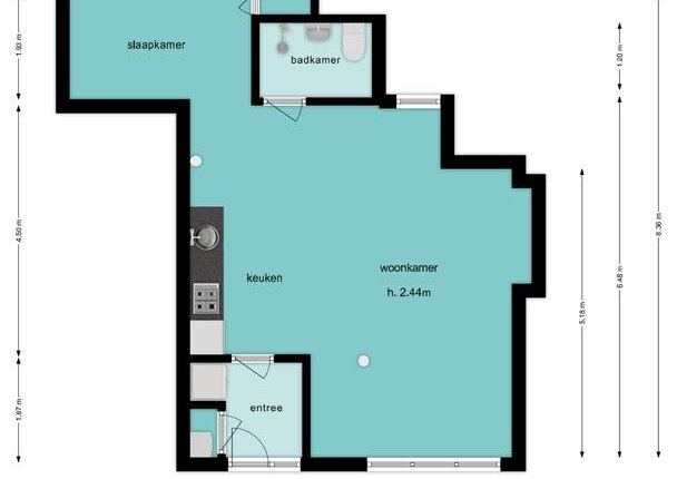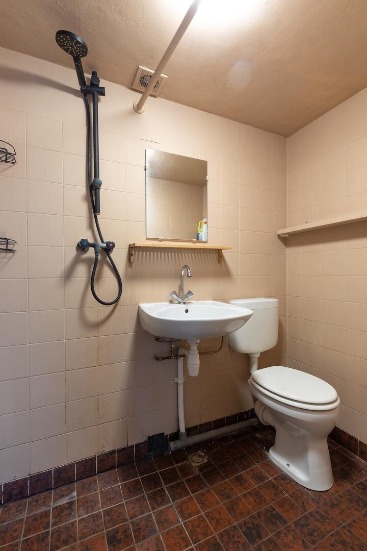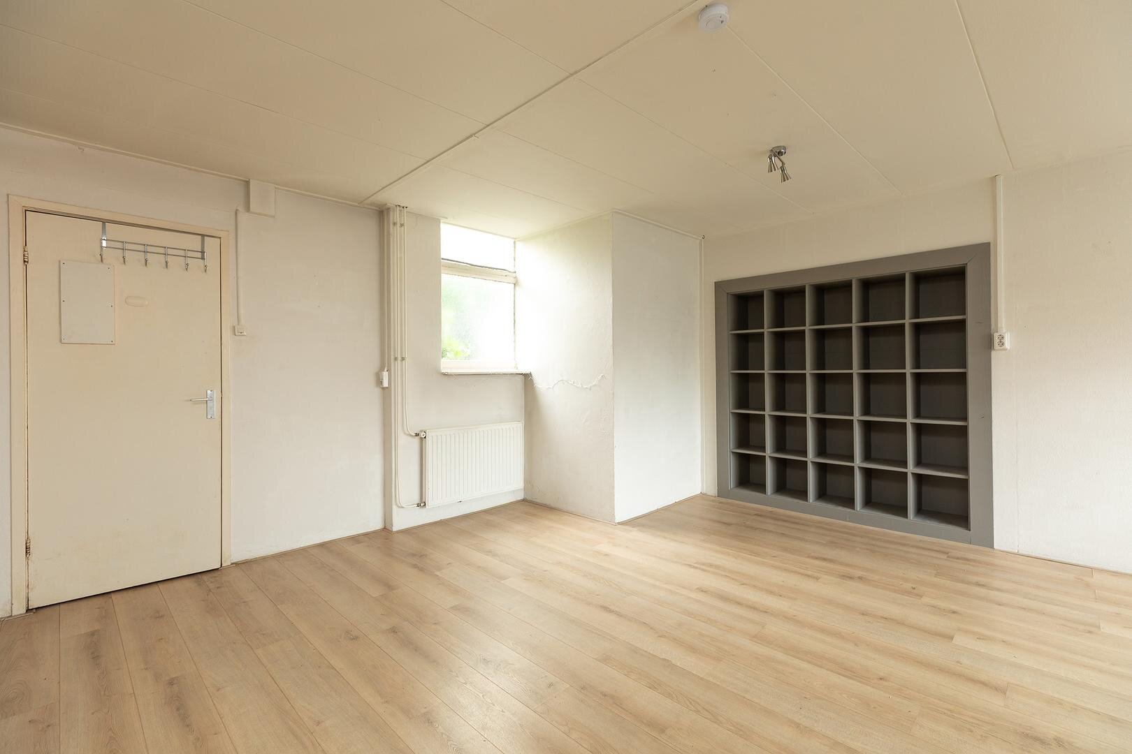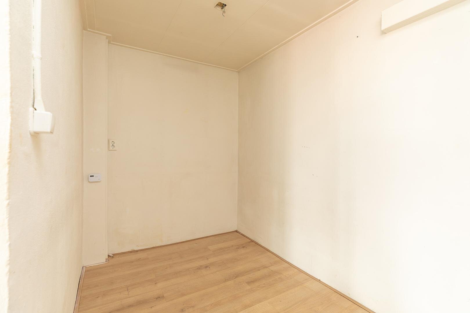 Entree met c.v.-ketel en meterkast, fijne ruimte met open keuken en ‘slaaphoek’, badkamer met douche, wastafel en toilet.
