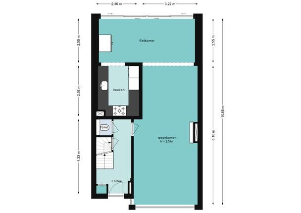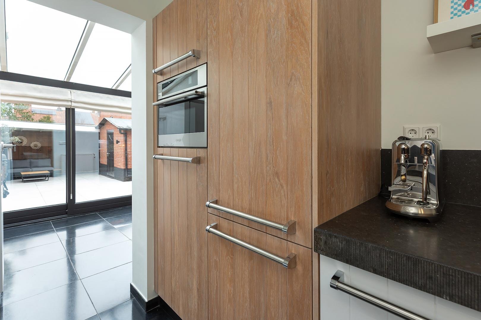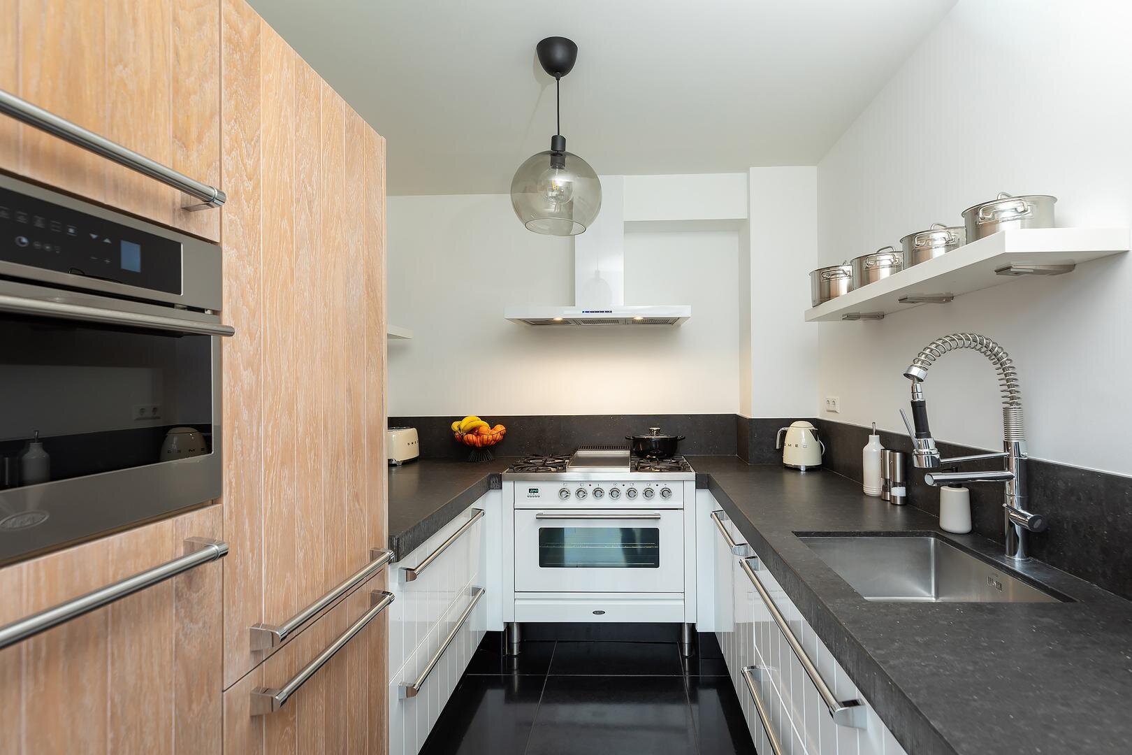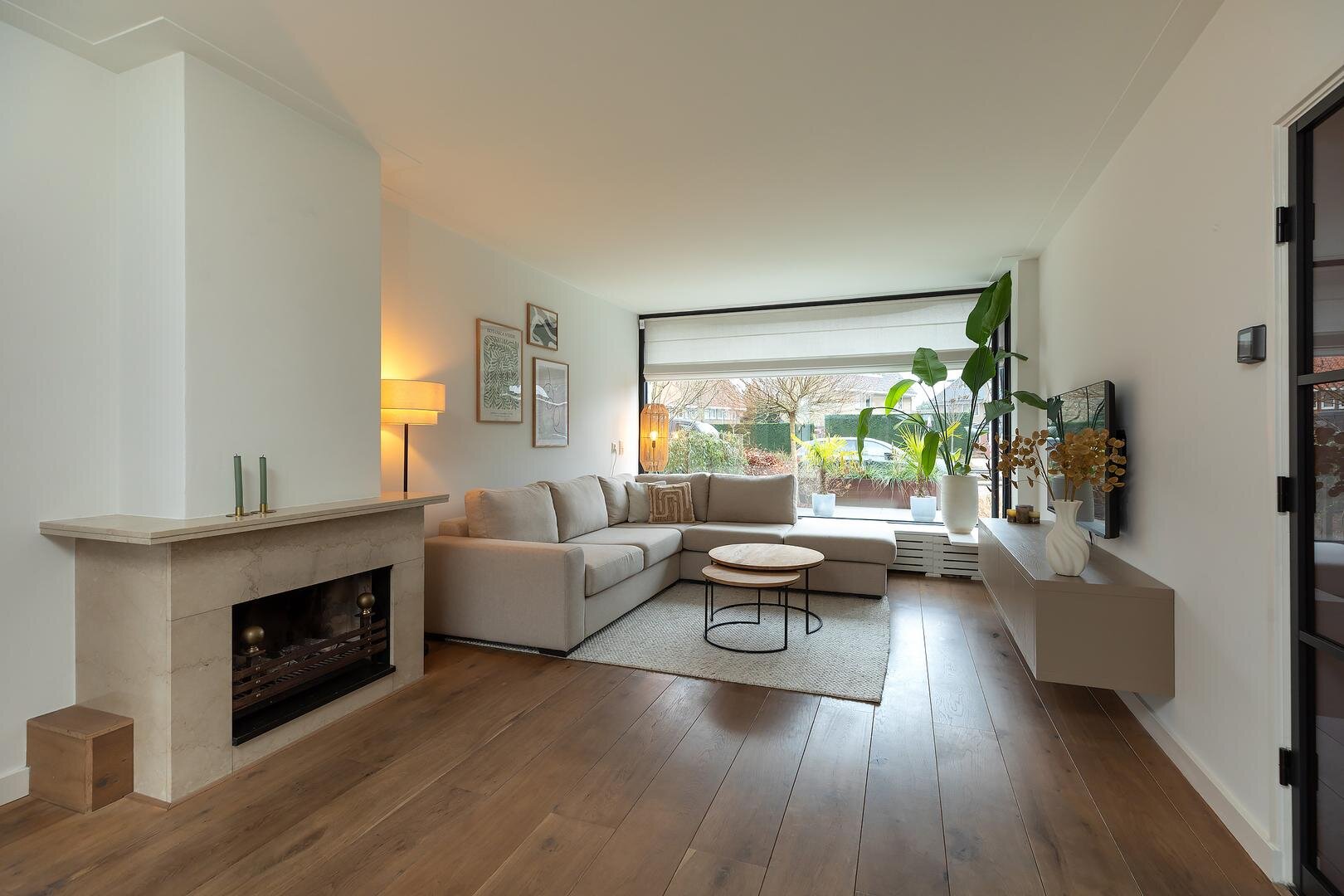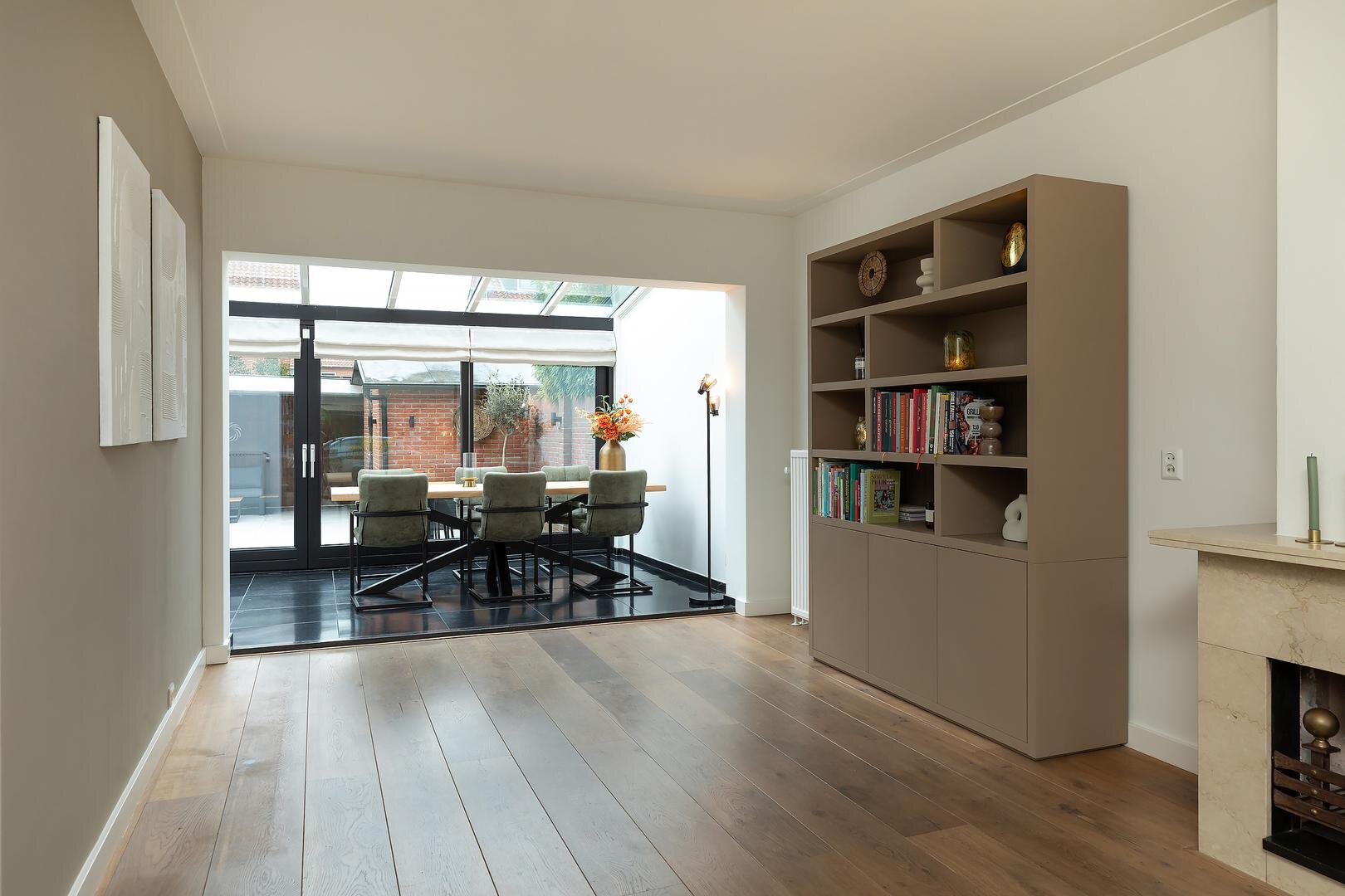 Entree, hal, modern toilet met fonteintje, toegang naar het riante souterrain, toegang middels stoere taatsdeur naar de uitgebouwde woonkamer met houten vloerdelen en gezellige openhaard. De uitbouw is voorzien van een lichtstraat, natuurstenen vloer met vloerverwarming en een dubbele schuifpui naar de tuin. De keuken is van hoge kwaliteit met een Boretti combi- oven/magnetron, XL koel-/vriescombinatie van Boretti, 6-pits Boretti gasfornuis met hete lucht oven, vaatwasser Bosch, en Belgisch hardstenen blad.