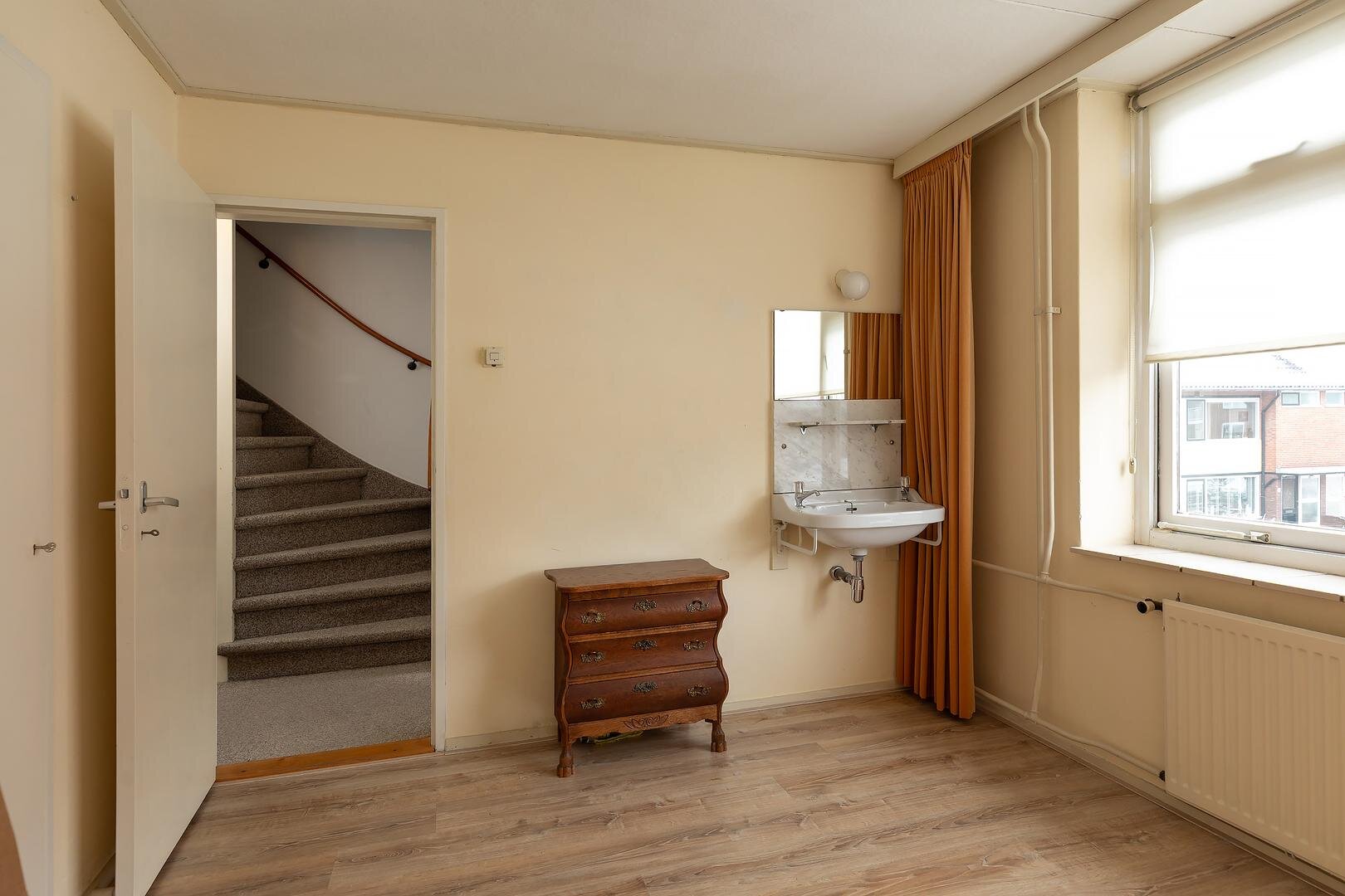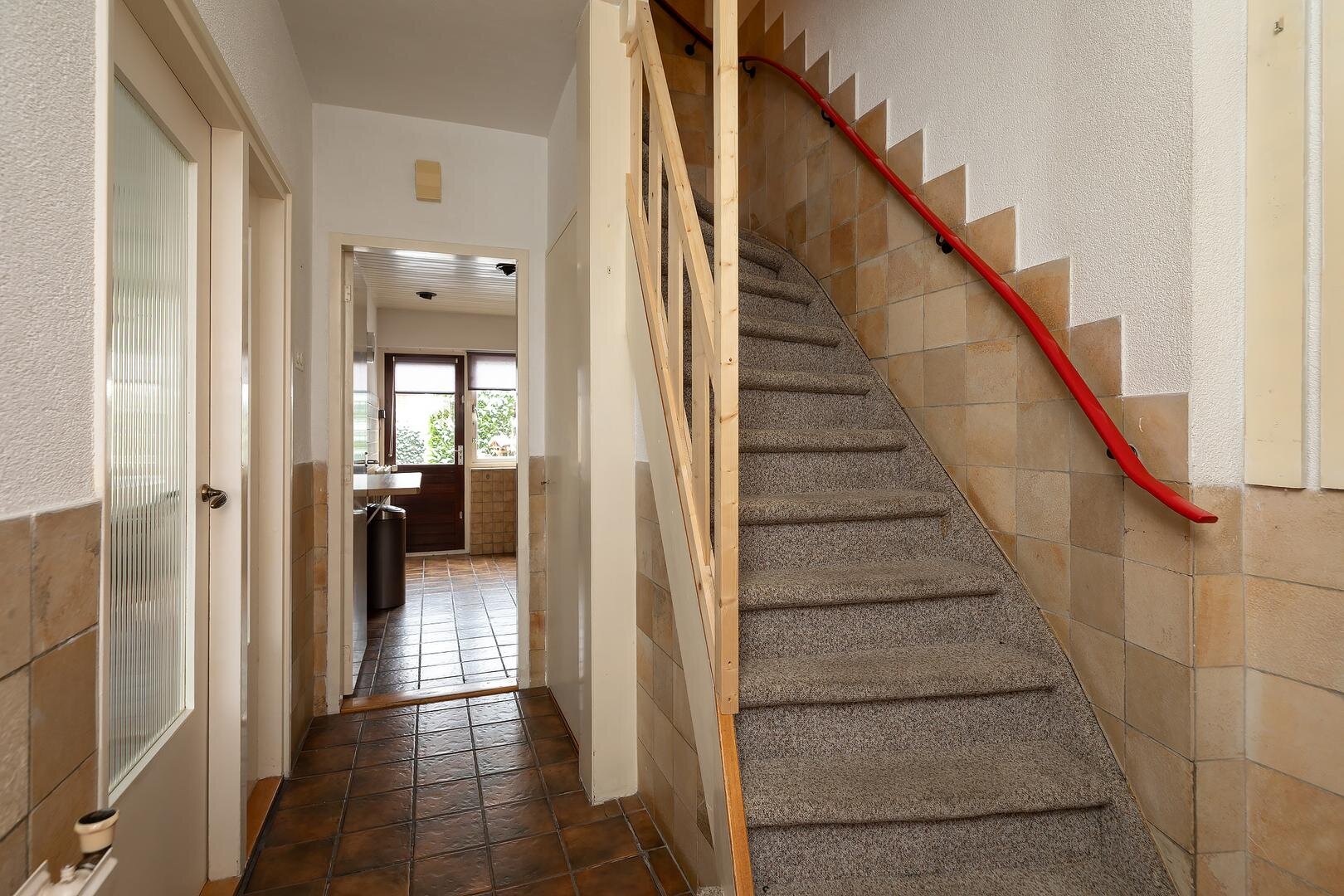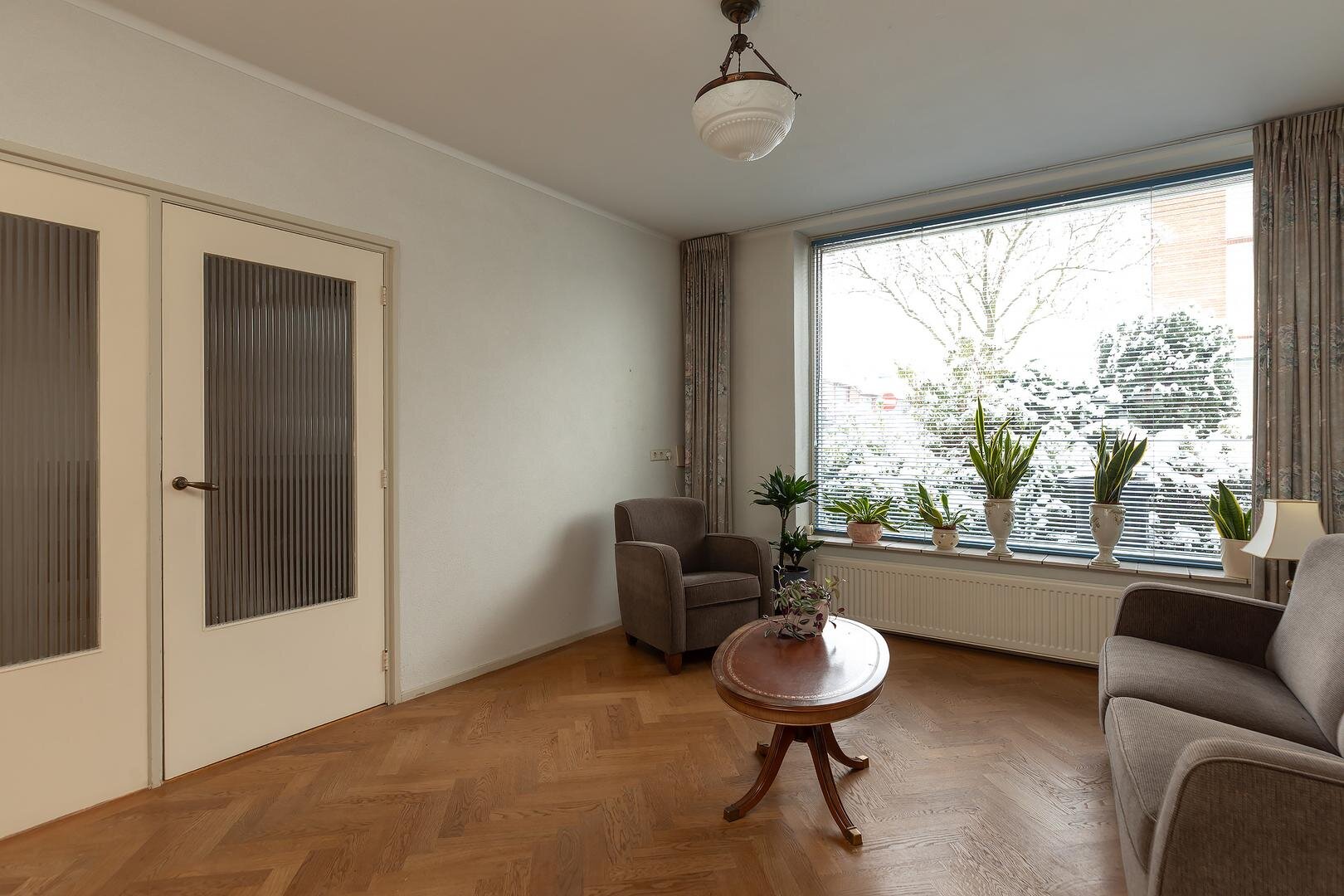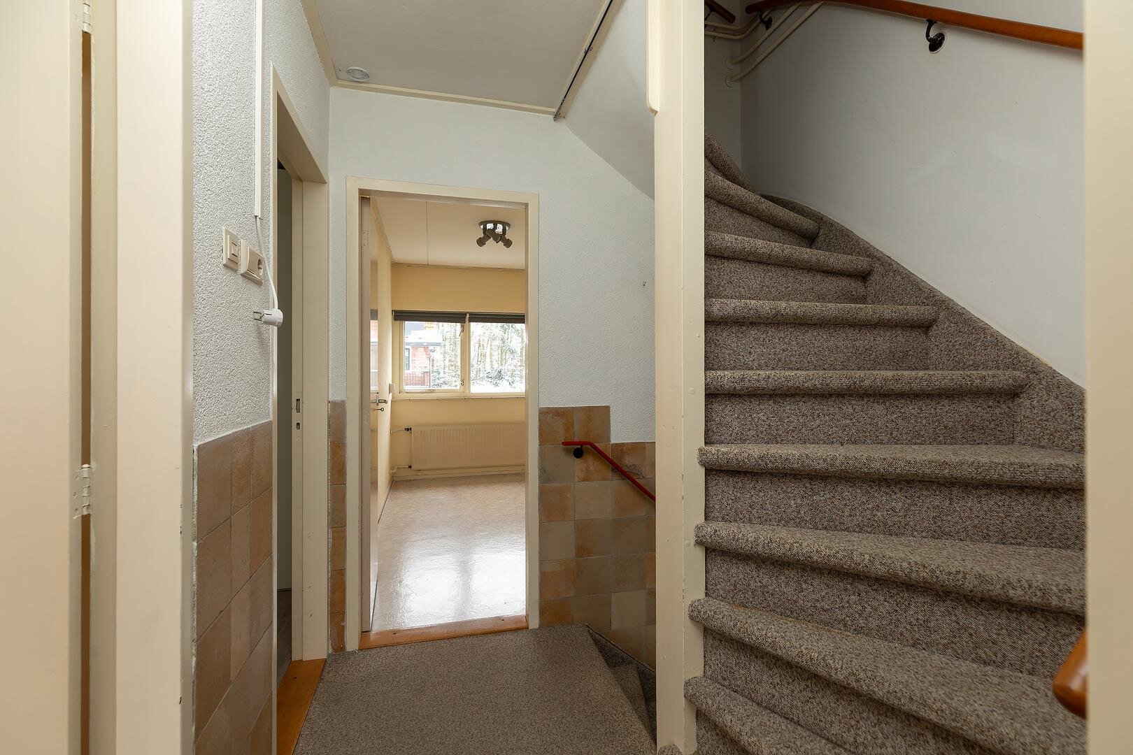 Entree/hal, toilet met fonteintje, verdiepte kelderkast met meterkast, gesloten keuken met deur naar achtertuin, woon/eetkamer met visgraat parketvloer, vaste kast en deur naar de achtertuin. De tuin is tevens via een achterom te bereiken en heeft een stenen schuur.