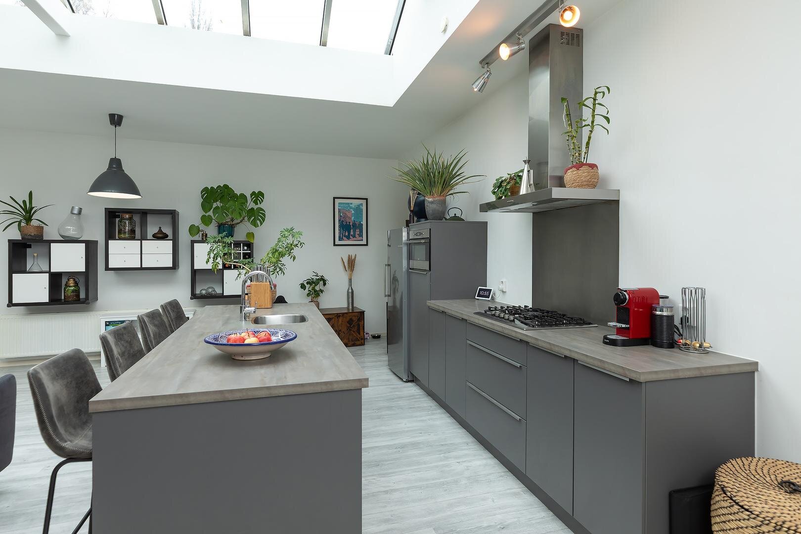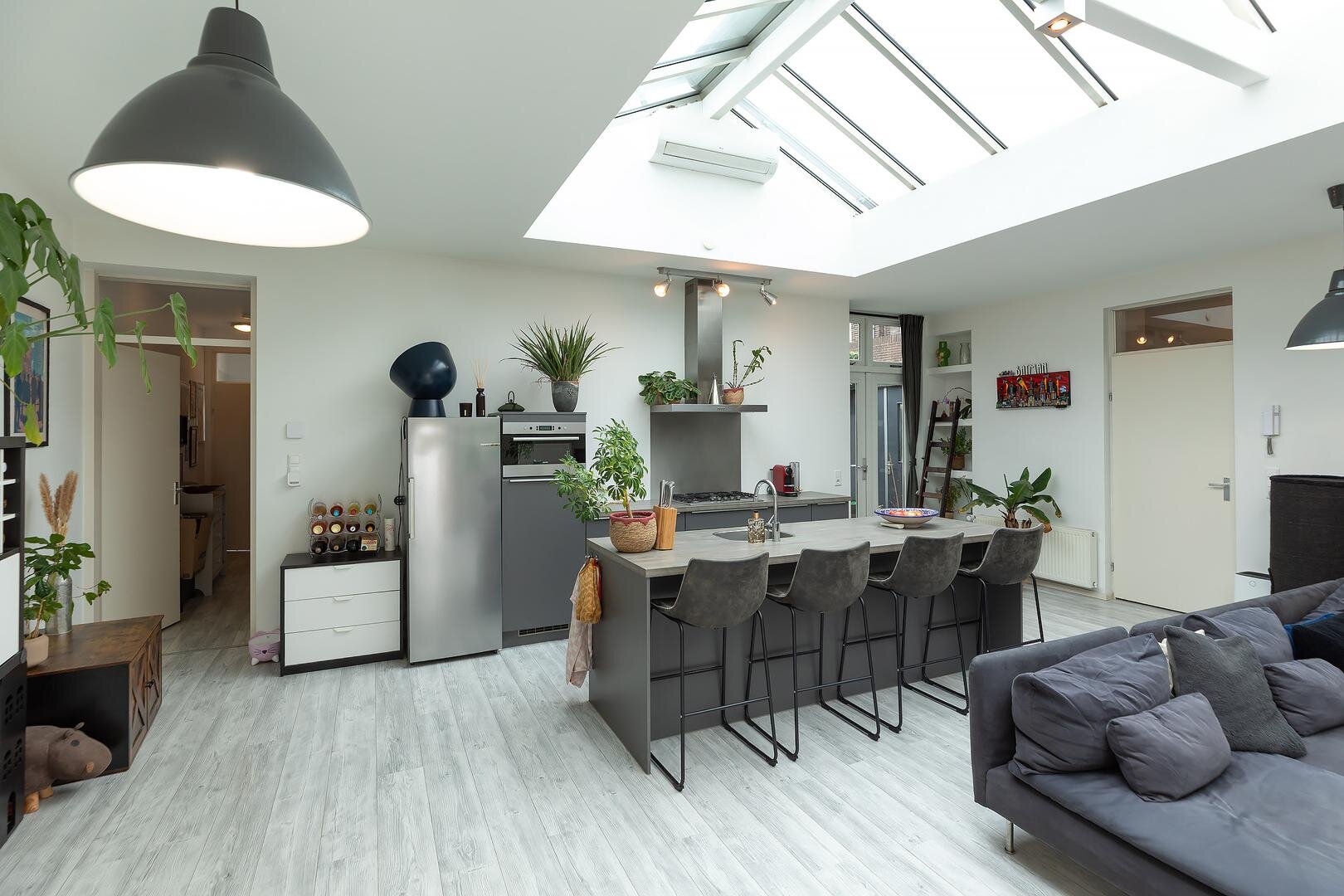 Entree, hal met meterkast, garderobe, separate wasruimte, toegang naar het souterrain, verrassend lichte woon-/eetkamer met open keuken en openslaande deuren naar de patiotuin. Door de giga lichtstraat is het altijd licht in het huis. Voor de warme dagen is er een automatisch zonnescherm en ook zelfs een airco unit. De open keuken is voorzien van diverse inbouwapparatuur en een gezellige bar om aan te eten of borrelen.