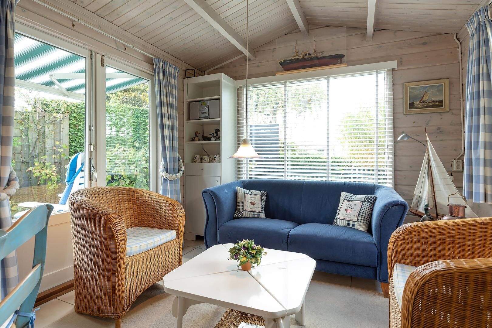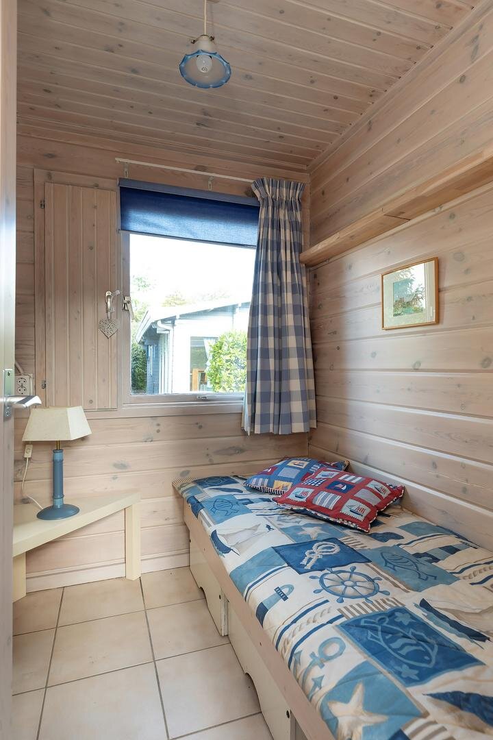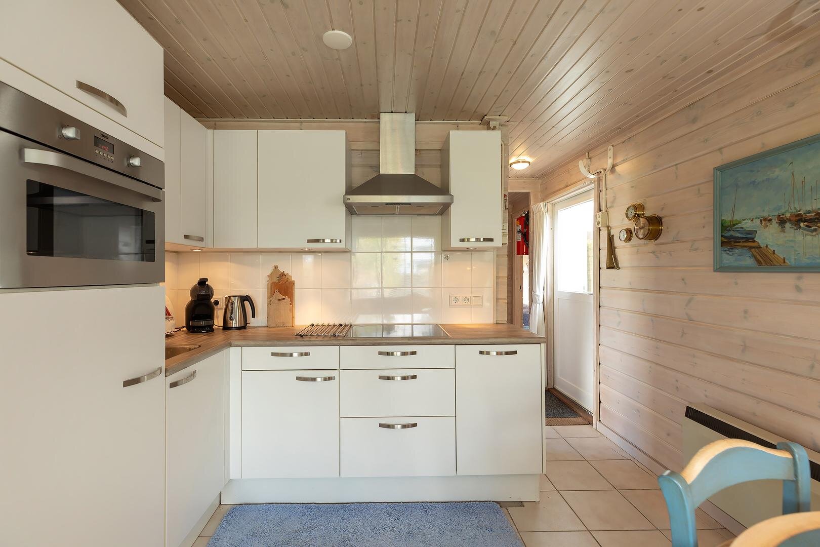 Via de entree kom je in de lichte, zonnige woonkamer met directe toegang tot het terras en de tuin. De open keuken is praktisch ingericht en voorzien van een kookplaat, afzuigkap, combi-oven, vaatwasser en koelkast. De woning beschikt over een slaapkamer met vast bed en kledingkast, een tweede slaapkamer eveneens met vaste kast, en een derde kamer met kinderbed — ideaal voor logees of (klein)kinderen. De badkamer is keurig en uitgerust met douche, toilet en wastafel.