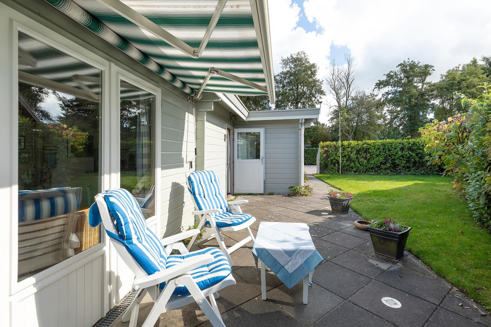 De zonnige tuin op het zuiden en het vrije terras bieden een heerlijke plek om te ontspannen of te genieten van lange zomerdagen. Dankzij het brede zonnescherm creëer je eenvoudig schaduw waar gewenst.