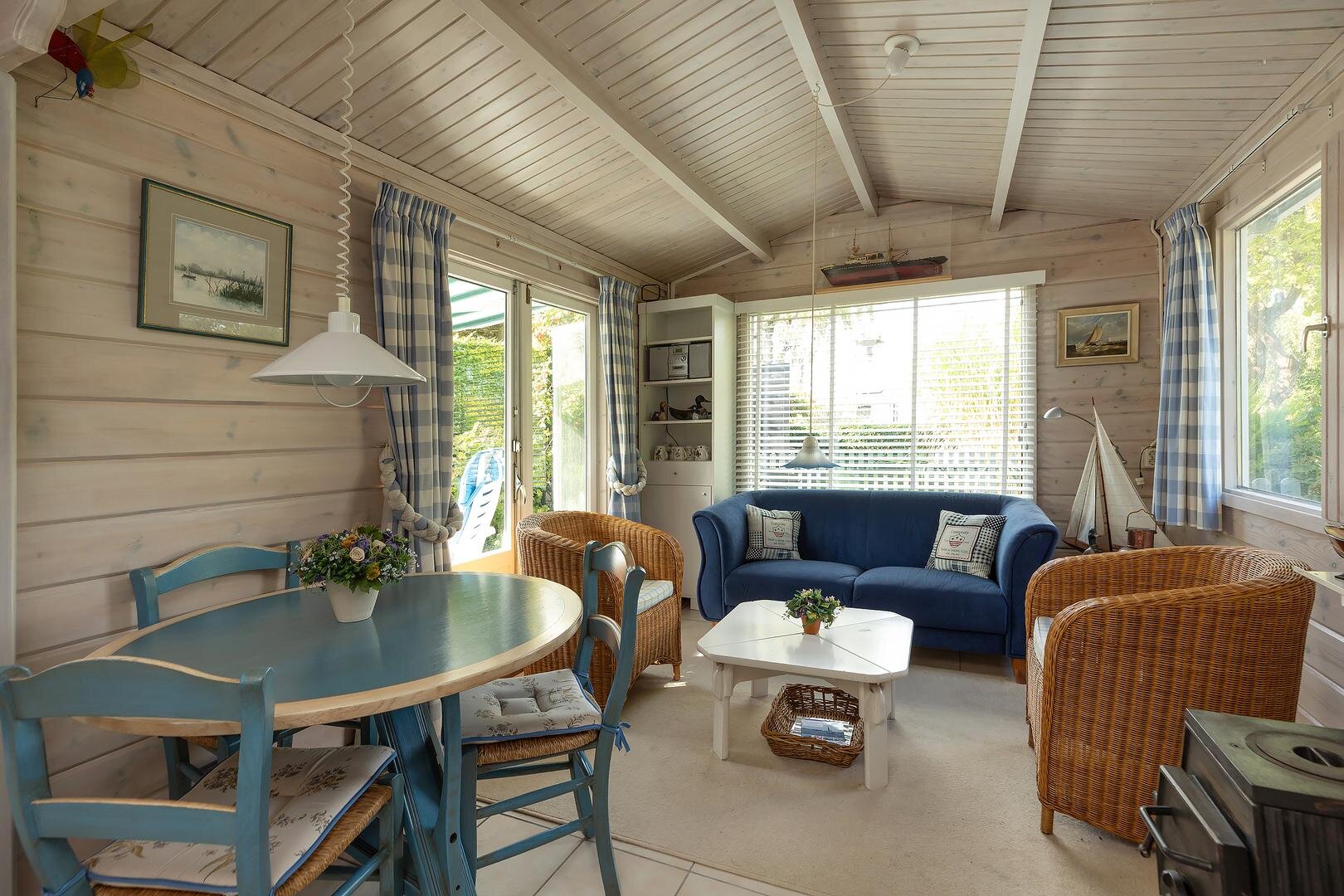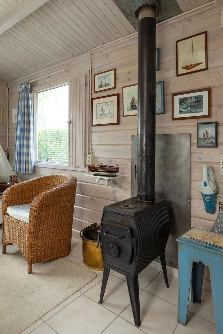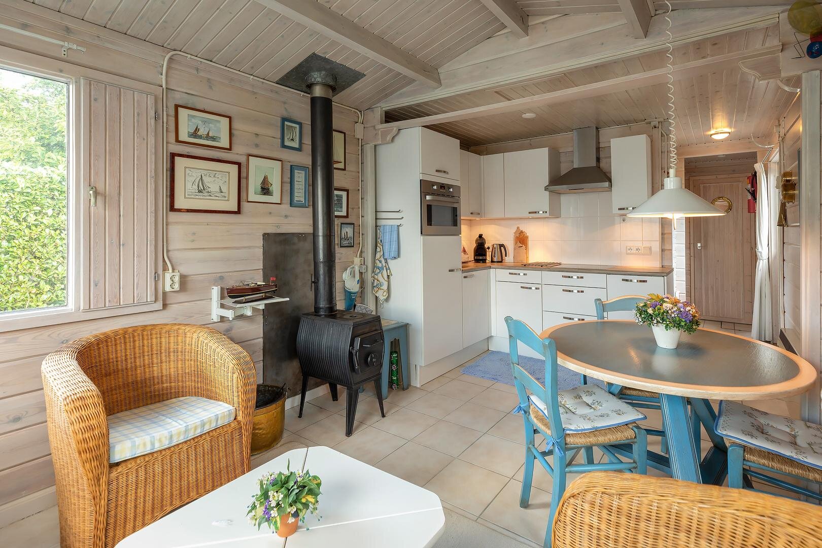 Verwarming vindt plaats via een gezellige potkachel en een elektrische wandkachel.