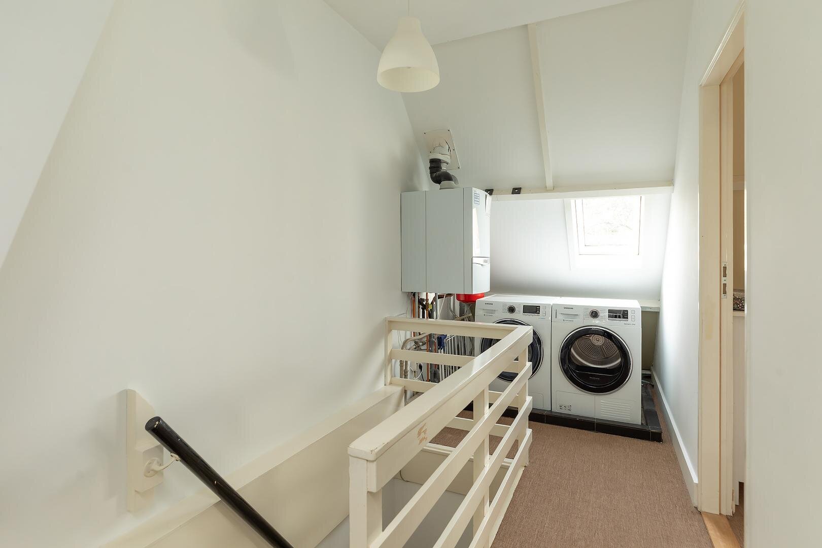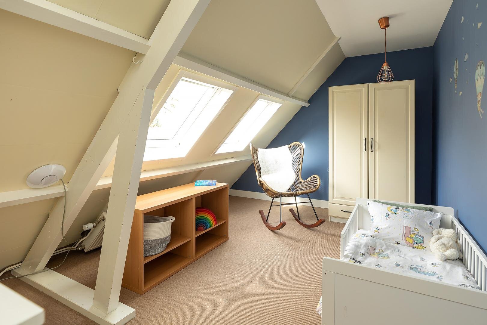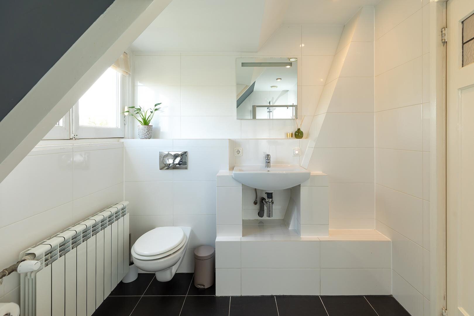 2e verdieping: overloop met dakraam, aansluiting wasapparatuur en opstelling c.v.-ketel, 2 goed bemeten slaapkamers, waarvan de kamer aan de achterzijde met dakkapel en de kamer aan de voorzijde met 2 dakramen. De 2e moderne badkamer met dakkapel is voorzien van ligbad, douche, wastafel en 3e toilet. Via vlizotrap bereikbare bergvliering.